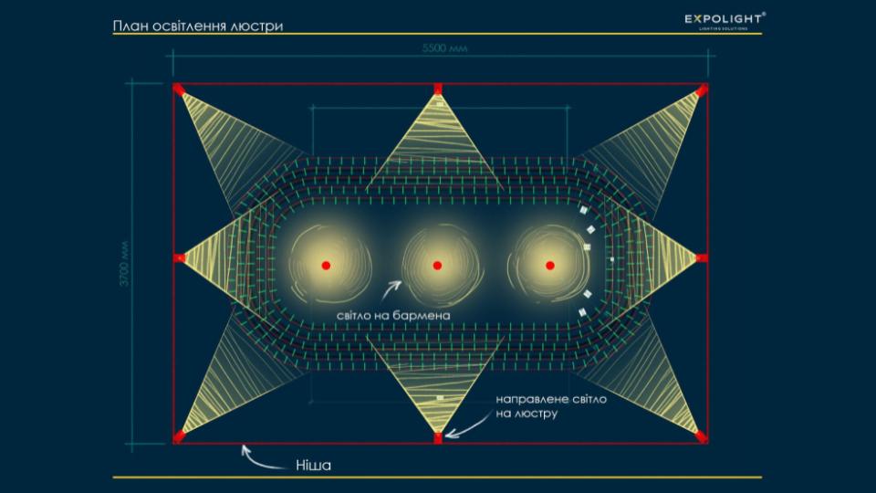 Зважаючи на те, що скляні елементи непрозорі довелося робити дуже специфічну підсвітку не зсередини, як ми всі звикли, а як скульптуру. Тобто підсвітлювали ззовні під різними кутами так, щоб не було видно бліків, використовуючи три типи оптик: супервузьку, яка дає такі теплі близькі спалахи, середнєкутову, яка проявляє об'єми, широку, яка зв'язує все в єдину картину.