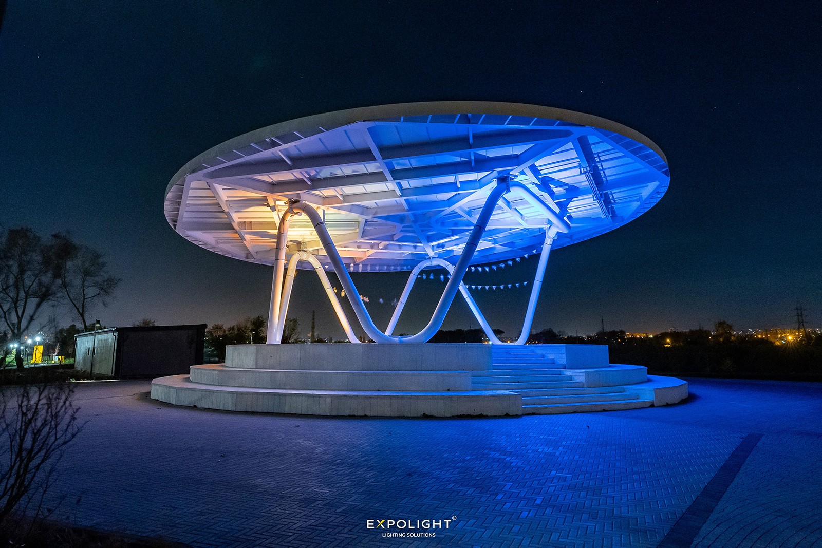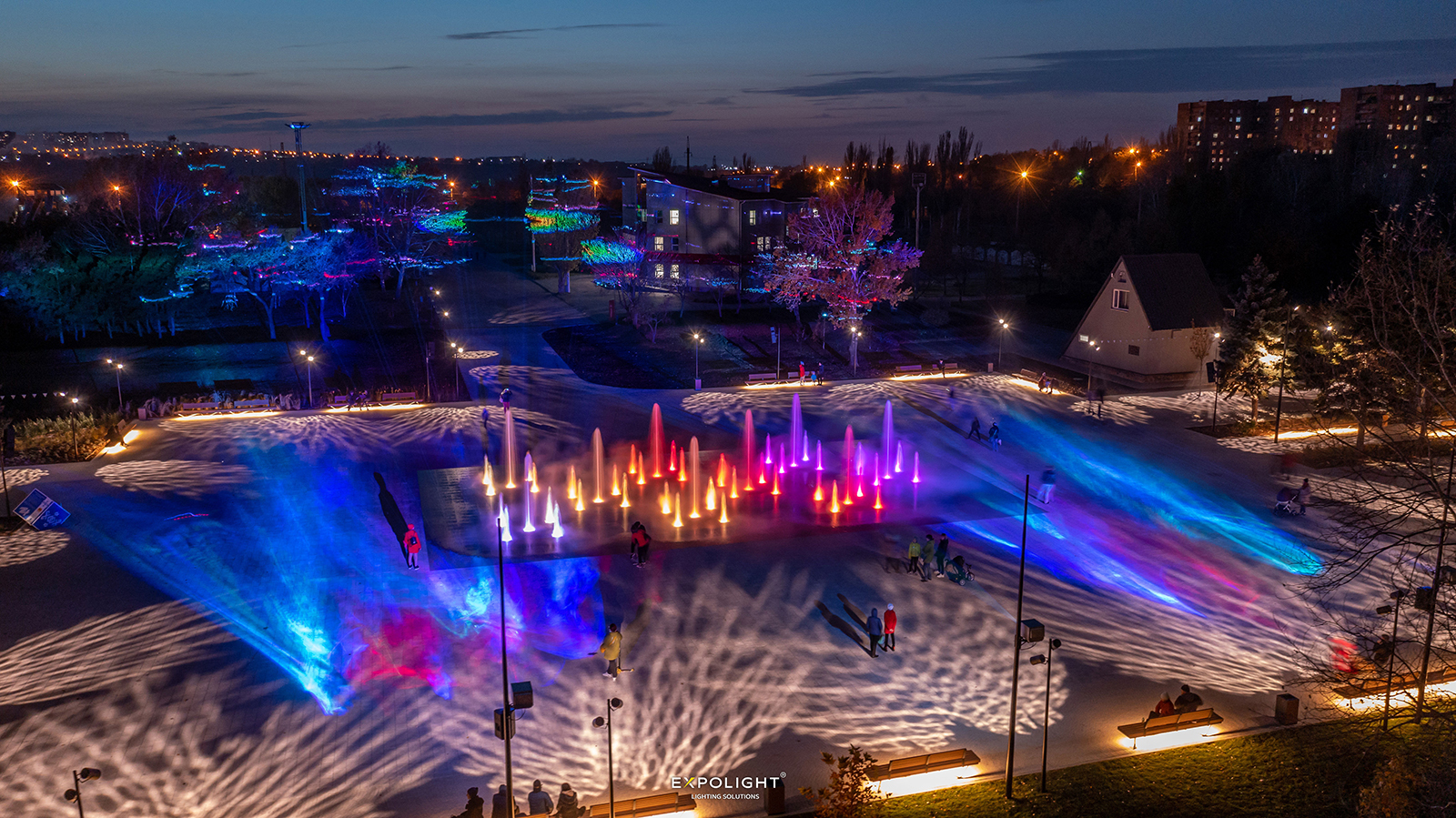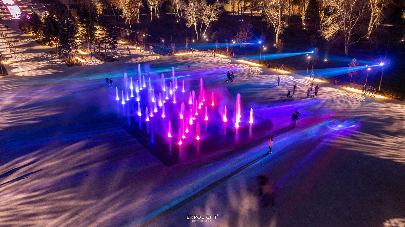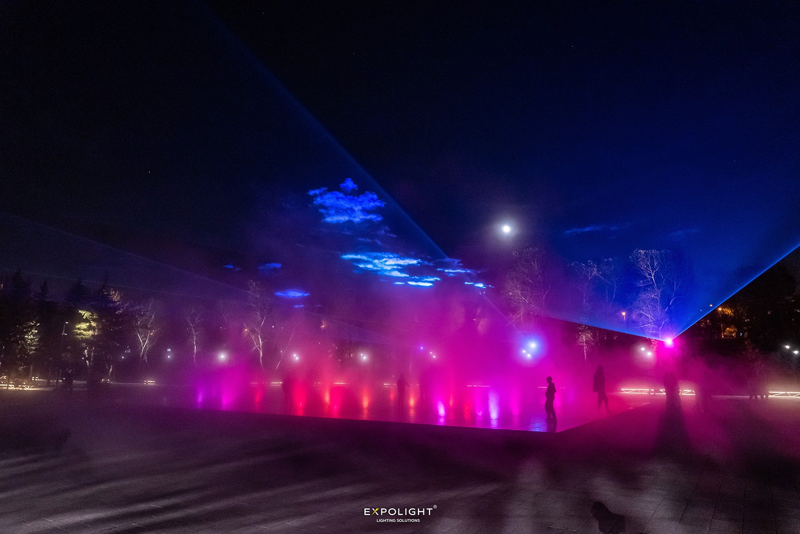 Також ми працювали над освітленням центрального фонтану. RGB світильники встановлюються в форсунки, з яких одночасно виходять і струмені води, і пара. Пара служить додатковим елементом для видовищного шоу, під час якого лазери, встановлені на опорах біля фонтану, пробивають пару динамічними горизонтальними променями і створюють ефект хмар і хвиль над головою.