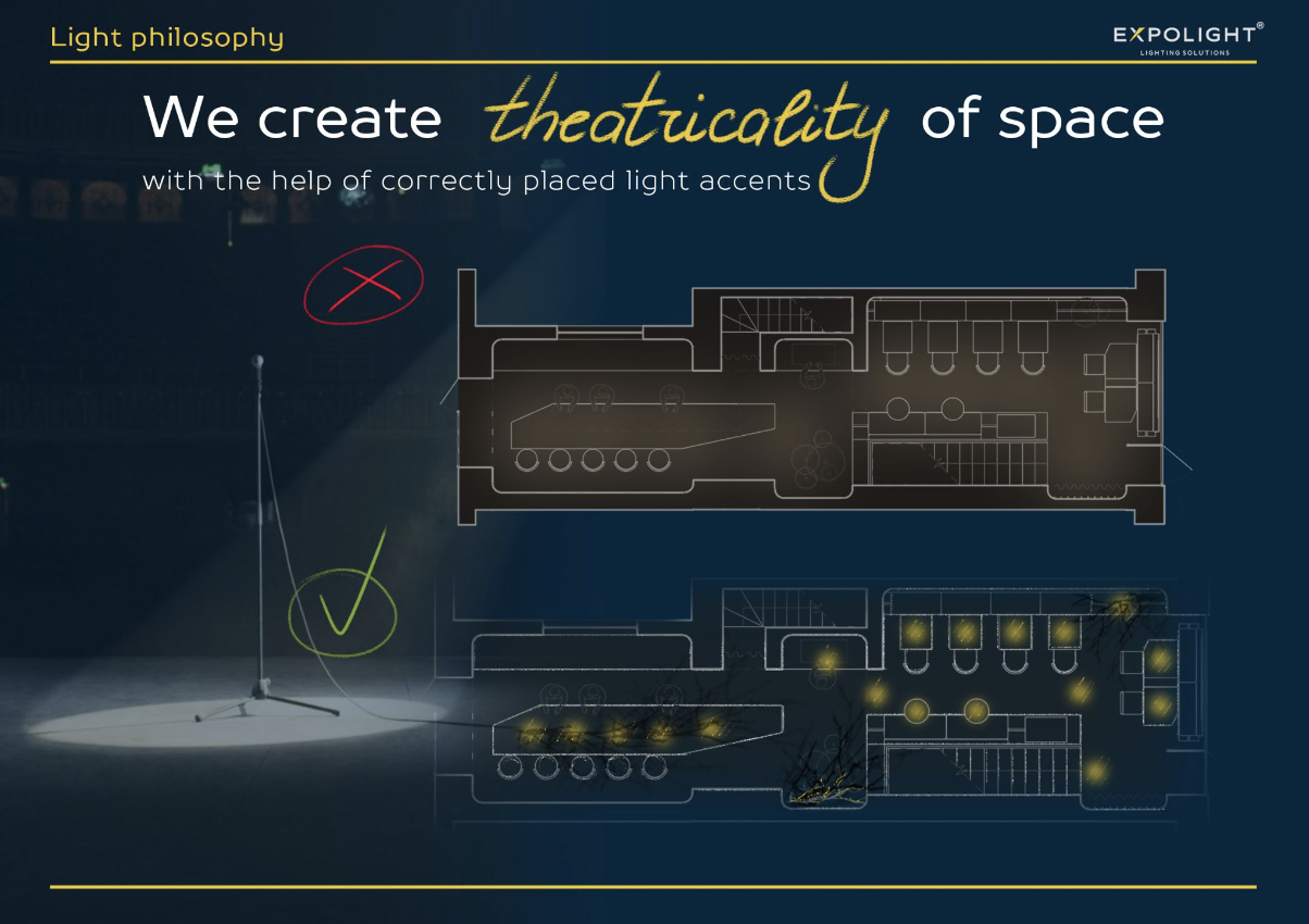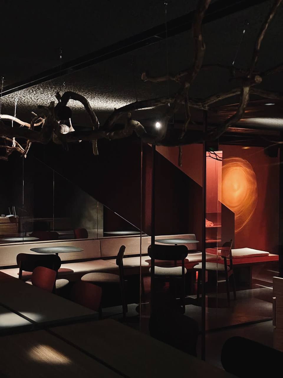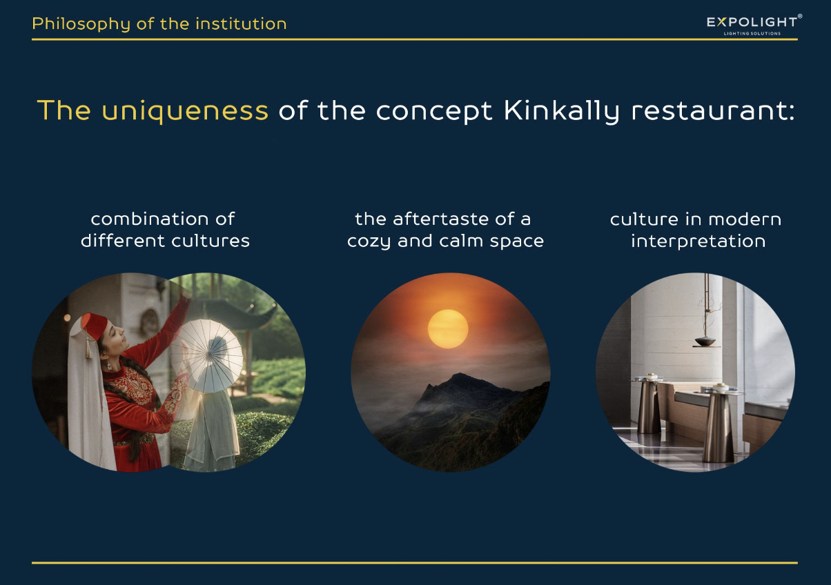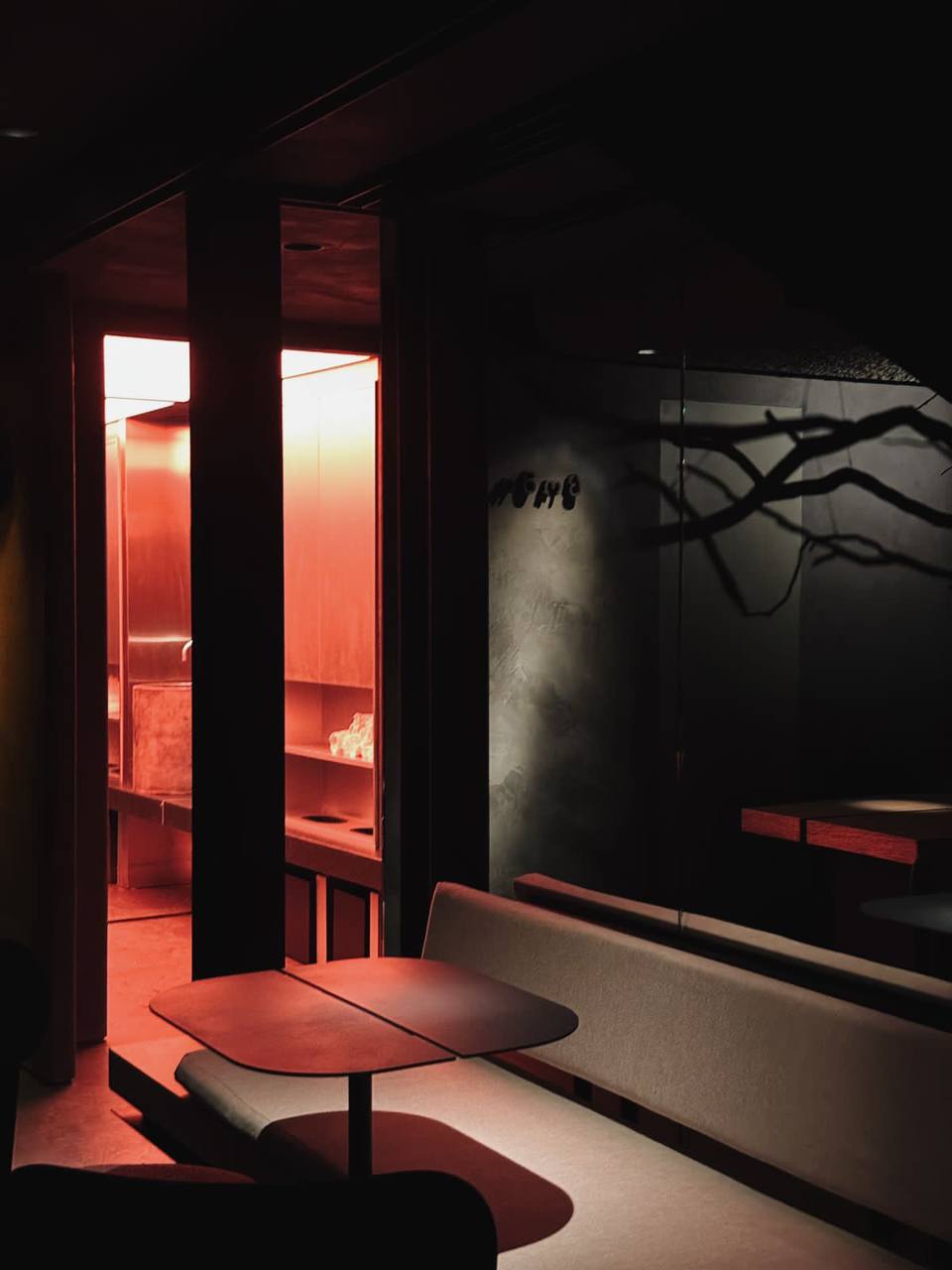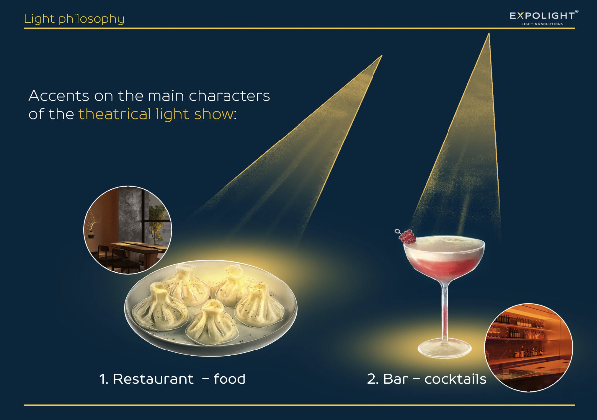 Цей заклад поєднує у собі елегантний ресторан та сучасний бар з коктейлями. Спеціально для цього проєкту ми розробили кастомні світильники Expolight Instruments з ефектом гало-каустики, патерн якого можна регулювати вручну, отримуючи унікальний візерунок на поверхні, що нагадує сонце за обрієм.