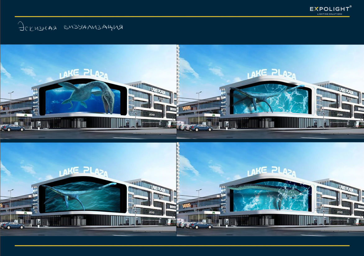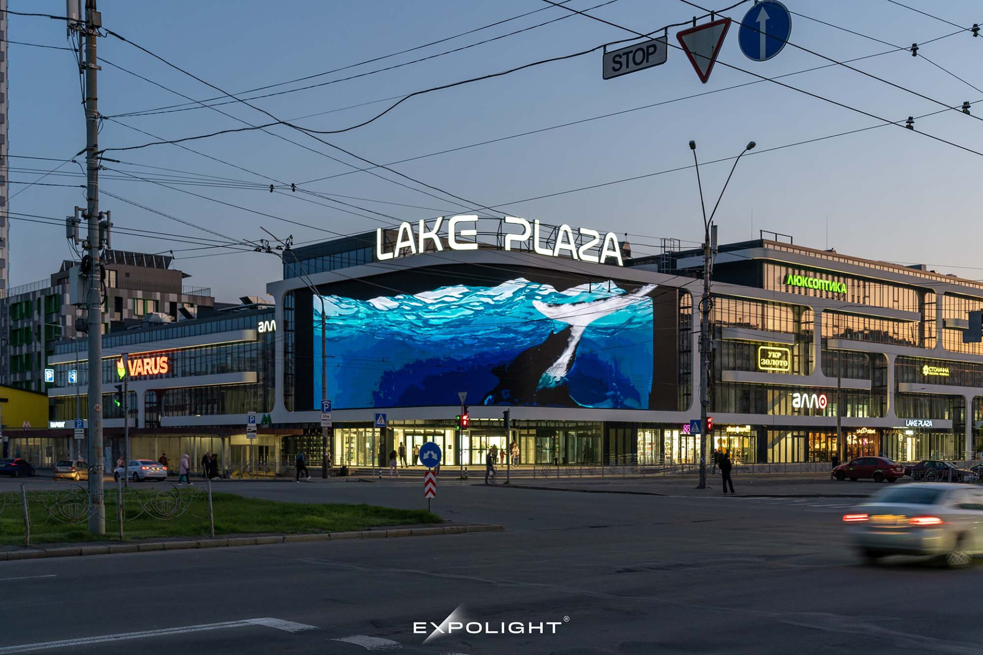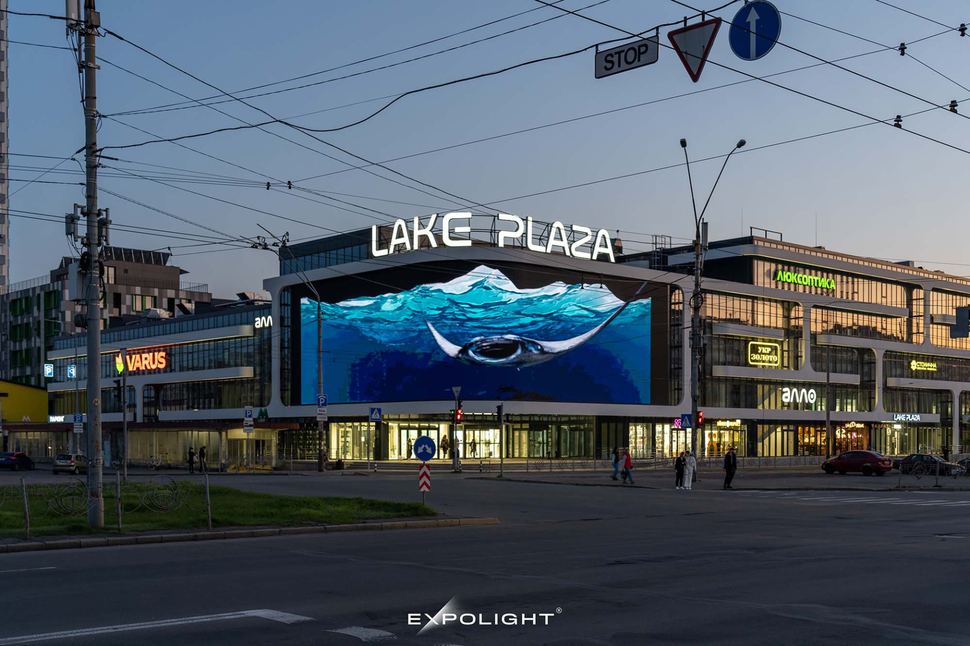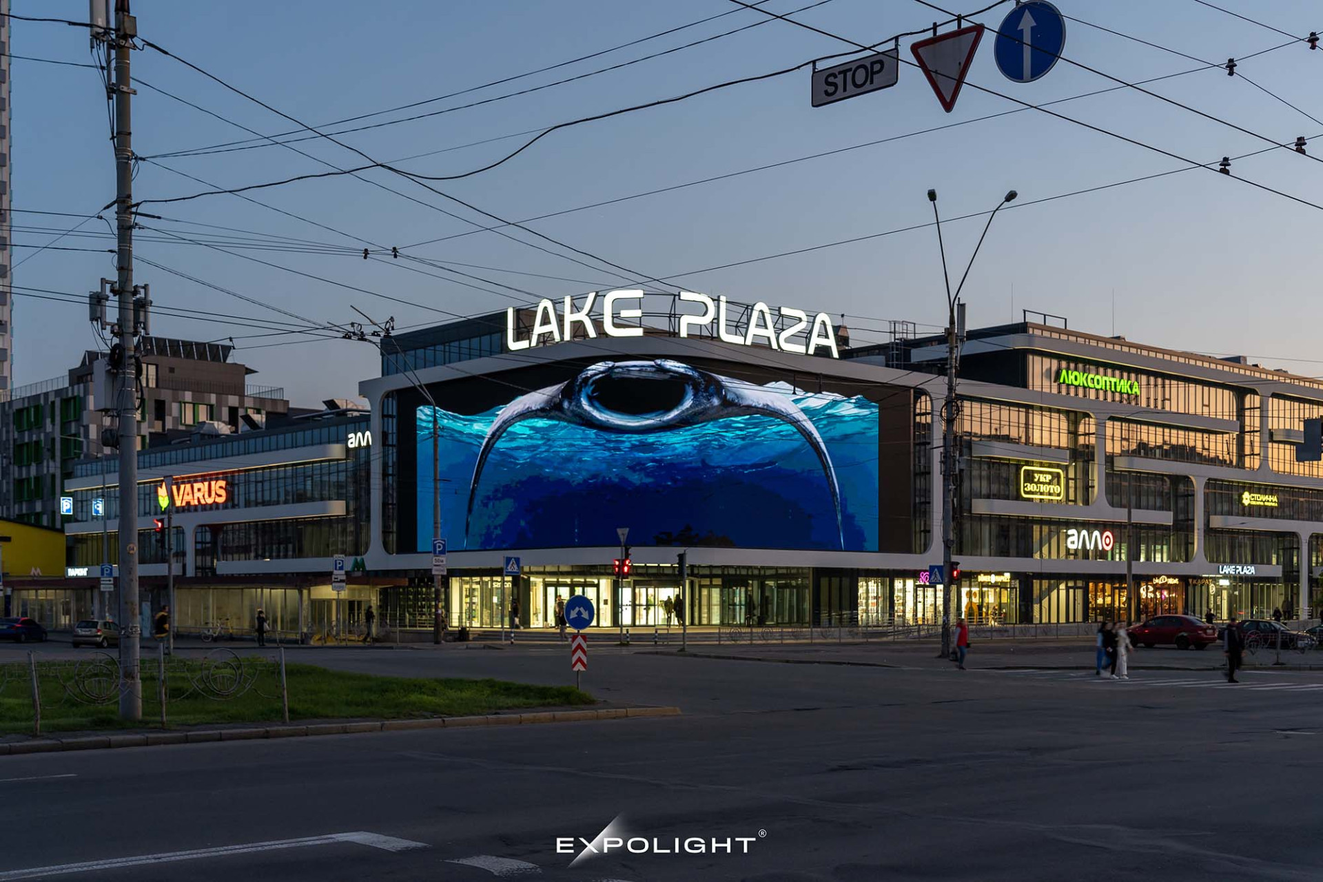 Слідуючи філософії торгівельного центру, ми розробили шоу, яке занурює киян та гостей міста у підводний світ. Нашою задачею було зробити його максимально реалістичним, наче на місці величезного екрану дійсно опинився акваріум з підводними жителями: величезним китом, блискучими рибками та потужним скатом.
