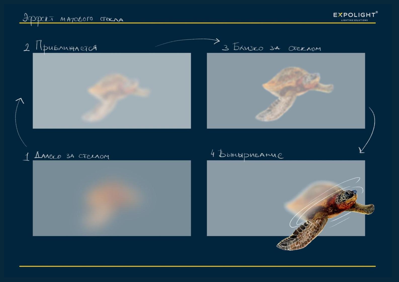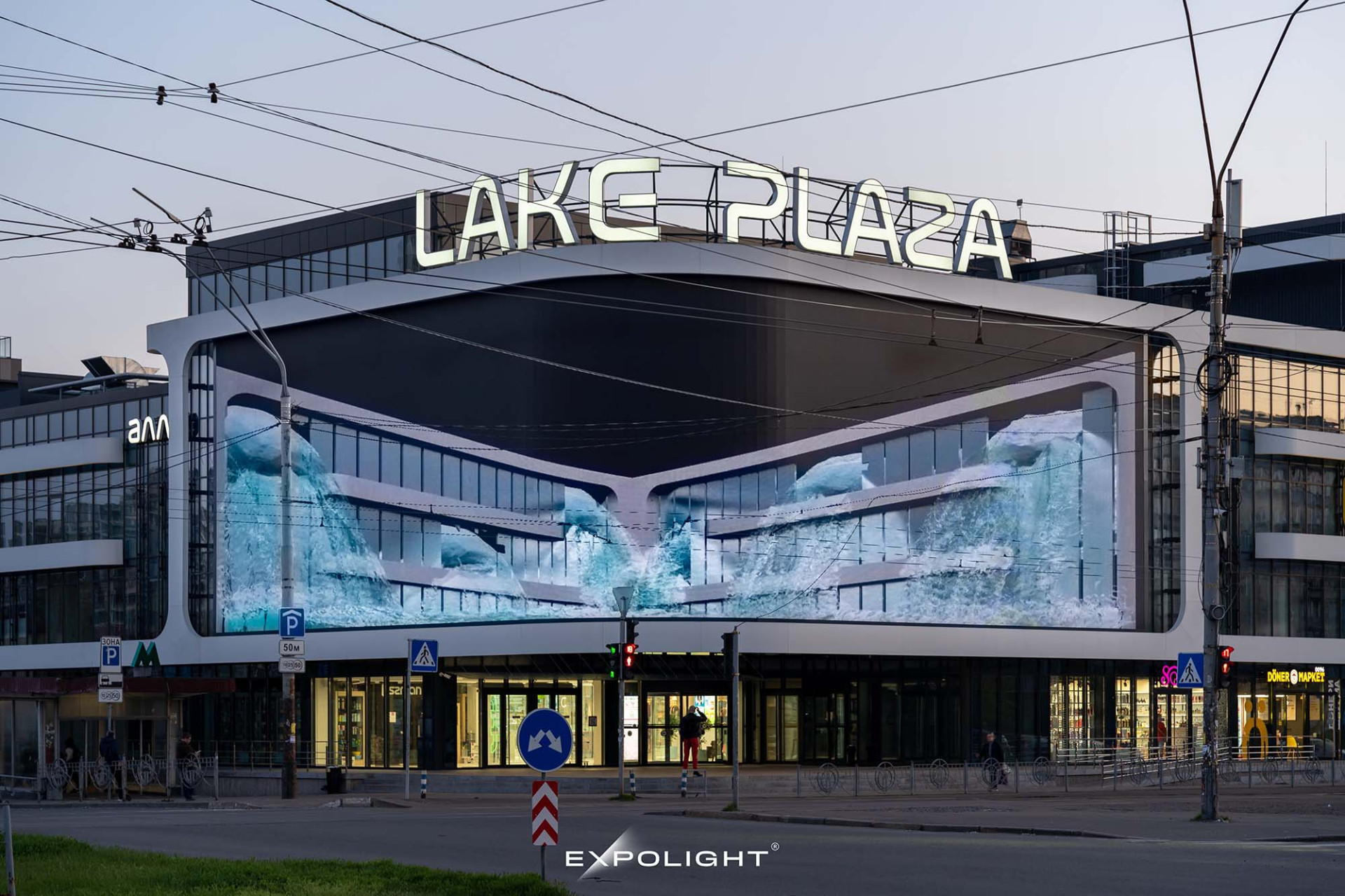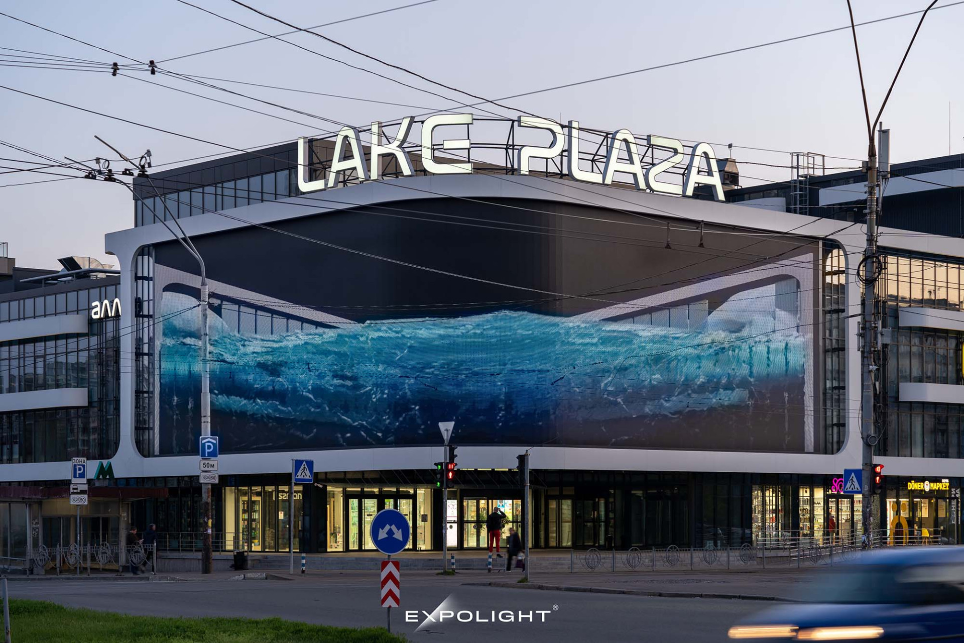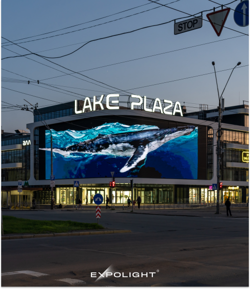 Слідуючи філософії торгівельного центру, ми розробили шоу, яке занурює киян та гостей міста у підводний світ. Нашою задачею було зробити його максимально реалістичним, наче на місці величезного екрану дійсно опинився акваріум з підводними жителями: величезним китом, блискучими рибками та потужним скатом.
