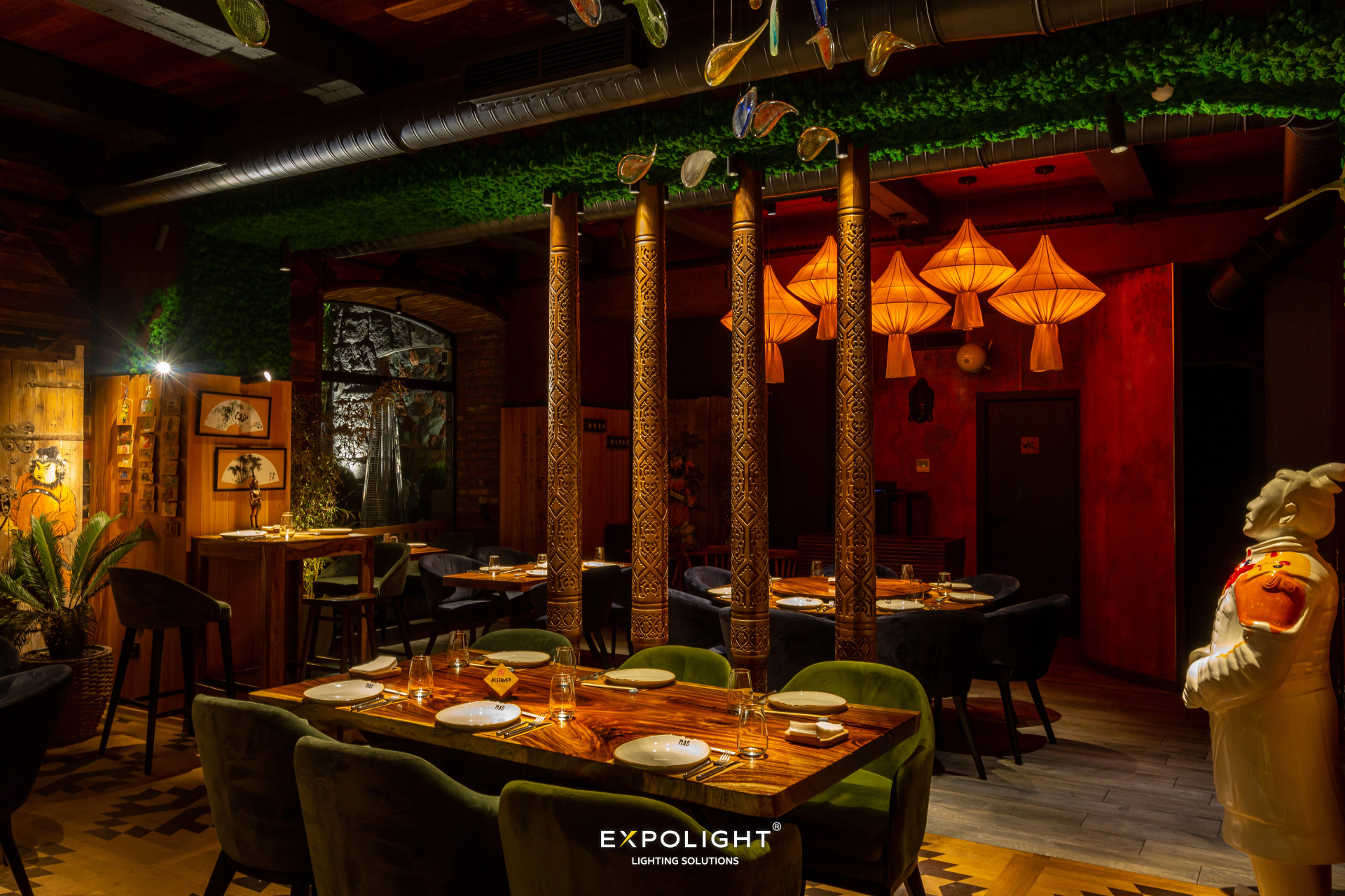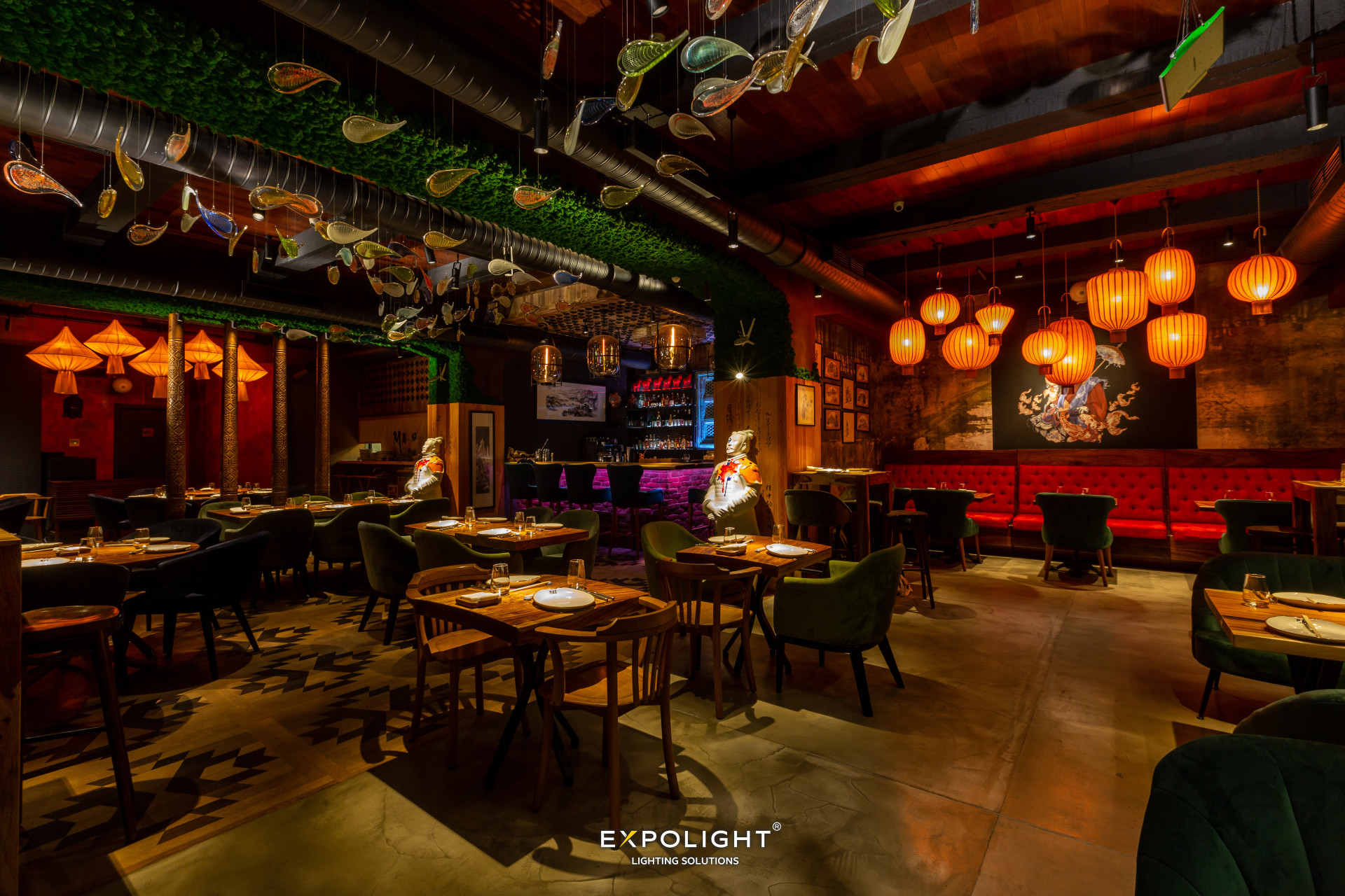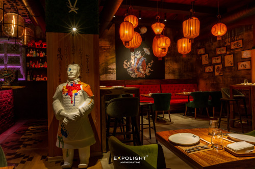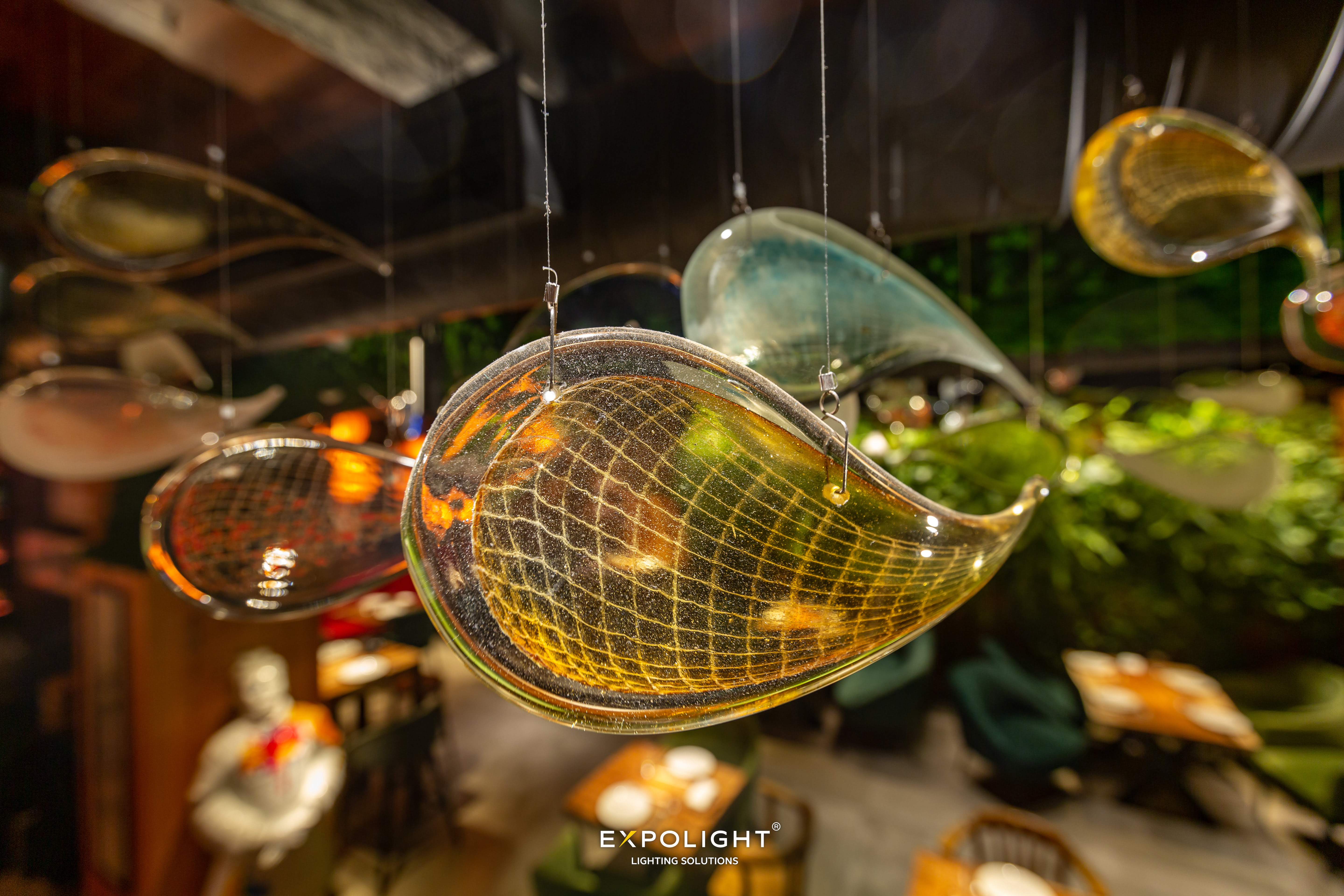 Люстра, яку ми створили у нашій склодувній майстерні для цього ресторану, нагадує образ декоративних рибок — парчевих коропів, які є дуже популярними у Східній Азії та ідеально пов'язуються з концепцією ресторану азіатської ф'южн кухні.