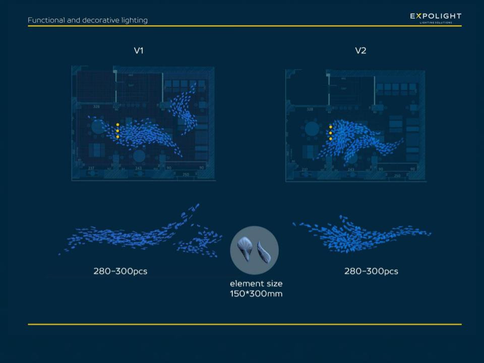 Створення люстр — це дуже тонка справа не тільки у плані роботи зі склом, але й у розрізі роботи зі світлом, адже щоб скляні елементи заграли максимально вдало, треба налаштувати оточуюче освітлення таким чином, щоб акцентно розкрити оптичні ефекти у склі. Кожен окремий скляний елемент люстри продуманий до деталей, наповнений індивідуальністю та унікальністю — з індивідуальними бульбашками, сіточками, кольором наповнення. Рибки були продумані прозорими, матовими та прозорими з матовими "хвостиками" — це все для того, щоб на невисокій стелі кожна по-унікальному грали зі світлом та наповнювали простір особливою атмосферою.