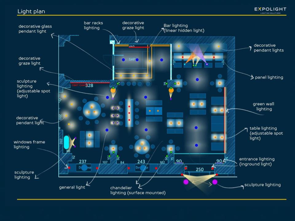Всю основну креативну роботу ми робимо дистанційно — продумуємо принципи та філософію освітлення; виготовляємо та відправляємо на монтування власні індивідуальні світильники. Вже після цього наша команда виїжджає на тиждень-два на дуже тонку та цікаву роботу — налаштування та юстування світильників, програмування сцен освітлення.