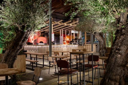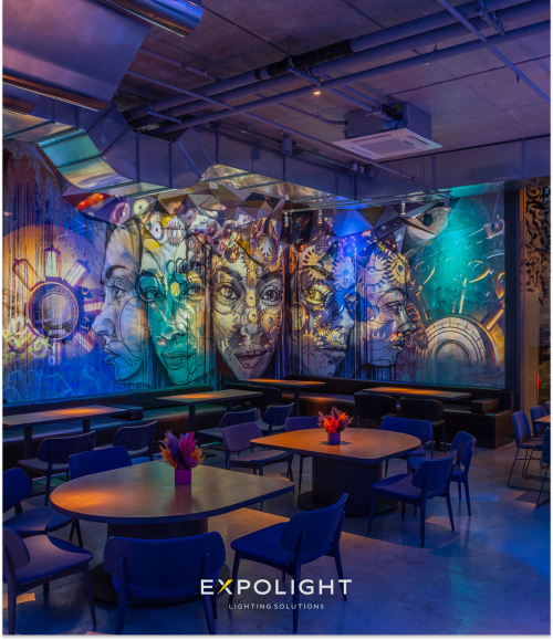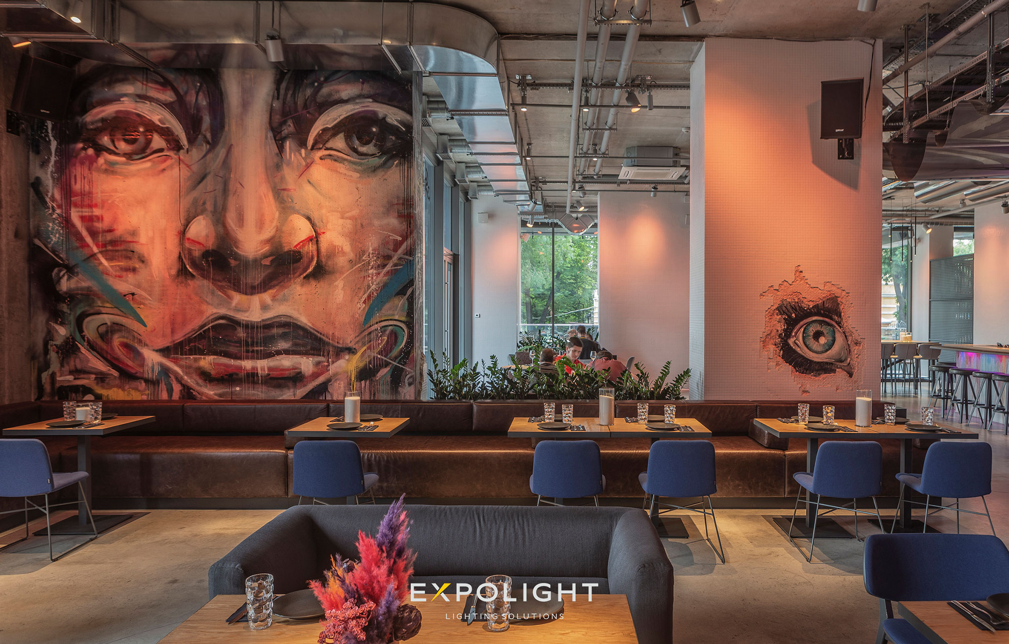 Денна сцена статична і в нейтральних кольорах, домінує світло, що заливає. Увечері з'являється кольородинаміка холодного синього спектру, акценти контрастне світло над столами, вночі - кольородинаміка у червоних тонах та 3D-mapping на графіті.