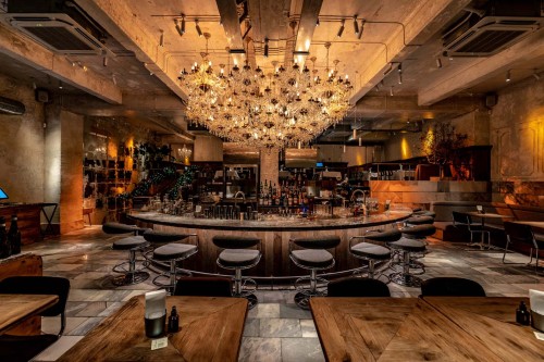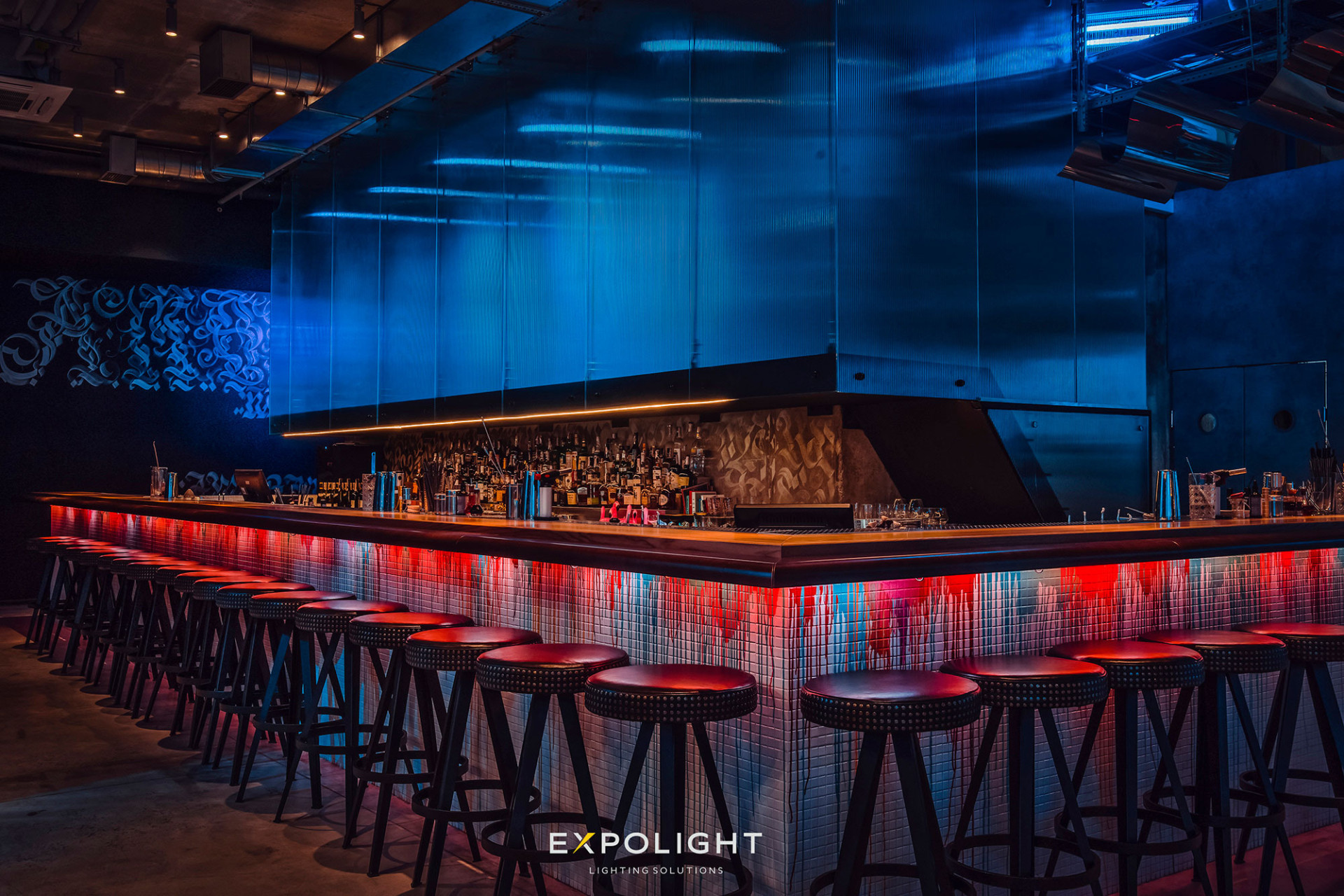 У залі ресторану знаходиться сцена, освітлення якої змінює гаму, а також динаміку підсвічування залежно від сценарію роботи закладу. Барна стійка підсвічена хвилями, що рухаються, також змінюючи гаму від більш спокійної вдень до активної ввечері.