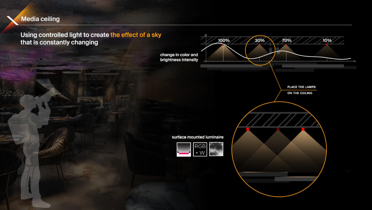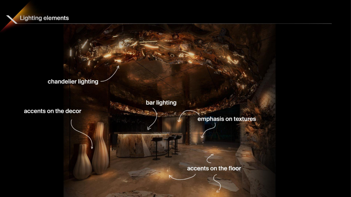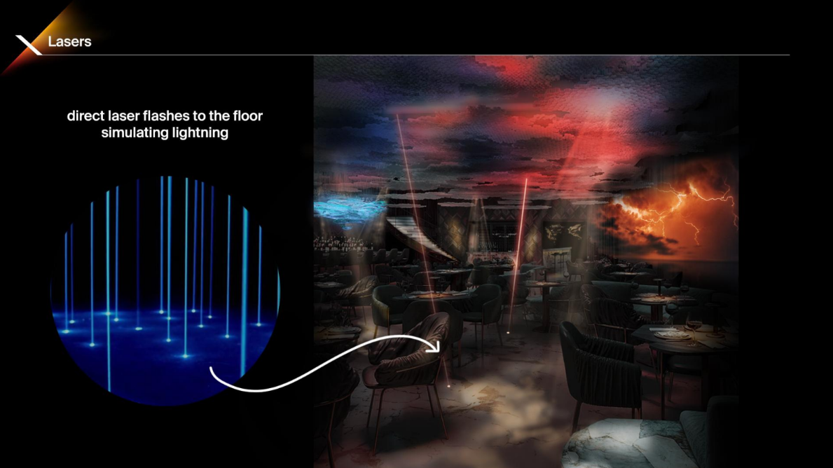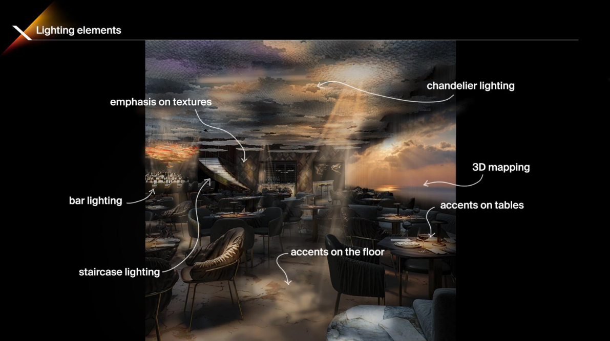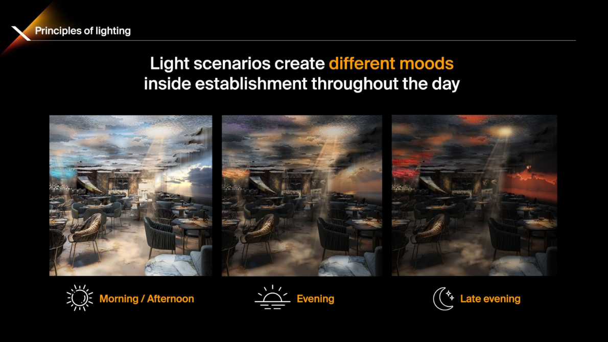 Головна особливість Pixi – це його здатність повністю трансформуватися протягом доби завдяки біодинамічним світловим сценаріям. Вдень ресторан випромінює спокій і світло, створюючи ідеальну атмосферу для бізнес-ланчів і ділових зустрічей. Ввечері ж Pixi перетворюється на затишний ресторан з приглушеним світлом та медіа арт інсталяціями на природну тематику. Пізніше ввечері Pixi стає клубом з особливою атмосферою.
