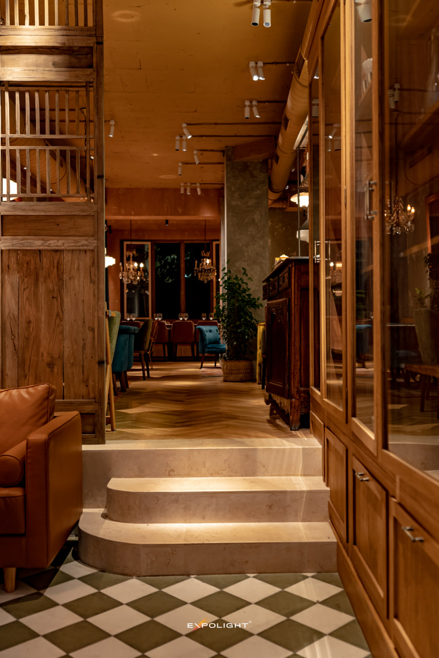 Дизайн інтер'єру Renee багатий на текстурні та антикваріатні елементи. Ми любимо працювати з такими елементами, адже вони завжди унікальні, і світлом можна дуже круто підкреслити та підсилити рельєфність та тактильність матеріалів.