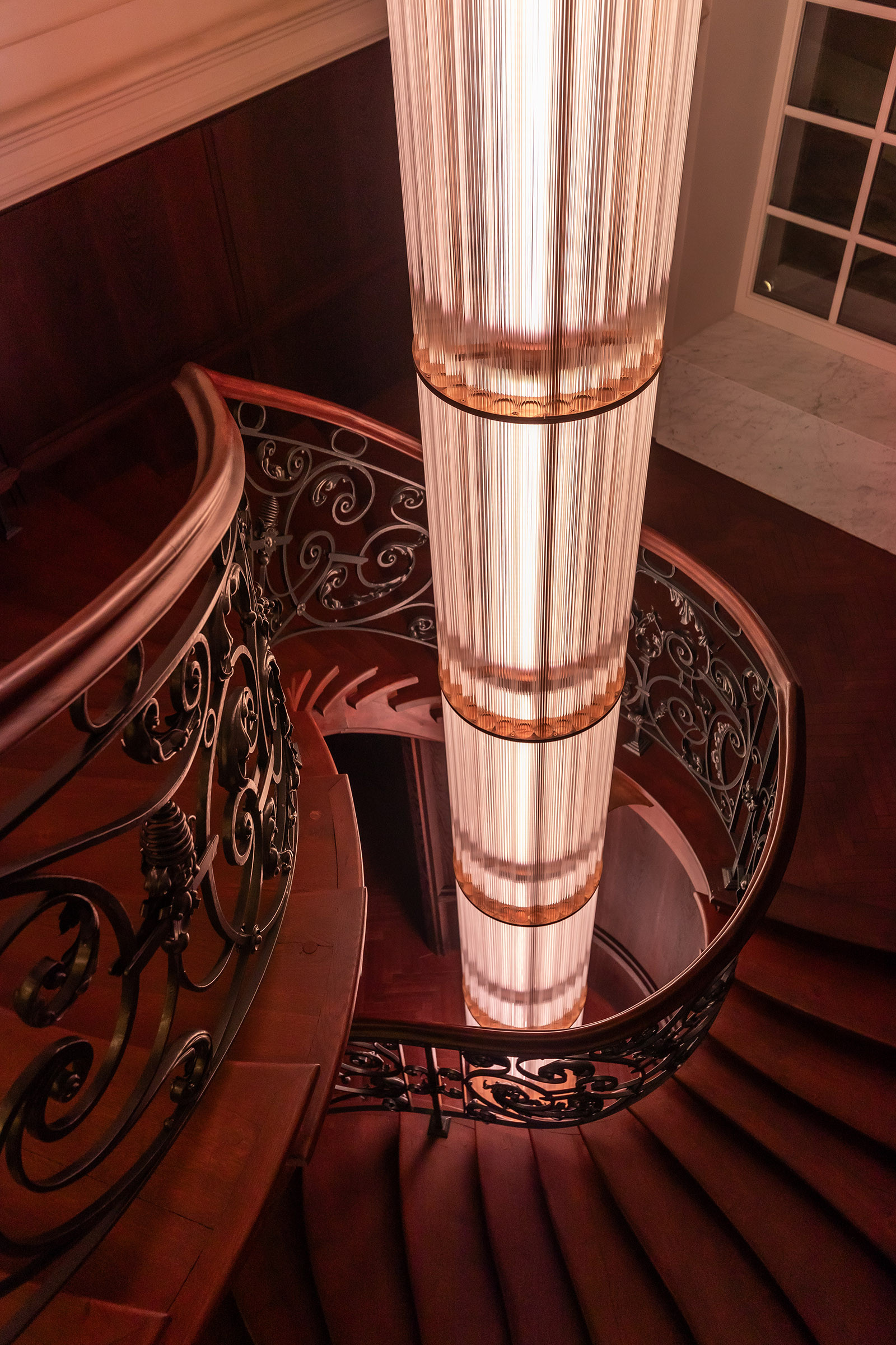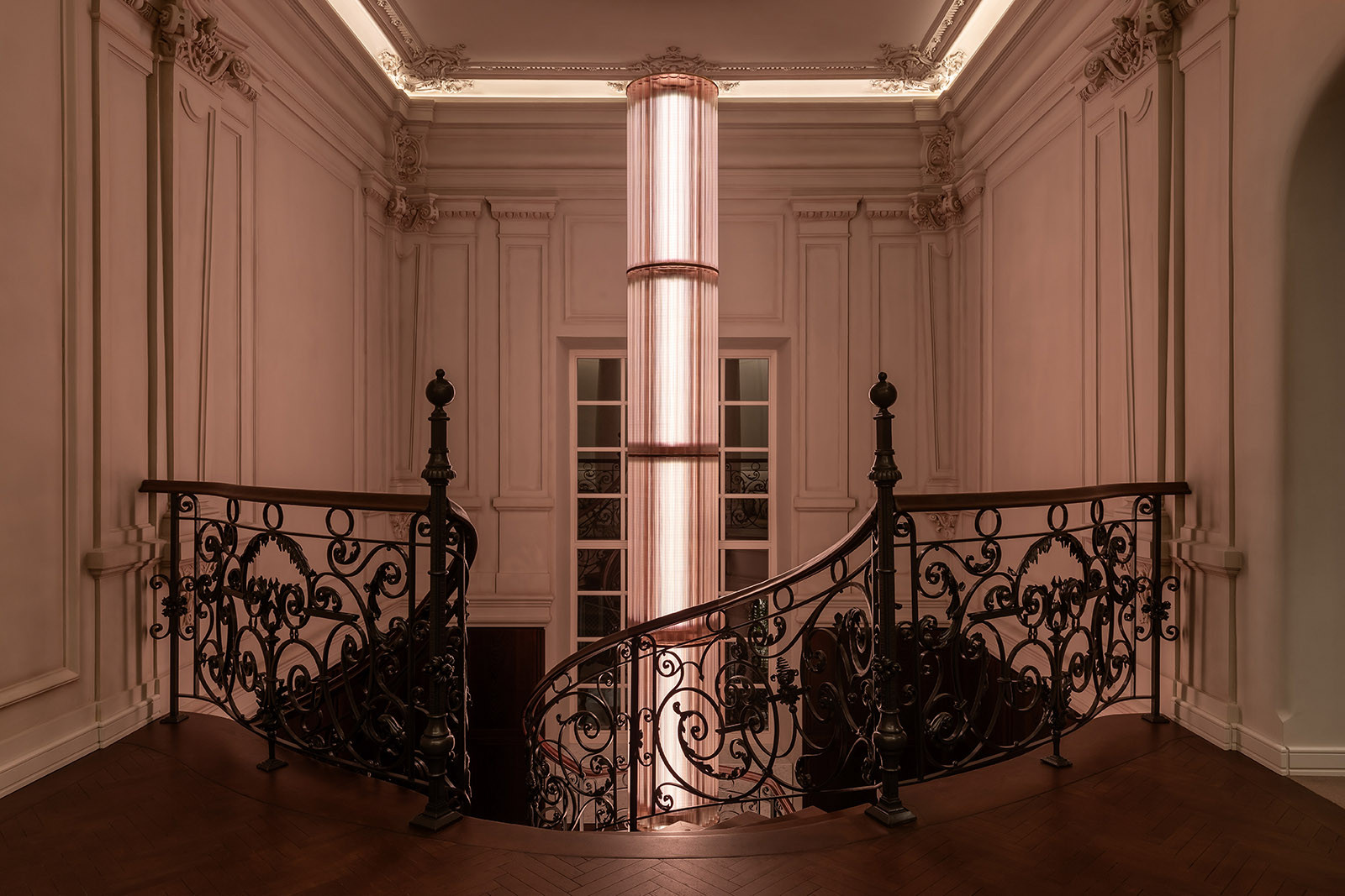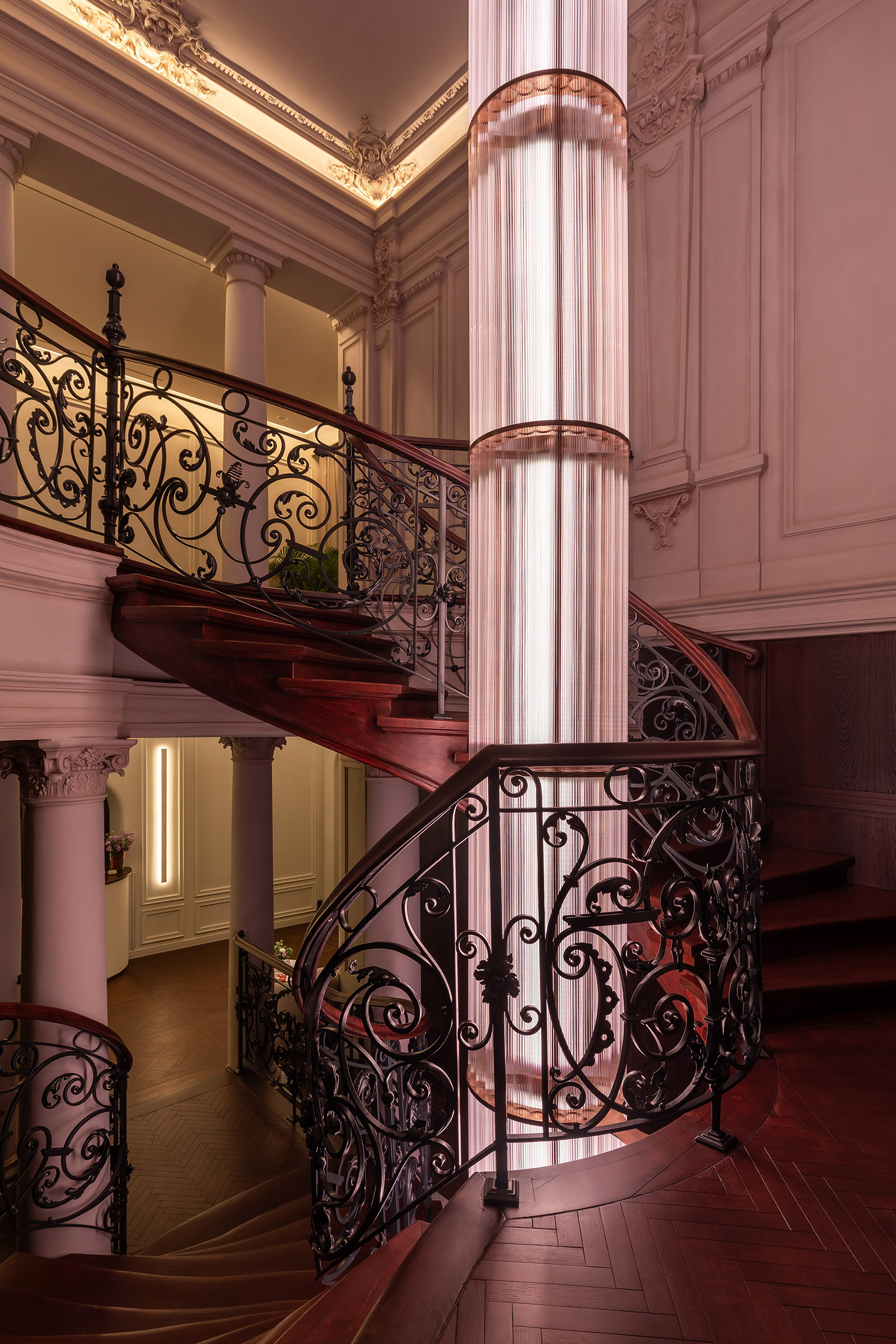 Ця кастомна світлова колона стала центральним акцентом інтер’єру — витонченим світловим ядром, що поєднує класику та сучасне мистецтво. Завдяки внутрішньому освітленню та різним сценаріям вона змінюється протягом дня, а її багатошарова текстура та тонкі нитки нагадують світловий водоспад, який м’яко огортає простір.