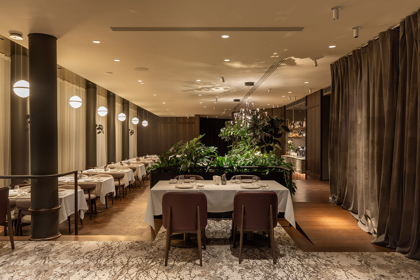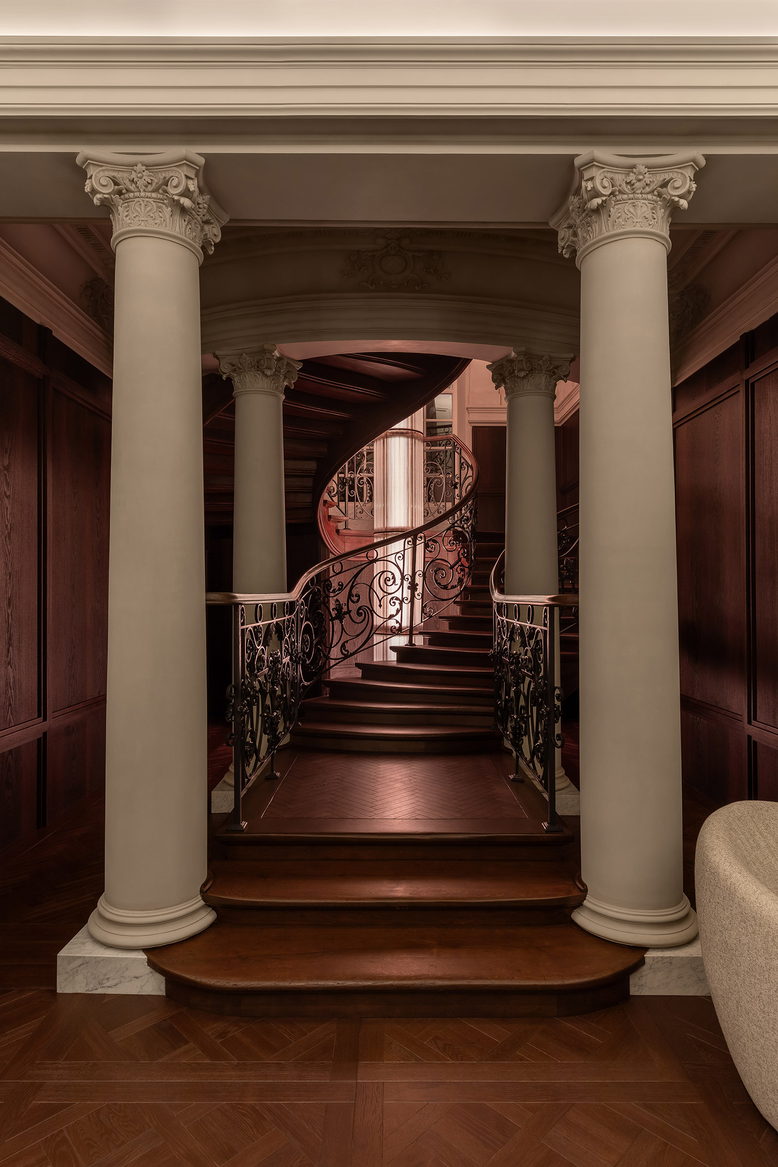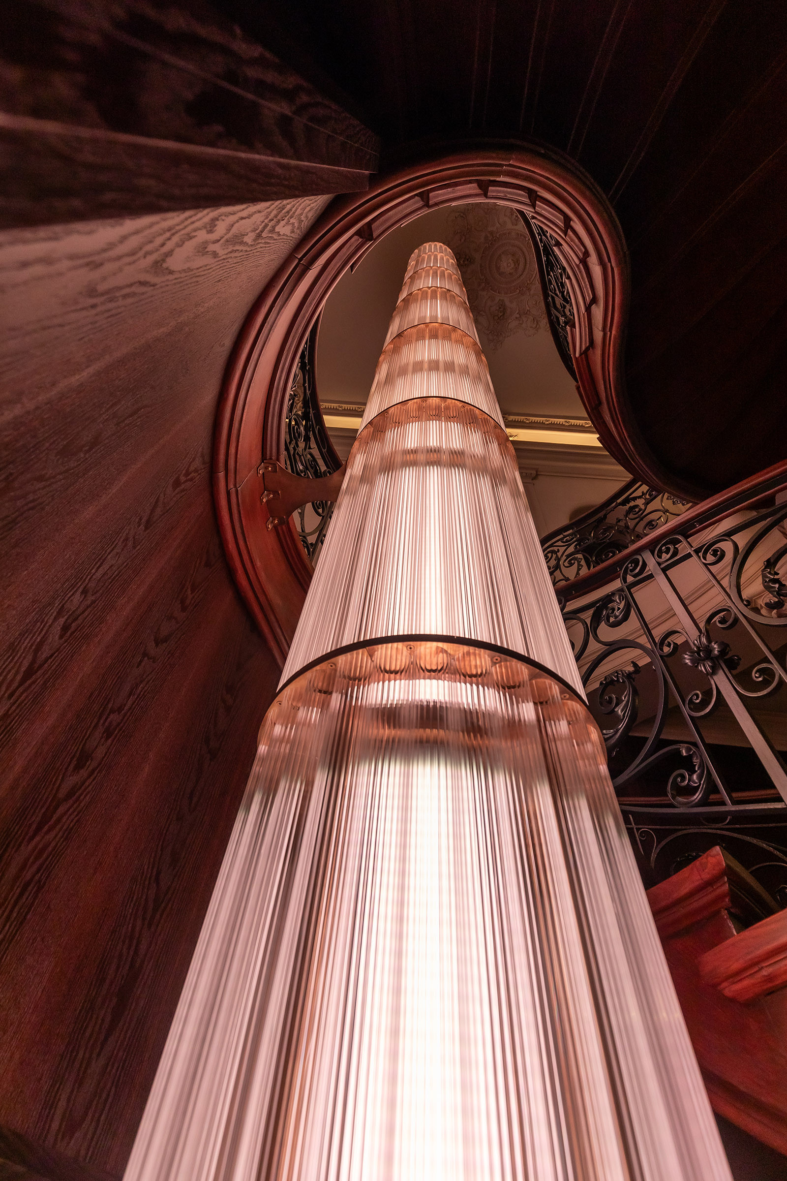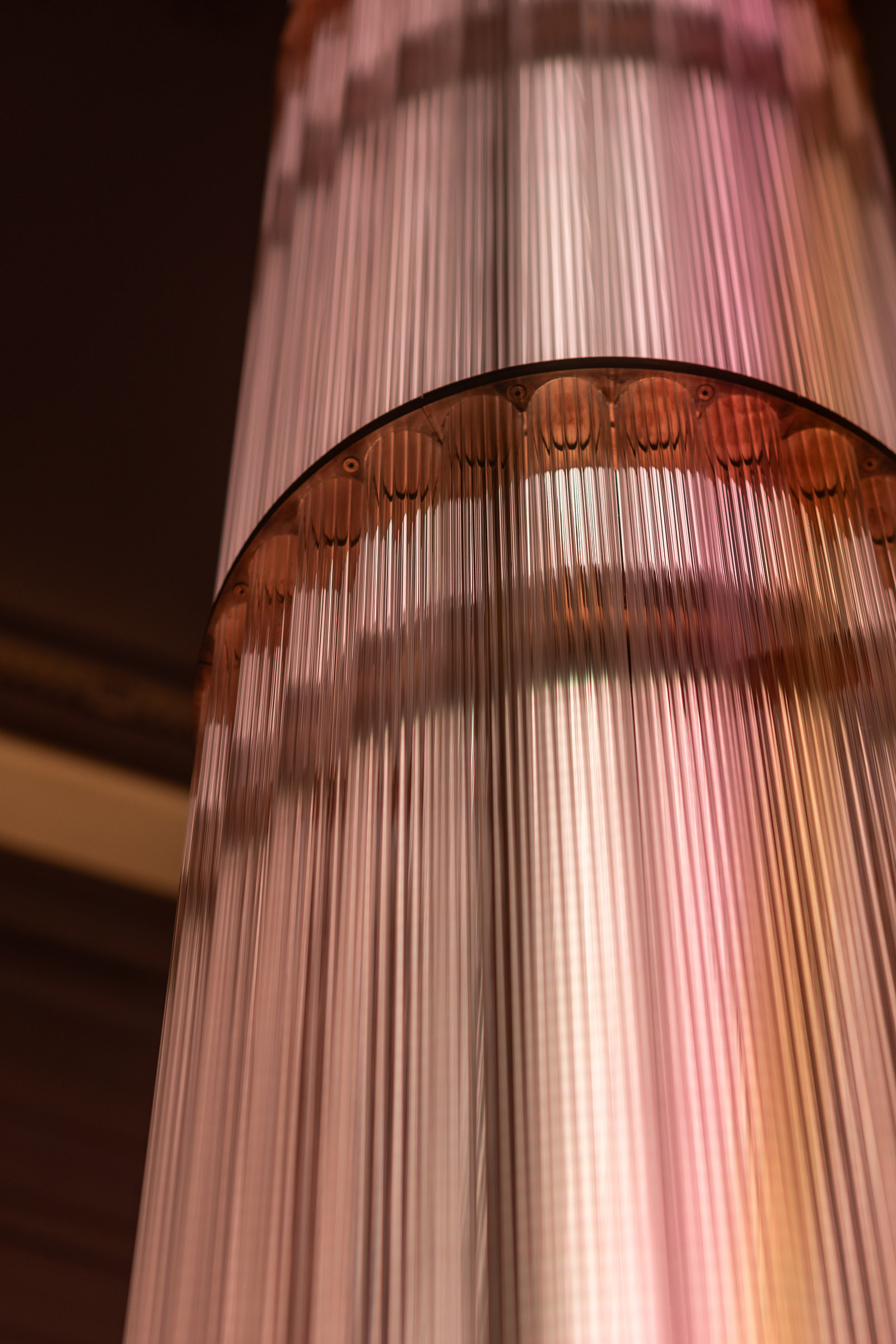 Ця кастомна світлова колона стала центральним акцентом інтер’єру — витонченим світловим ядром, що поєднує класику та сучасне мистецтво. Завдяки внутрішньому освітленню та різним сценаріям вона змінюється протягом дня, а її багатошарова текстура та тонкі нитки нагадують світловий водоспад, який м’яко огортає простір.