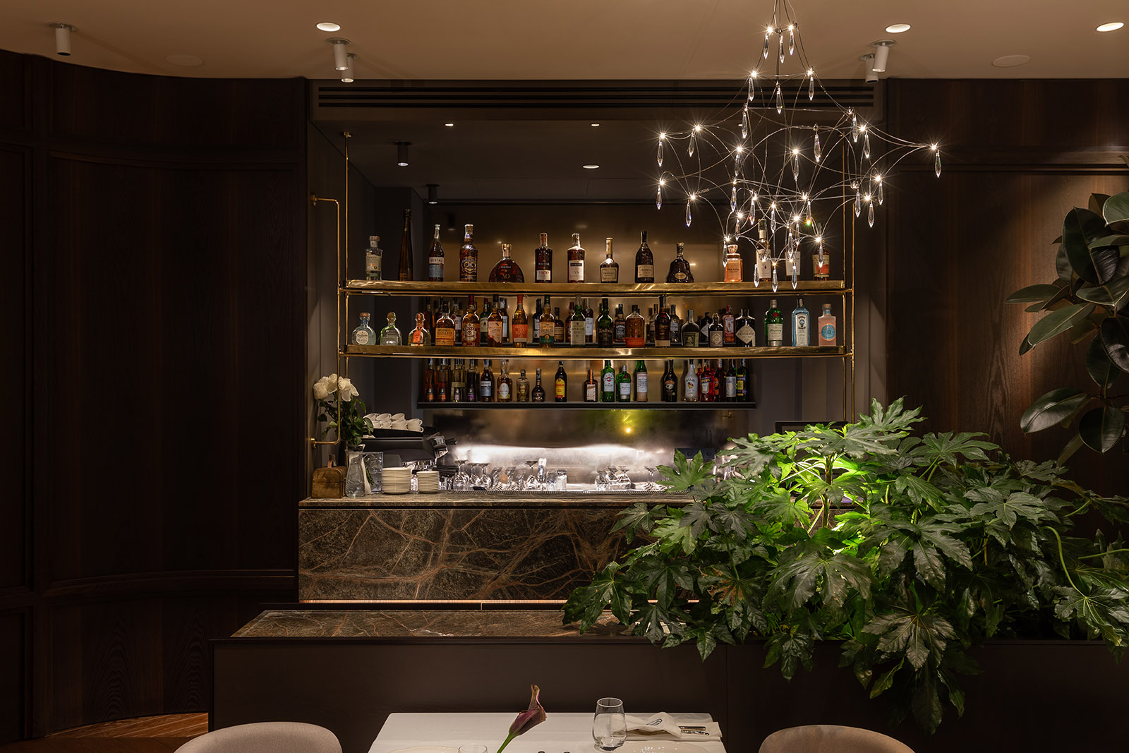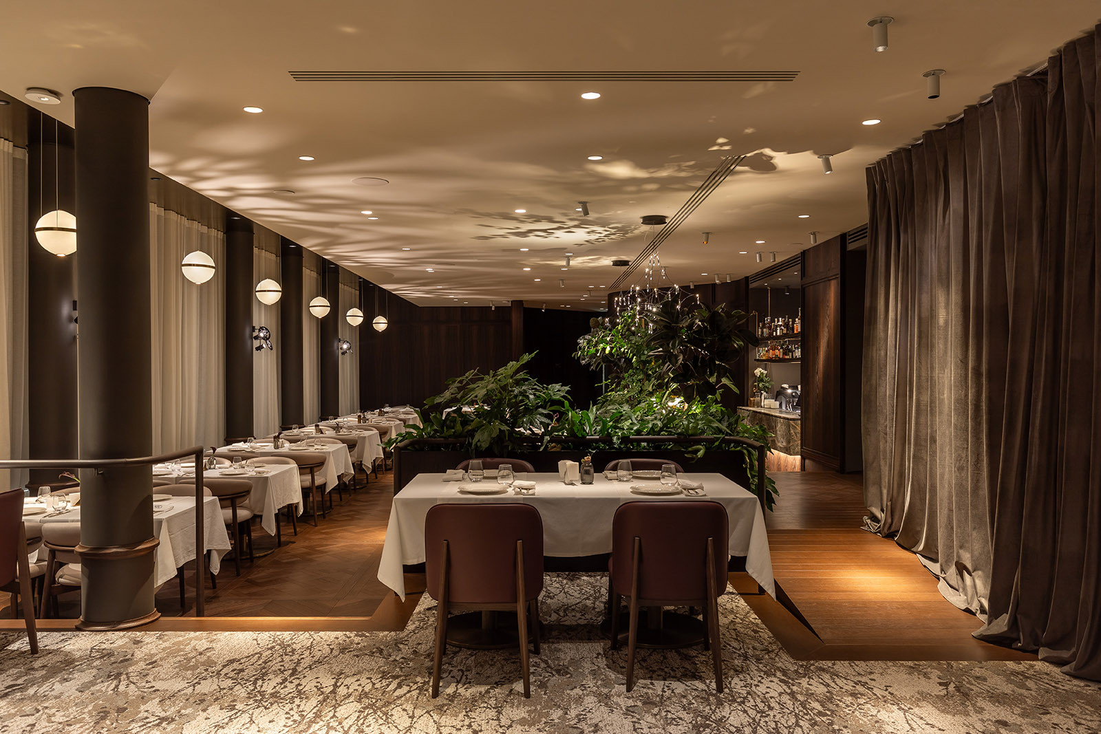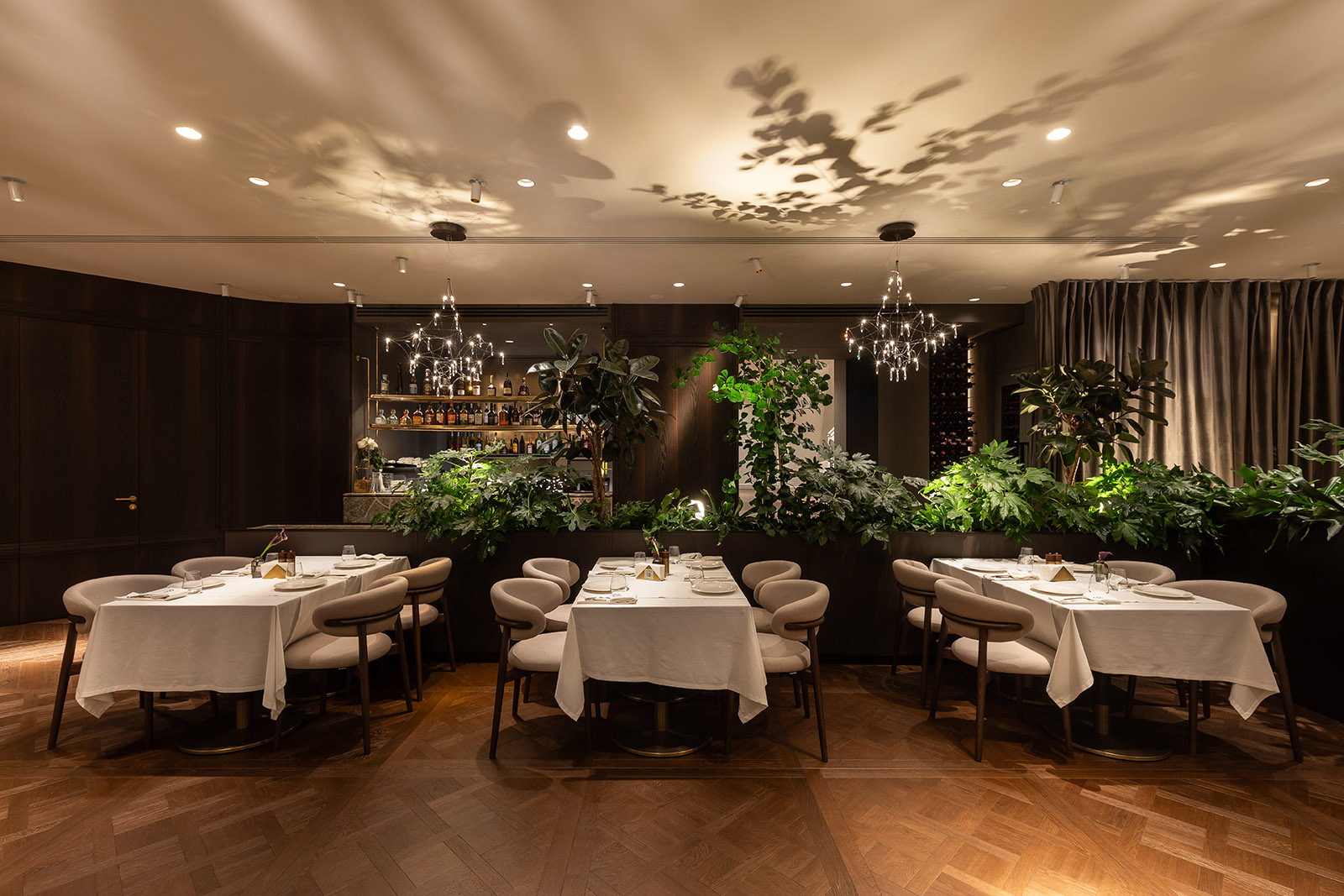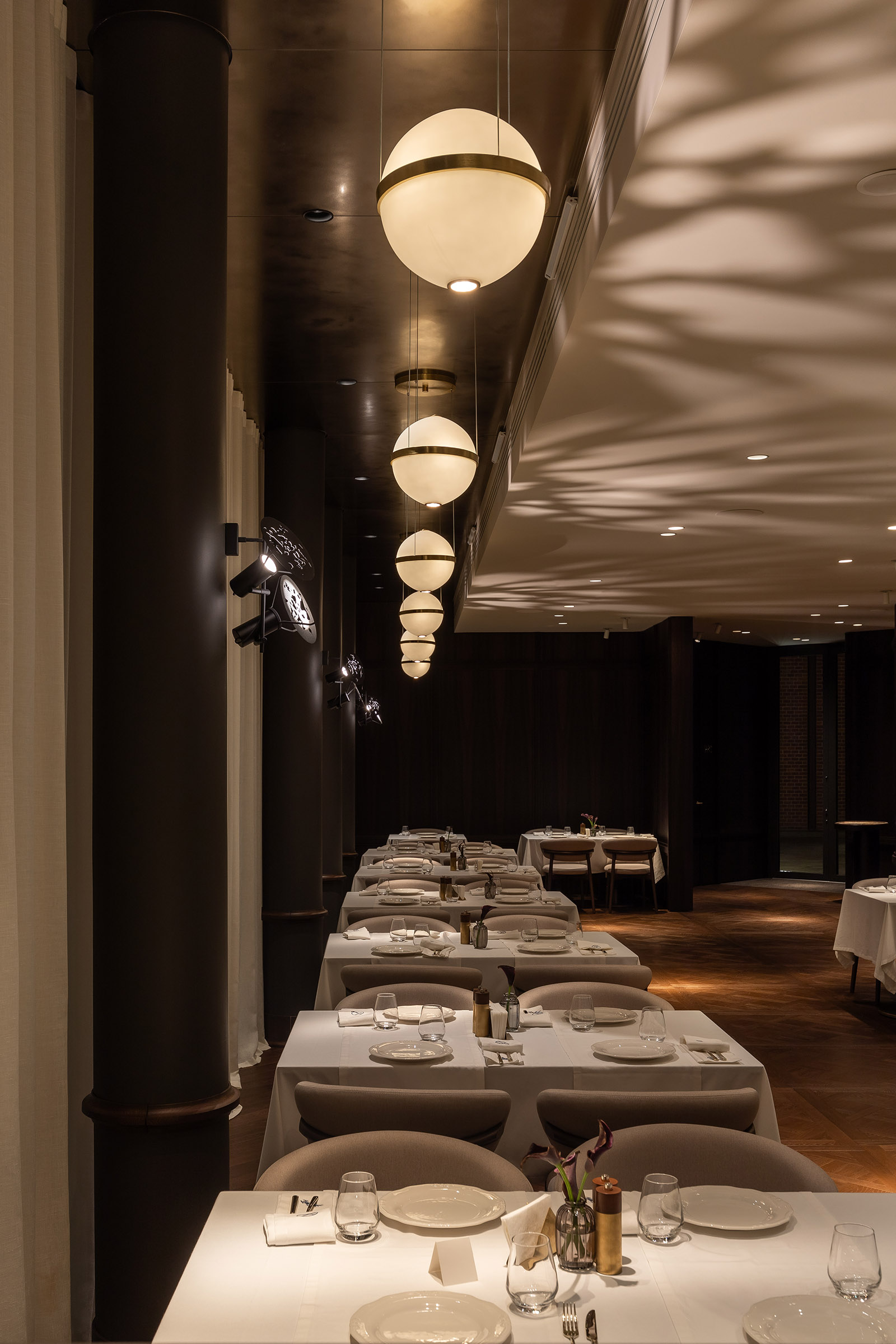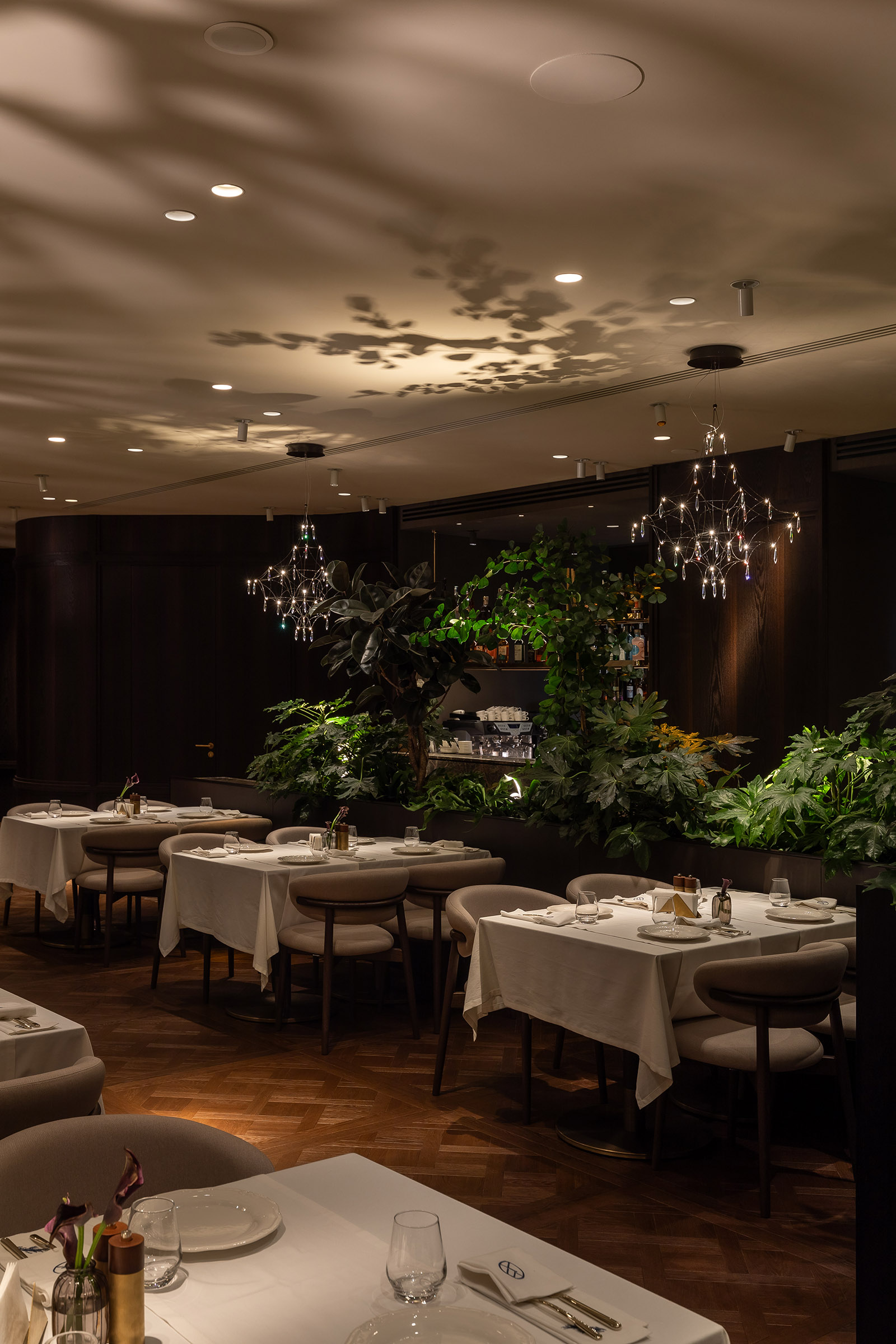 Спеціально для цього проєкту ми створили тіньові світильники, що у вечірньому режимі вибудовують на стелі магічні тіньові патерни, додаючи простору характеру та глибини.