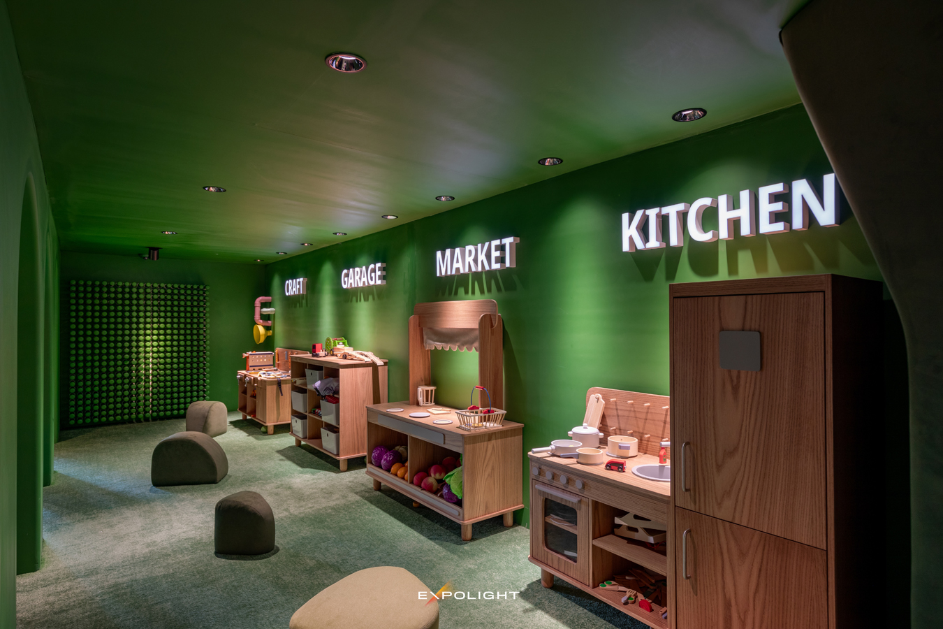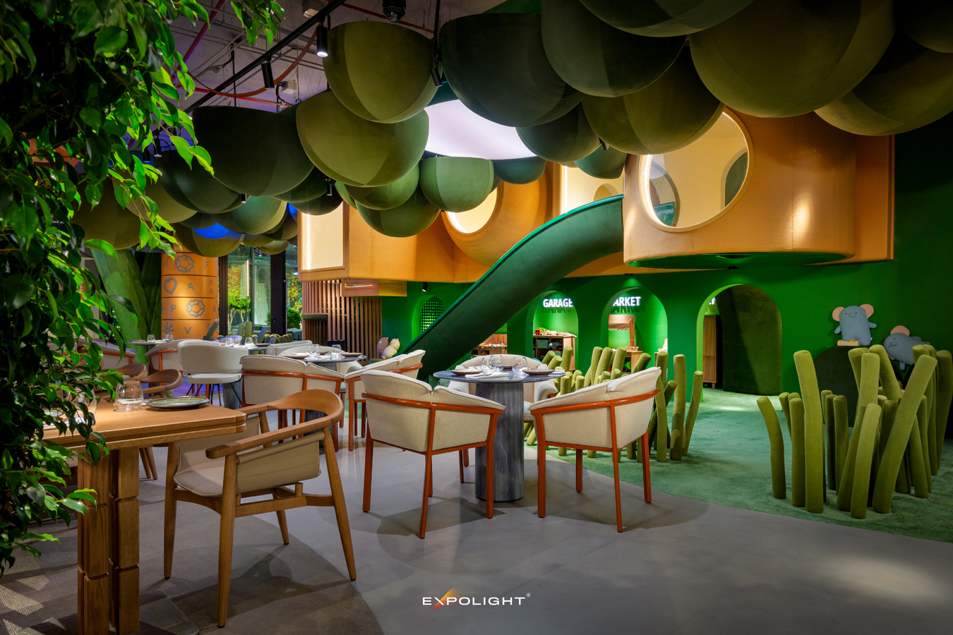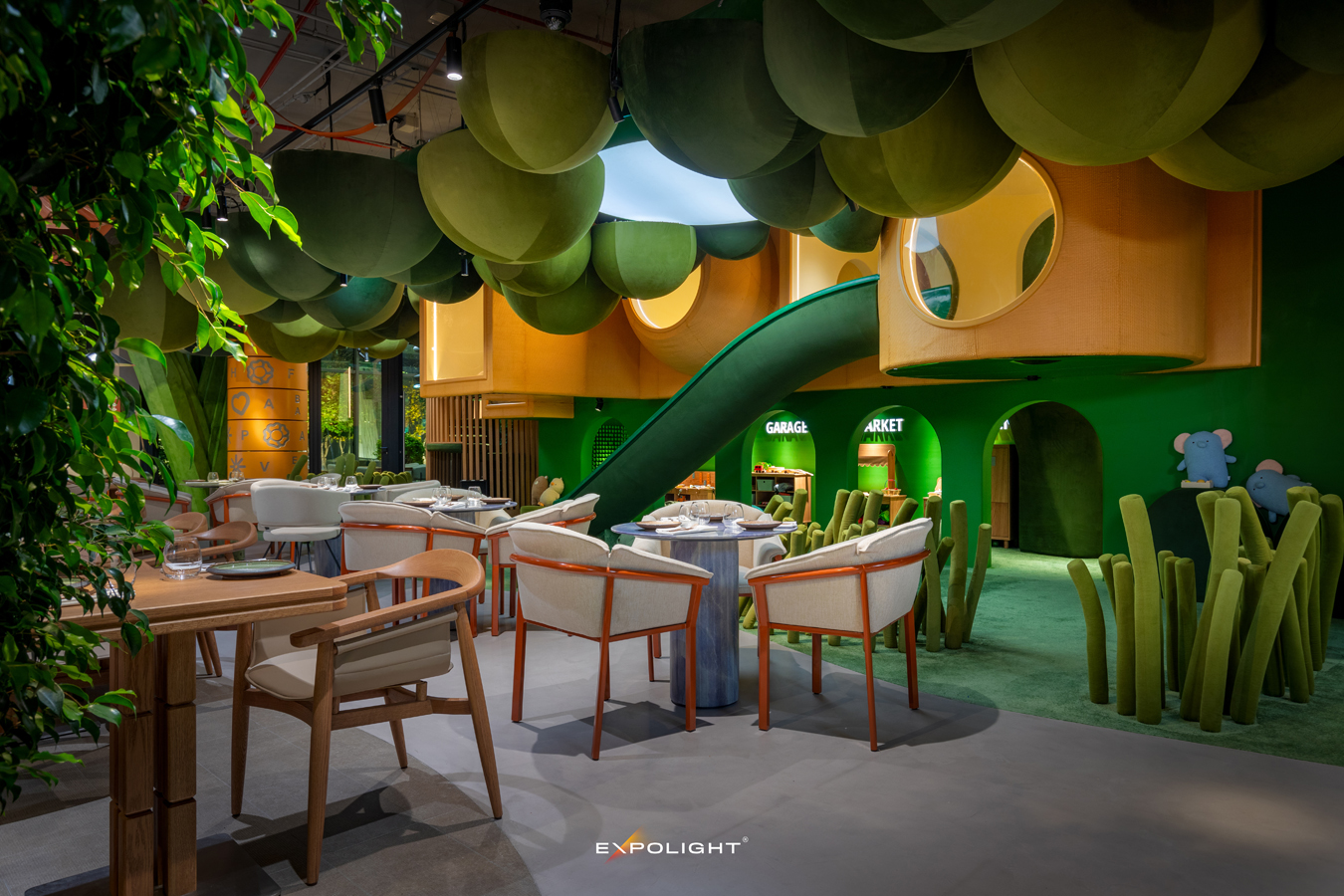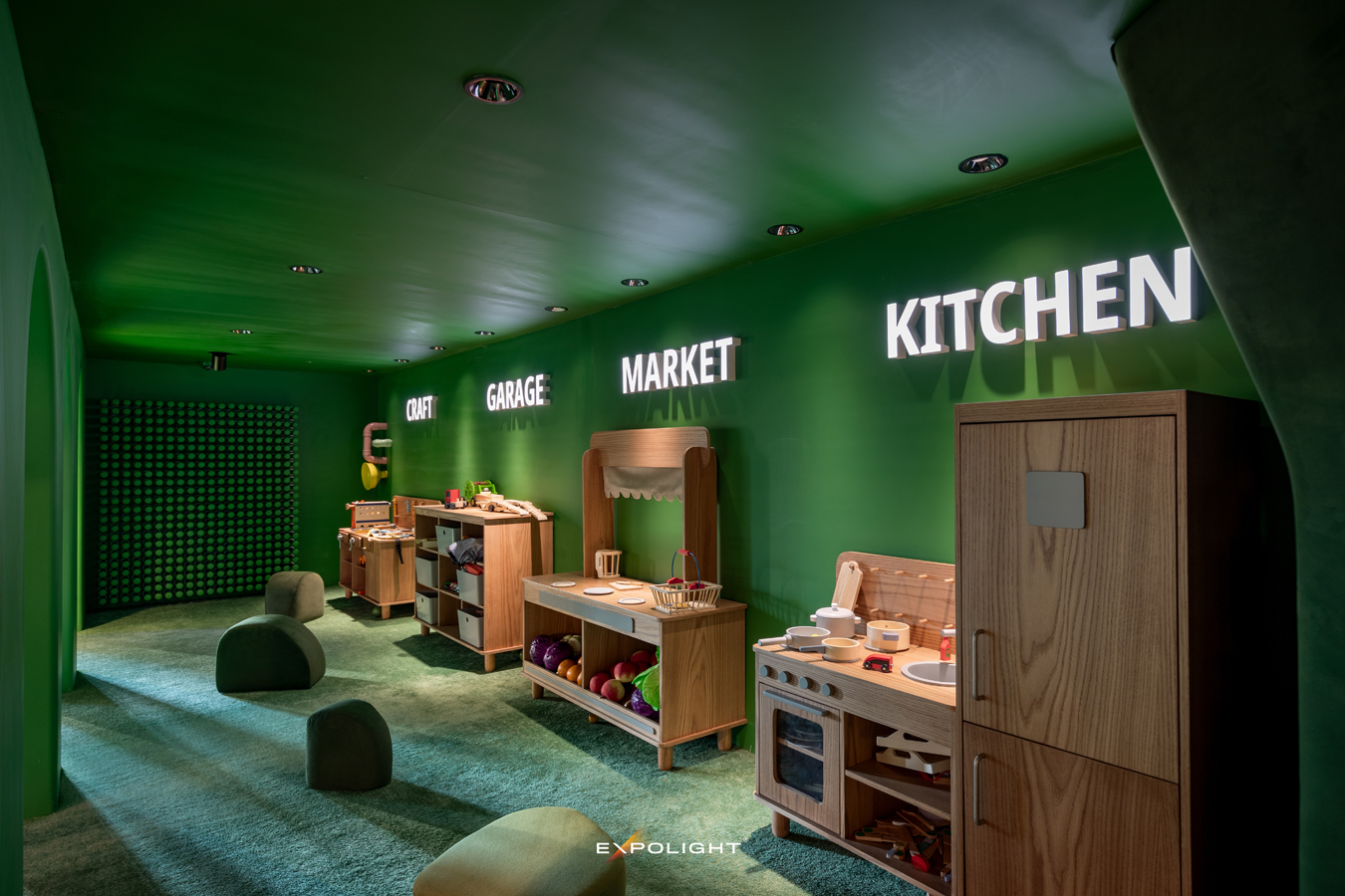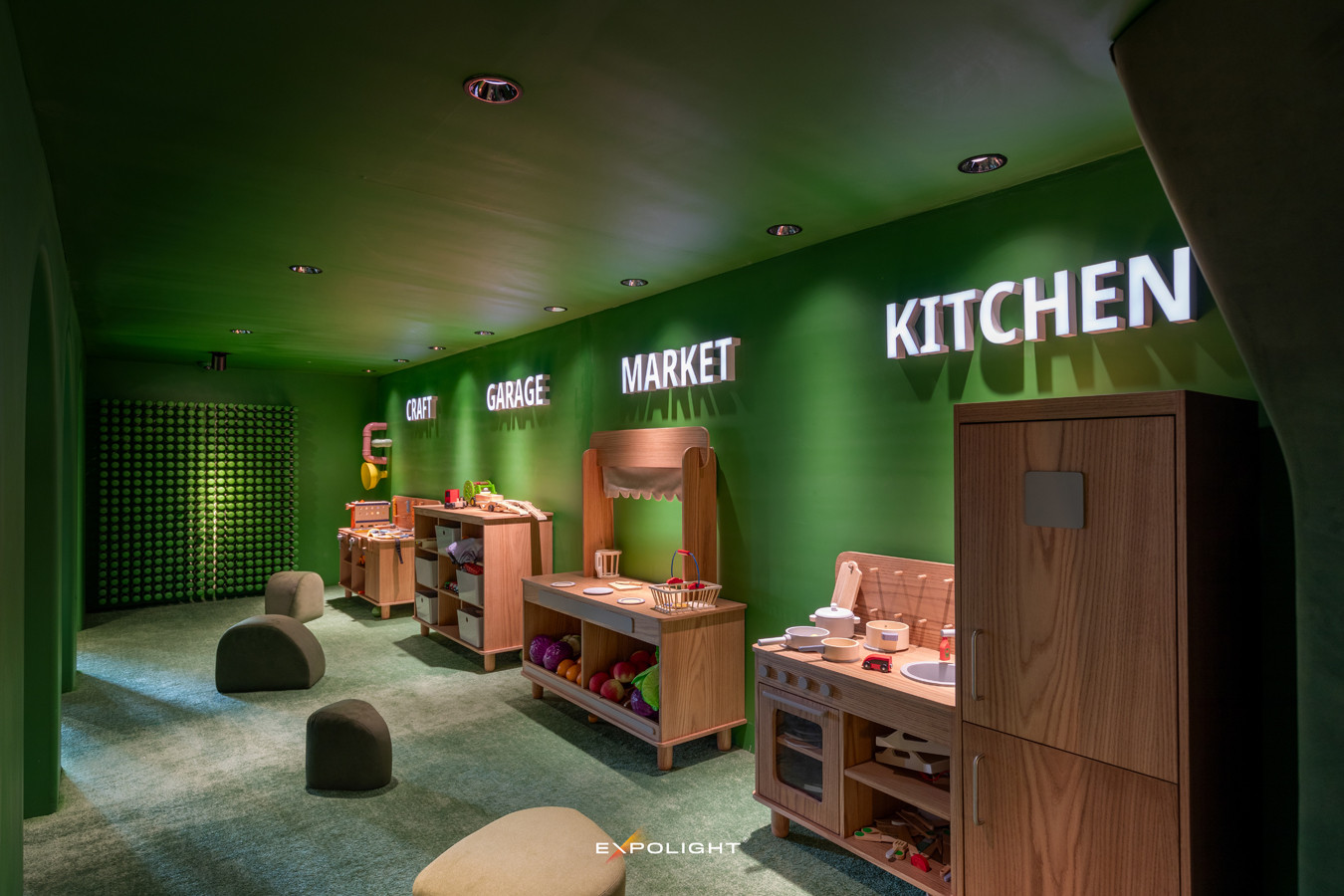 - Акцентне освітлення: Виділяє ключові елементи декору, включно з природними матеріалами, зеленими зонами та дитячими ігровими майданчиками, додаючи простору глибини та естетичності.
