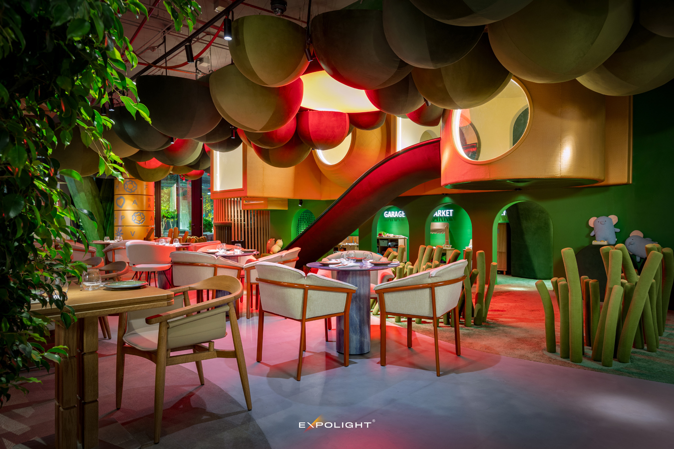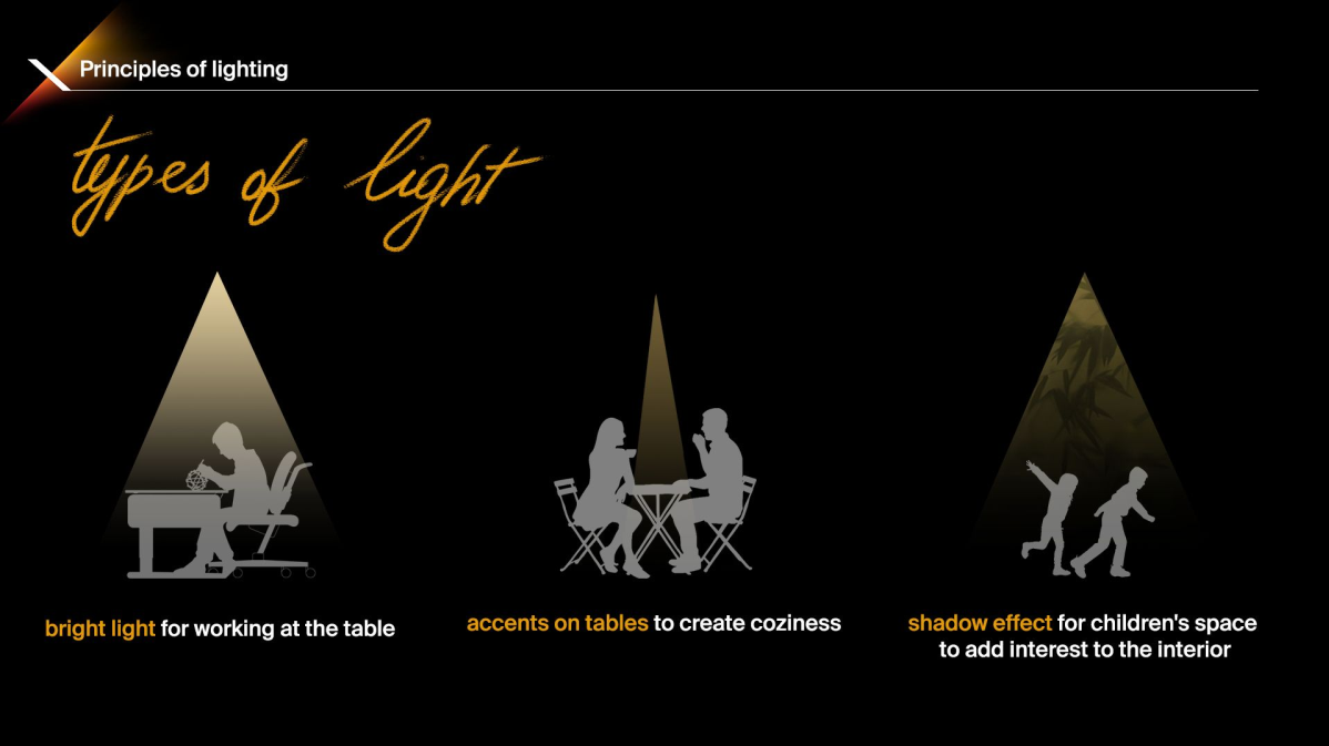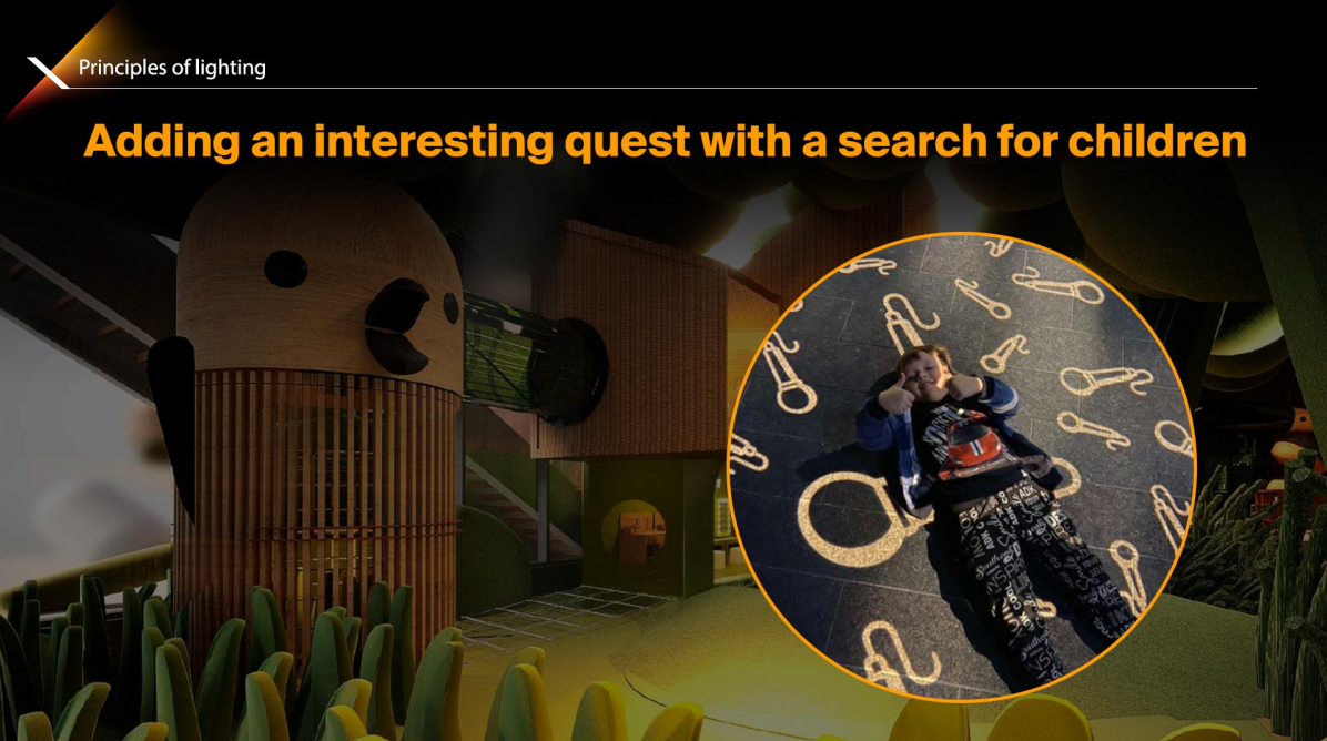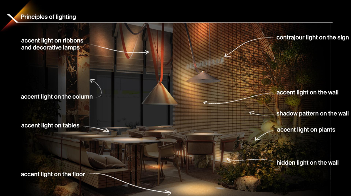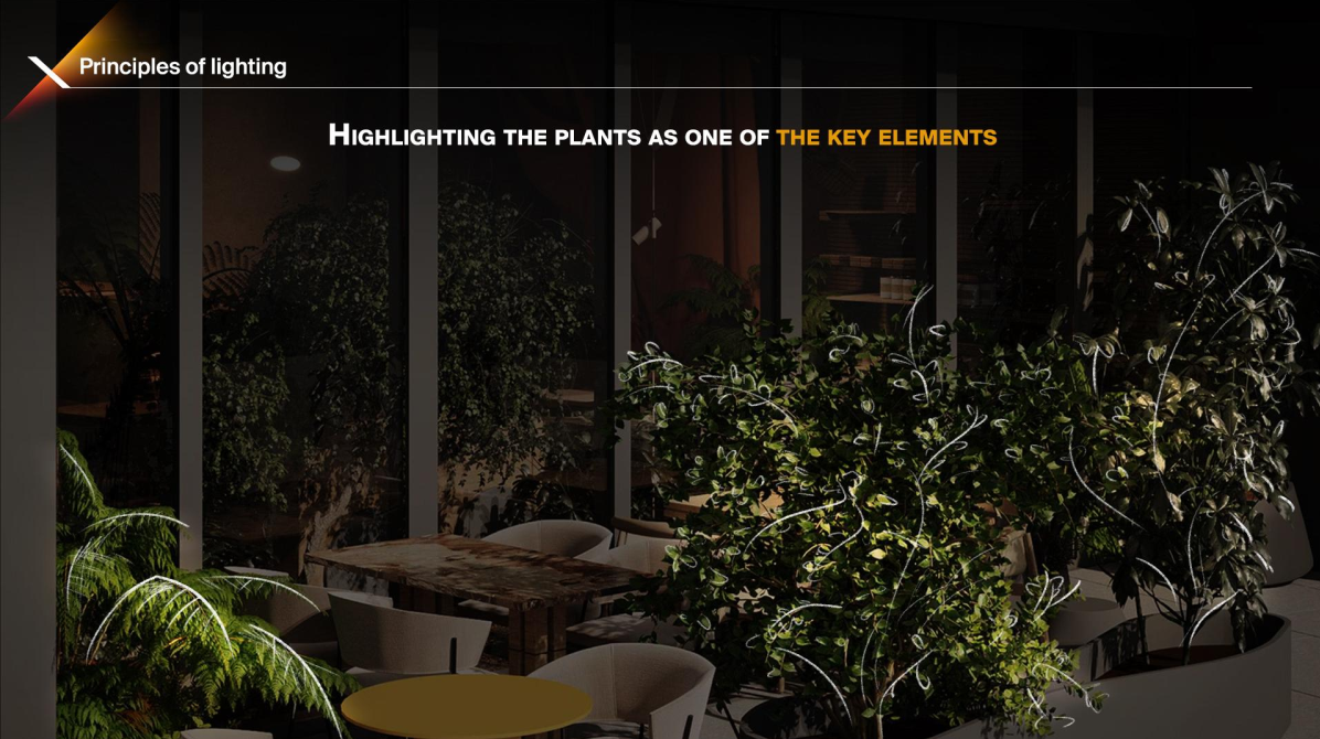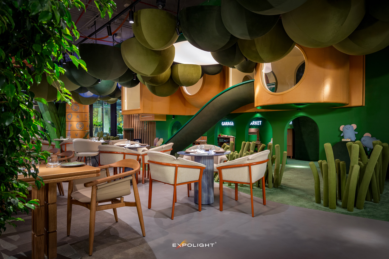 - Акцентне освітлення: Виділяє ключові елементи декору, включно з природними матеріалами, зеленими зонами та дитячими ігровими майданчиками, додаючи простору глибини та естетичності.