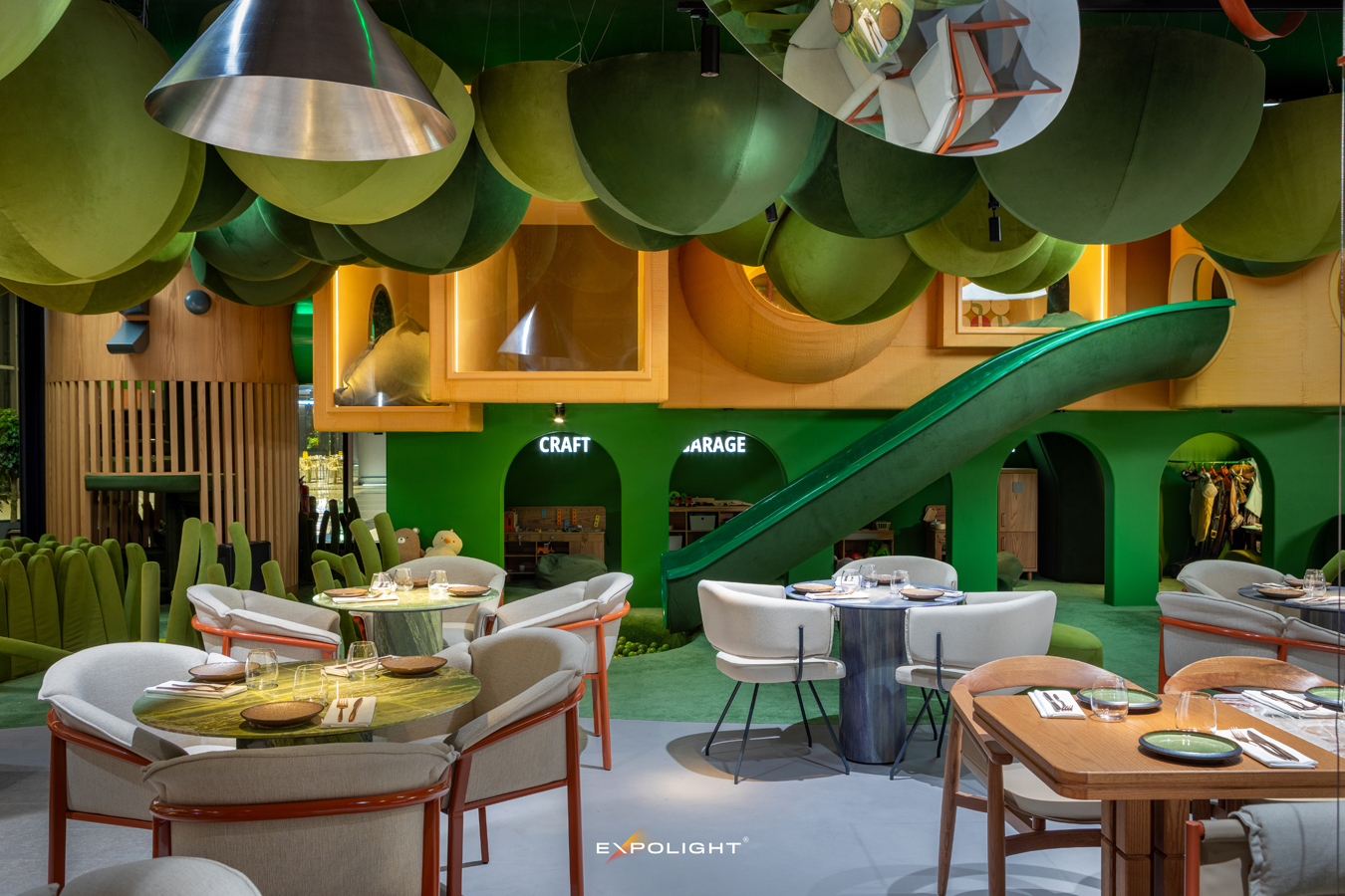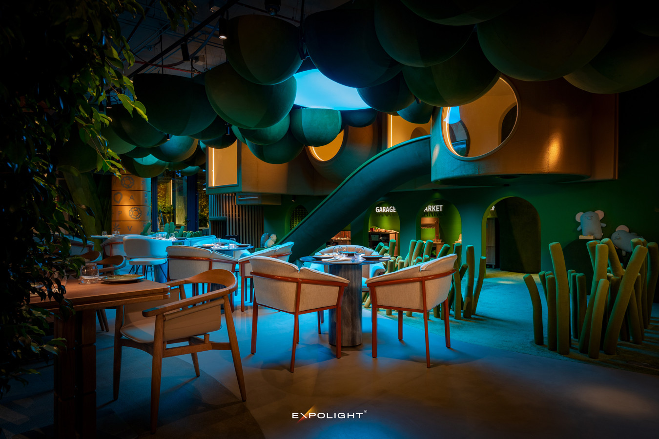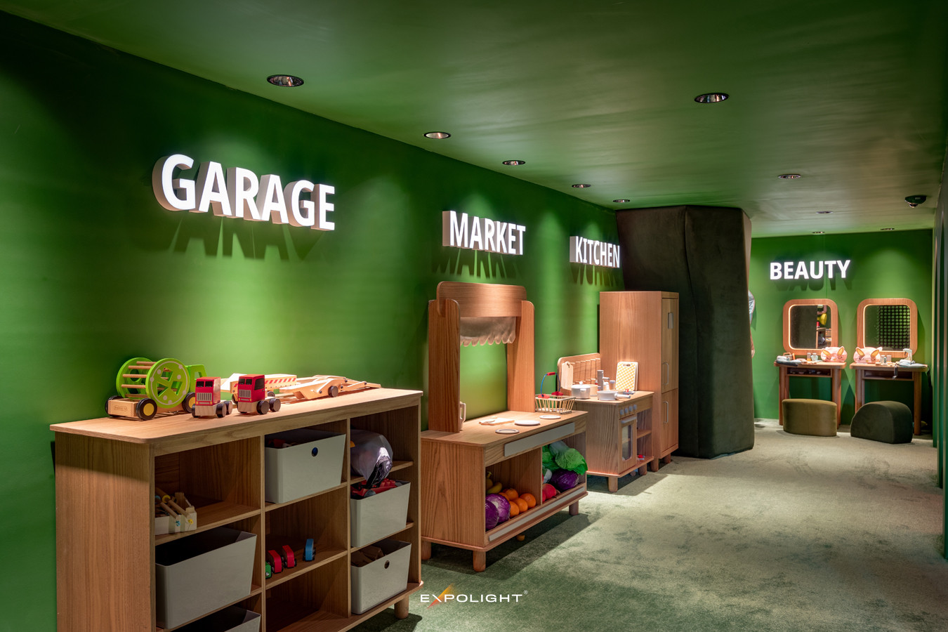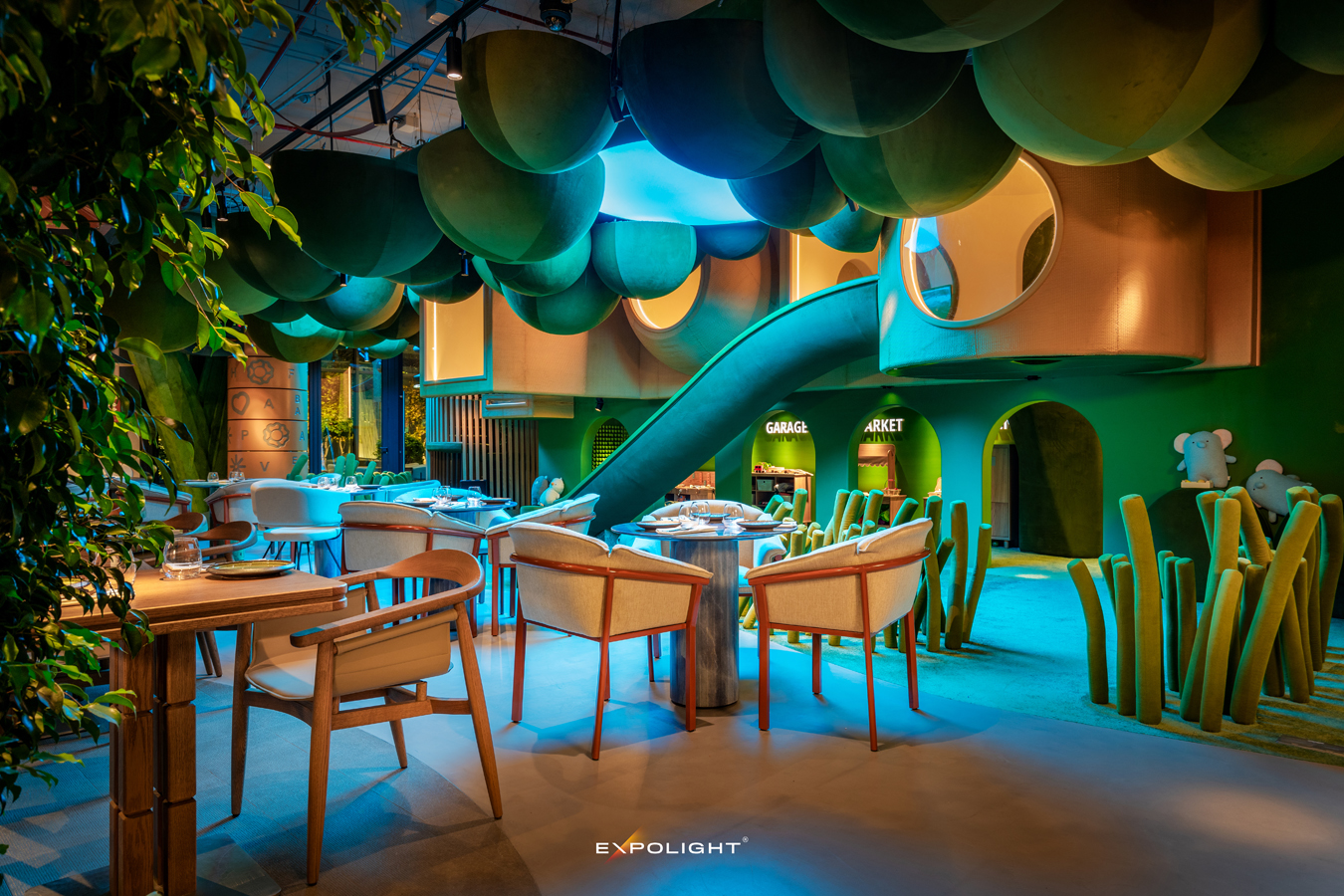 - Акцентне освітлення: Виділяє ключові елементи декору, включно з природними матеріалами, зеленими зонами та дитячими ігровими майданчиками, додаючи простору глибини та естетичності.