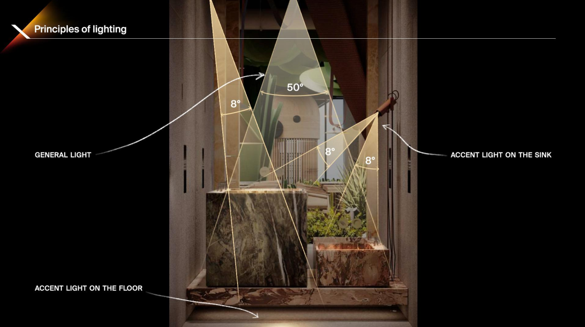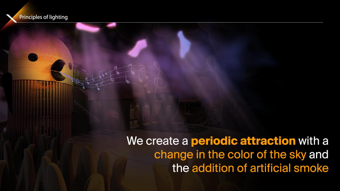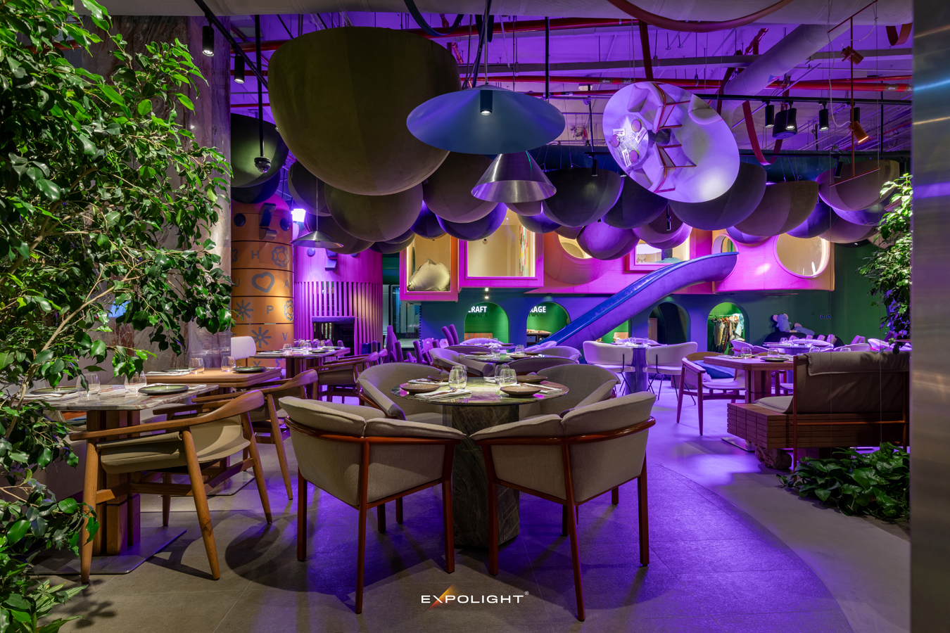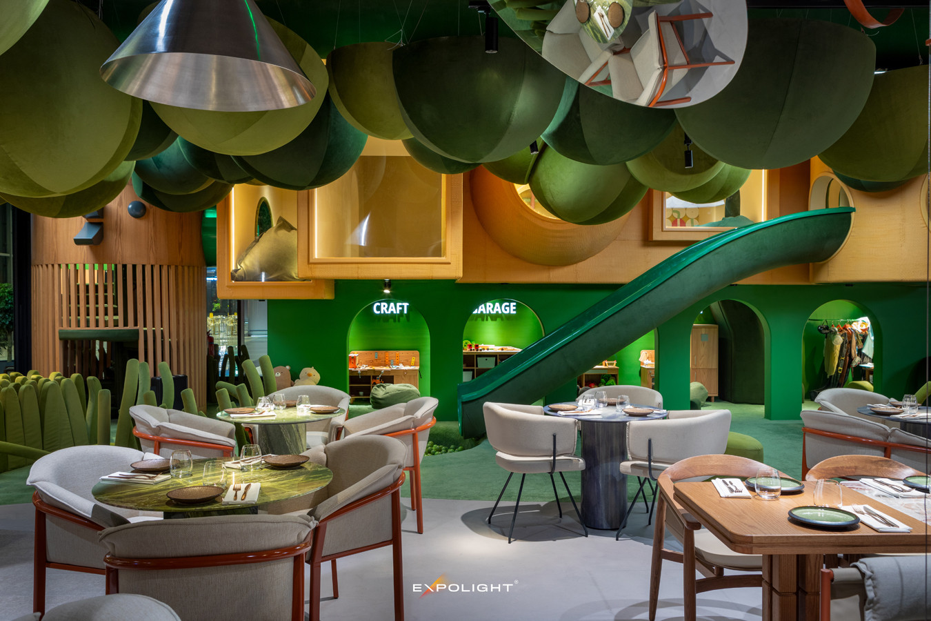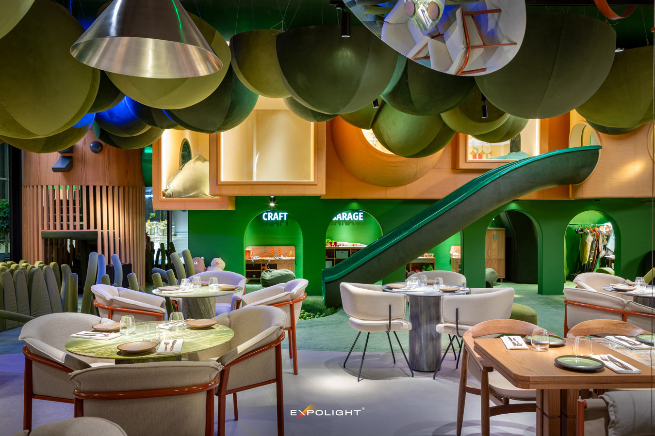 - Акцентне освітлення: Виділяє ключові елементи декору, включно з природними матеріалами, зеленими зонами та дитячими ігровими майданчиками, додаючи простору глибини та естетичності.
