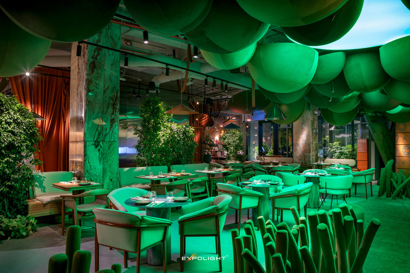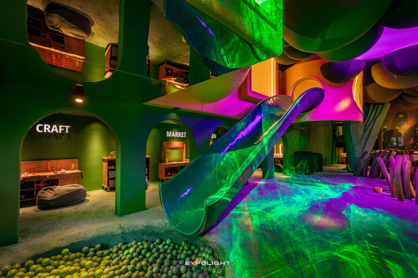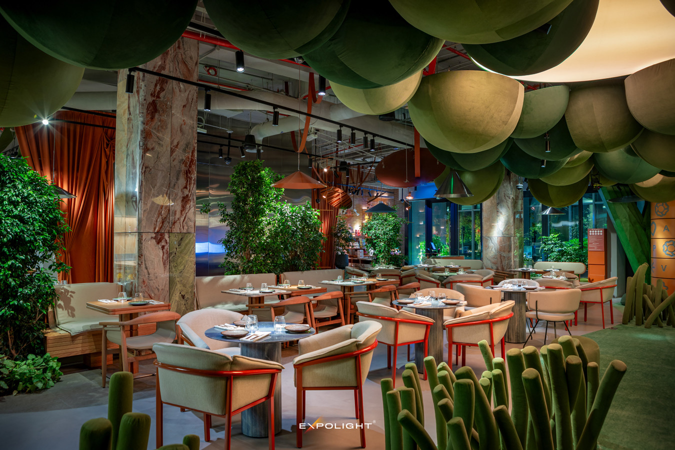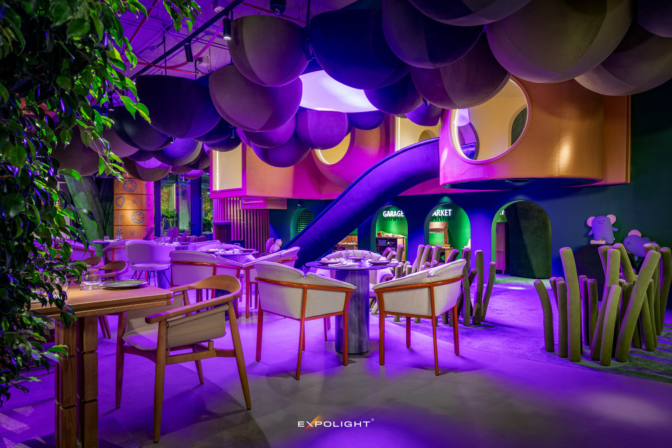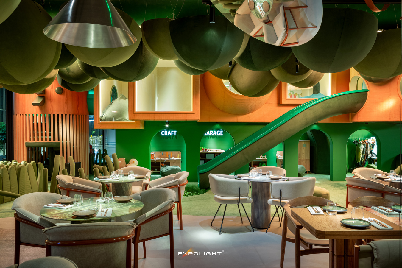 - Акцентне освітлення: Виділяє ключові елементи декору, включно з природними матеріалами, зеленими зонами та дитячими ігровими майданчиками, додаючи простору глибини та естетичності.