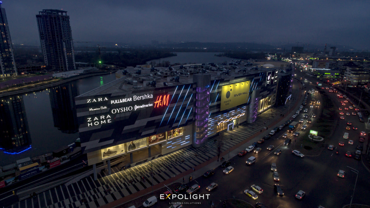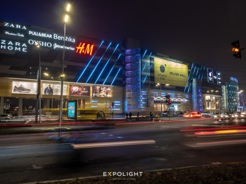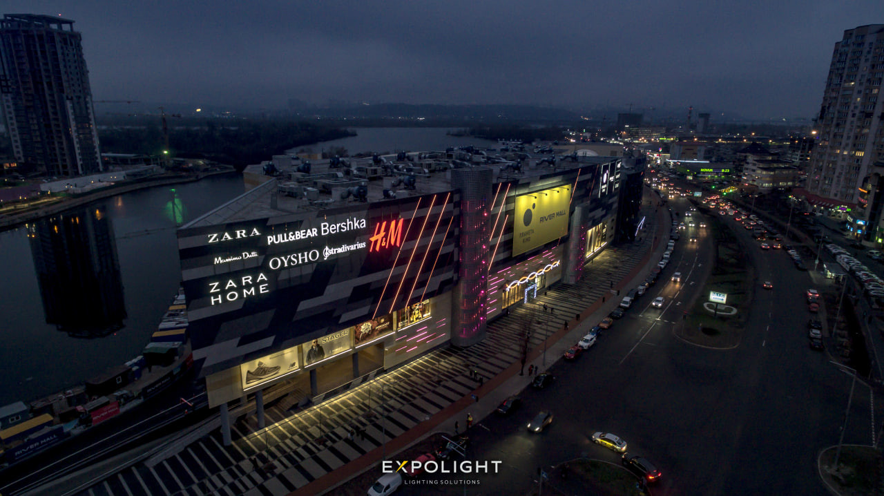 ТЦ River Mall - найбільший торговий центр лівобережжя Києва. Світлове оформлення такого гіганта - серйозне завдання, з огляду на те, що світло тут не просто виконує декораційну та освітлювальну функцію, а й безпосередньо впливає на привабливість, а значить - прибутковість.