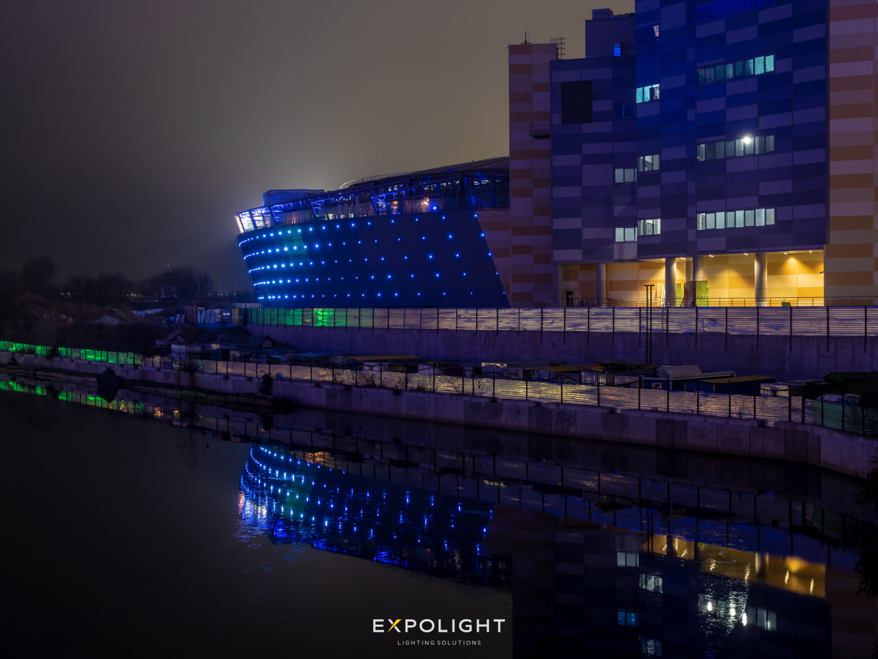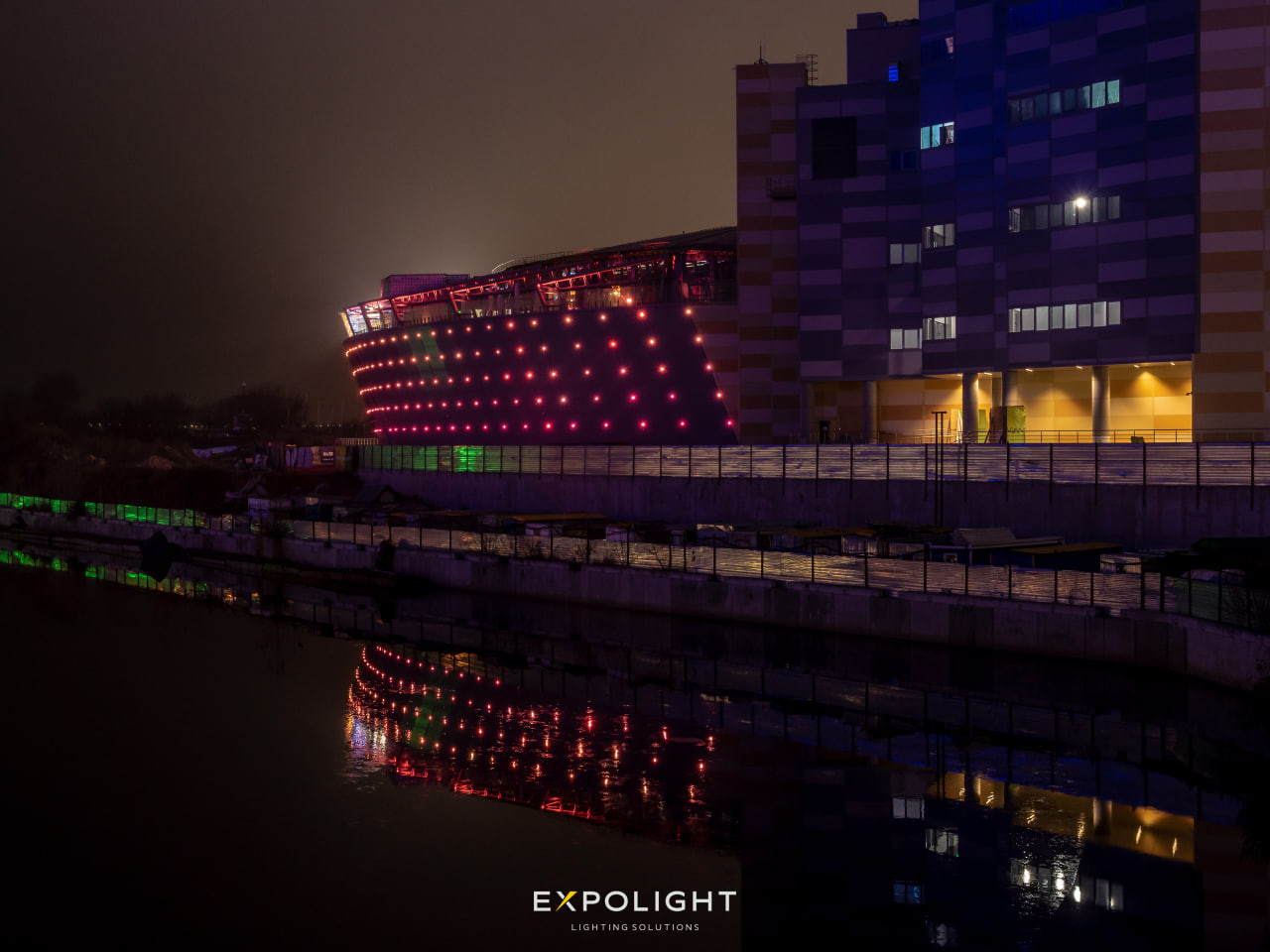 Округлий фасад з боку озера був підкреслений піксельною сіткою. Щільне покриття прожекторів дозволило реалізувати різні сценарії зі зміною відтінків і динаміки. Кабельна сітка була продумано прихована в конструкції оздоблення фасаду. Коли клієнт заздалегідь залучає дизайнерів освітлення до процесу планування, завжди є можливість закласти розумні рішення.