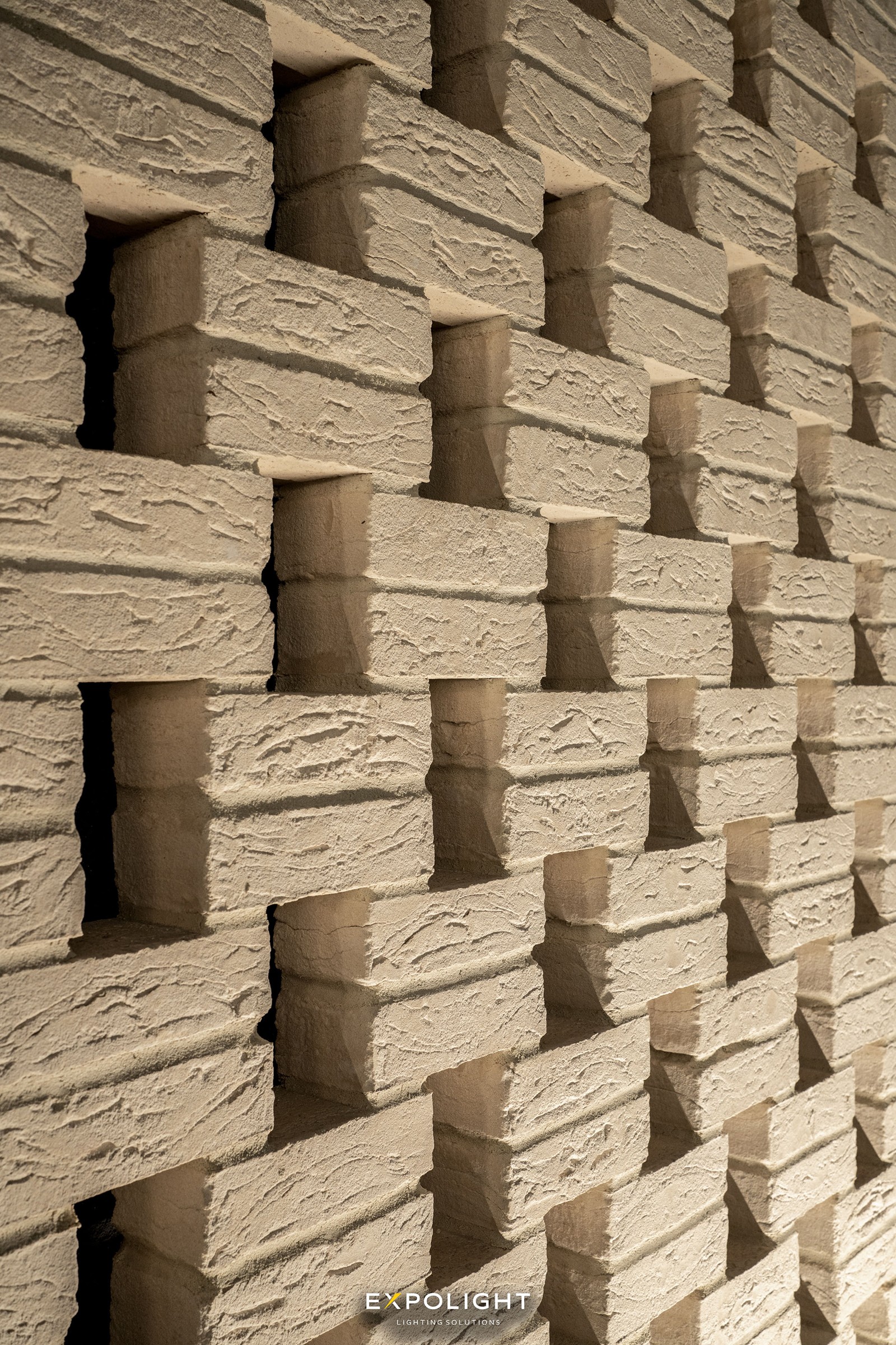 Цегла – традиційно щільний і грубий матеріал, а тут – нестандартного білого відтінку, перетворюється на світлову вуаль. Ритм внутрішніх віконних прорізів не збігається з зовнішнім ритмом, тому приховані елементи ми проявимо внутрішнім світлом.