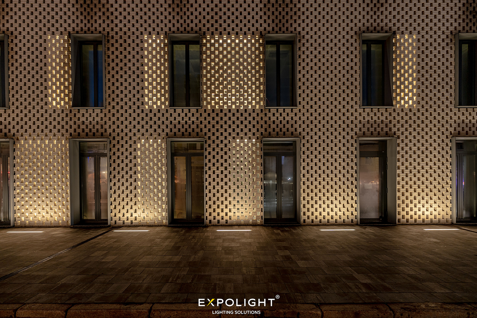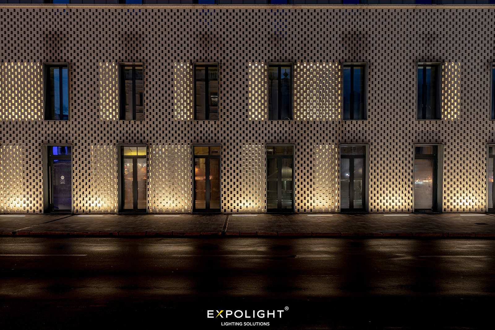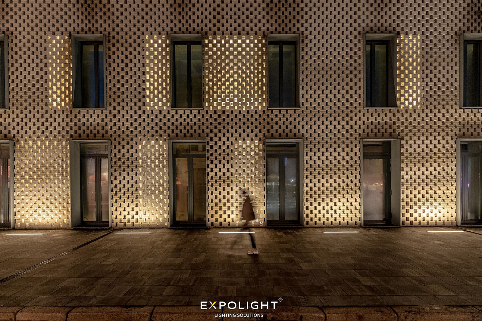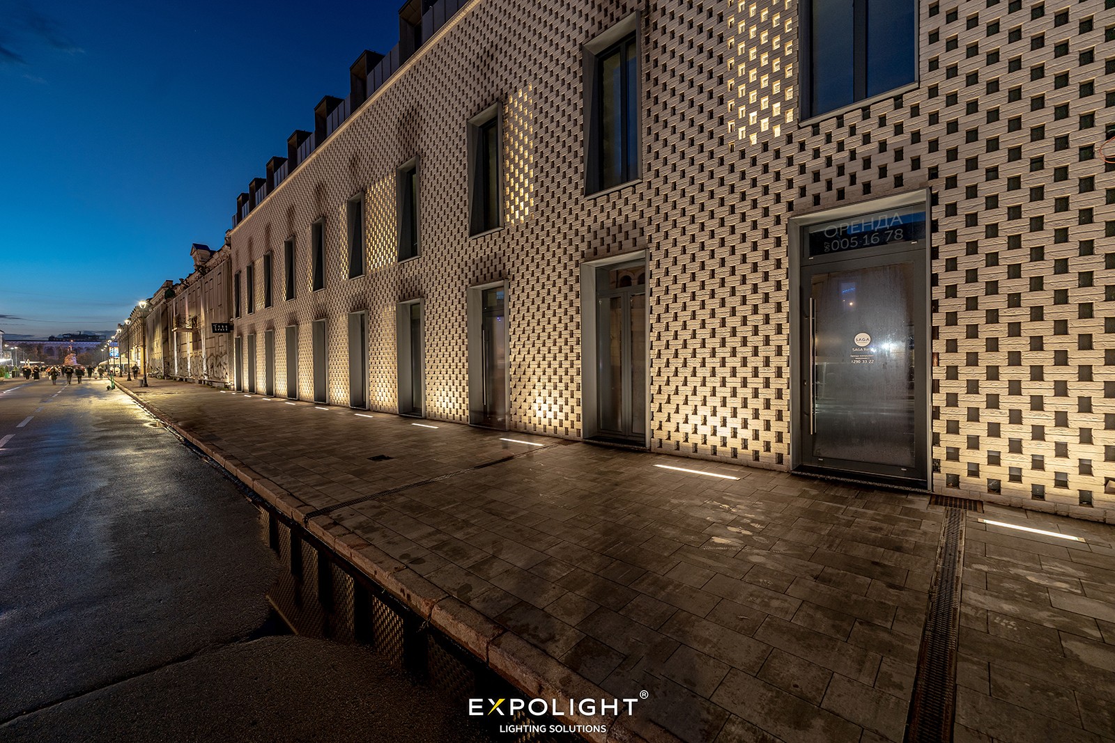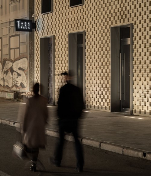 Saga City Space – це біле цегляне мереживне полотно, для якого ми розробили спеціальну схему освітлення з різною плановістю. М'яке приглушене світло наповнило фасад зсередини, а його ажурна частина вийшла на передній план завдяки зовнішньому ковзанню підсвічування.