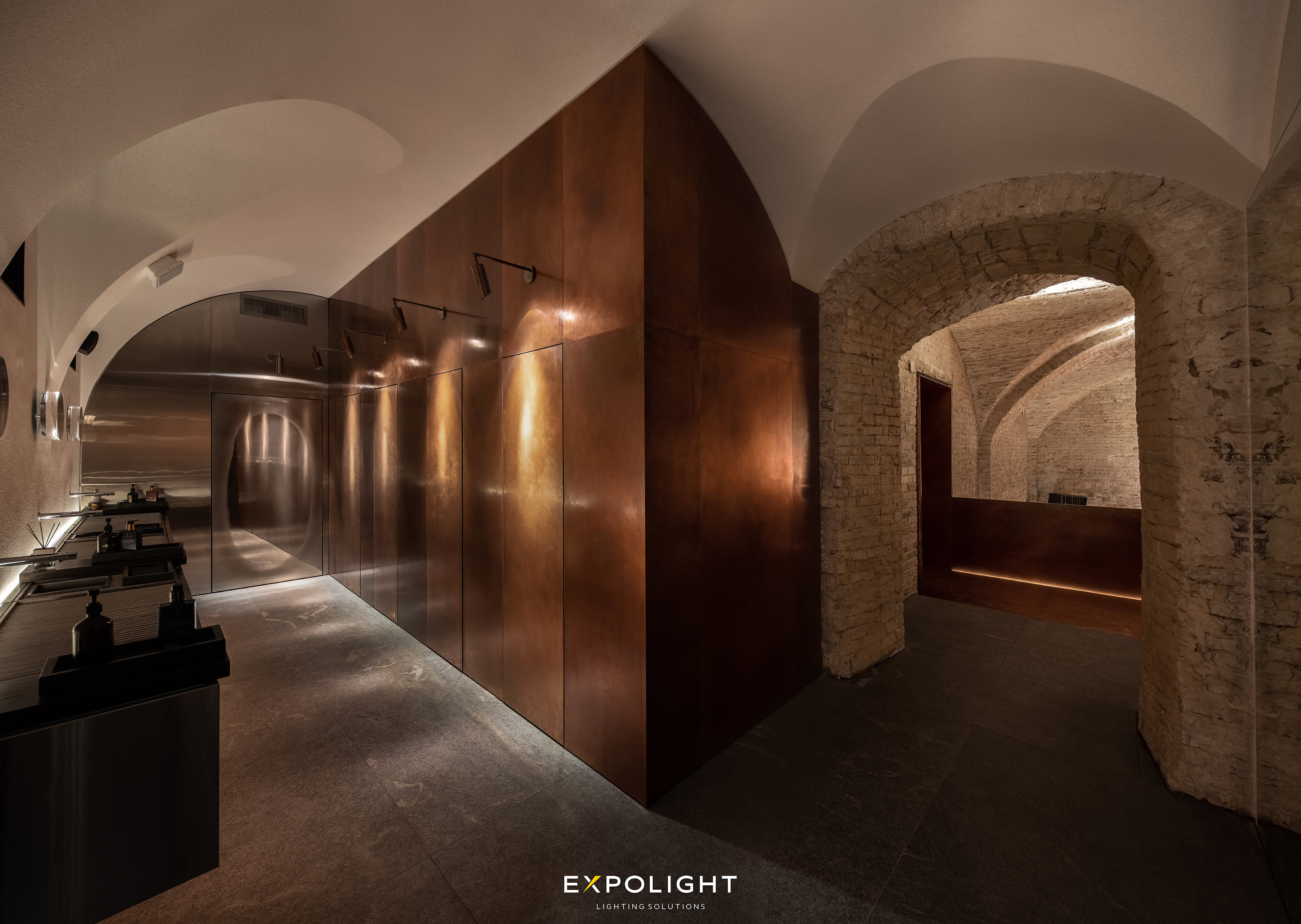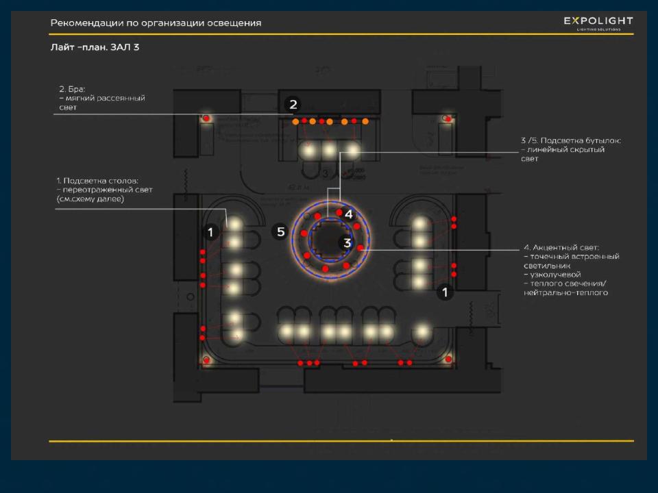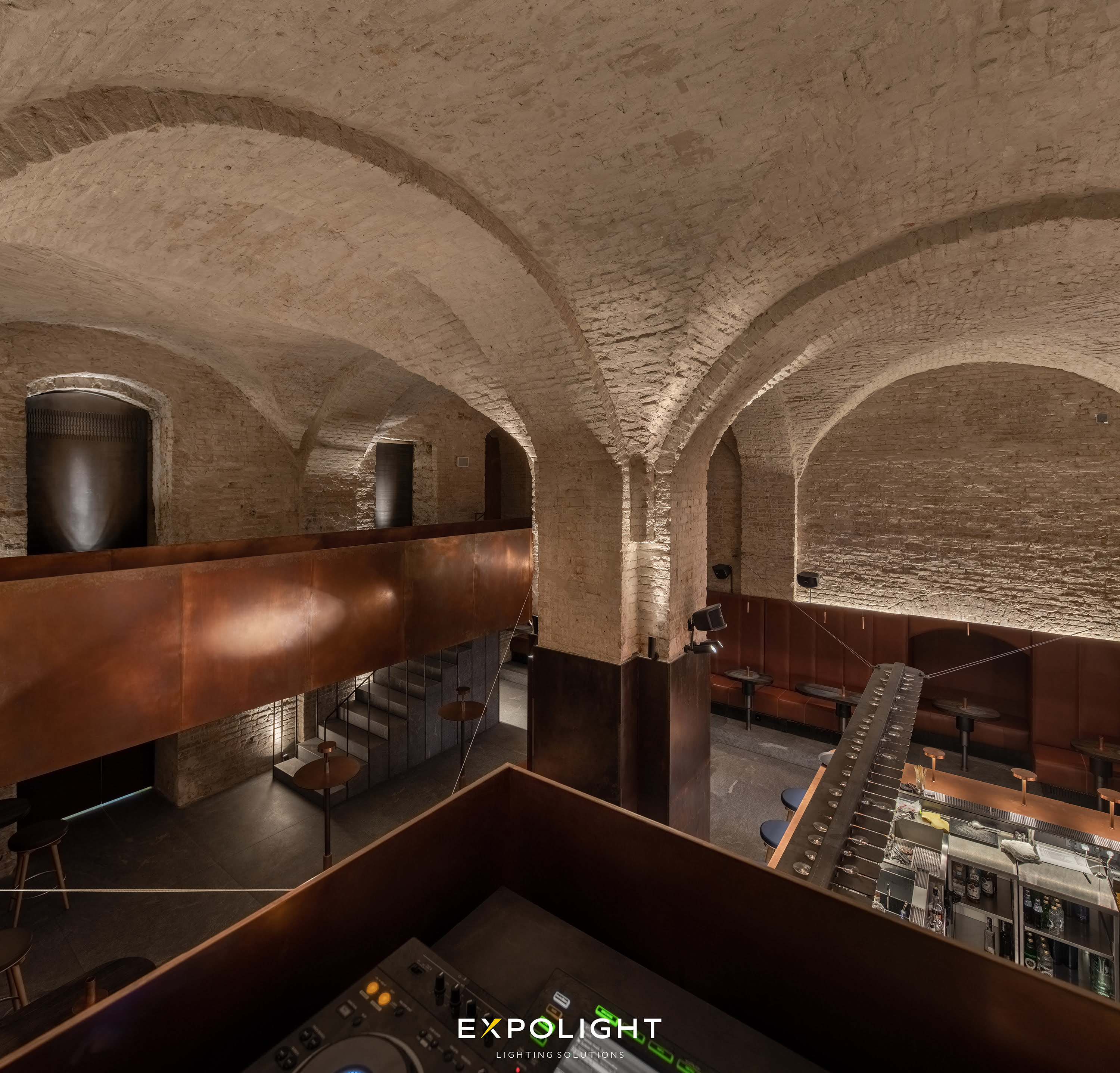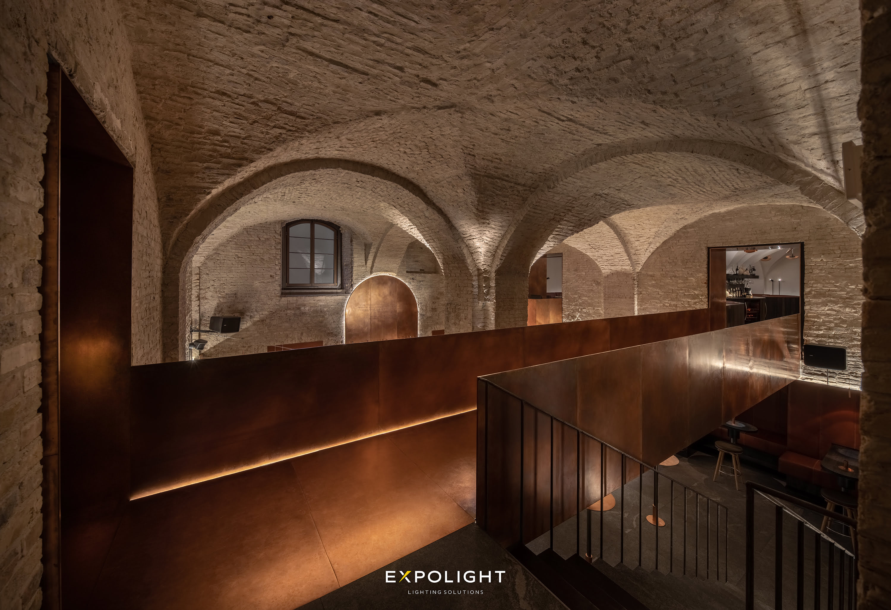 Разом з архітекторами на основі їхніх принципових ідей ми відточили дизайн, спроектували світлові рішення та створили конструктив світильників так, щоб вони підкреслювали архітектуру залу. Нам вдалося приємно пожвавити монохромний фактурний інтер'єр ресторану. Застосувавши спеціальні рефлектори, ми створили тепло-оранжеву палітру світіння, що додало міді теплих та м'яких відтінків. Вузкопроменеве світло прожекторів відбивається від мідних пластин, підвішених під стелею, і відкидає акцентні плями світла на столи.