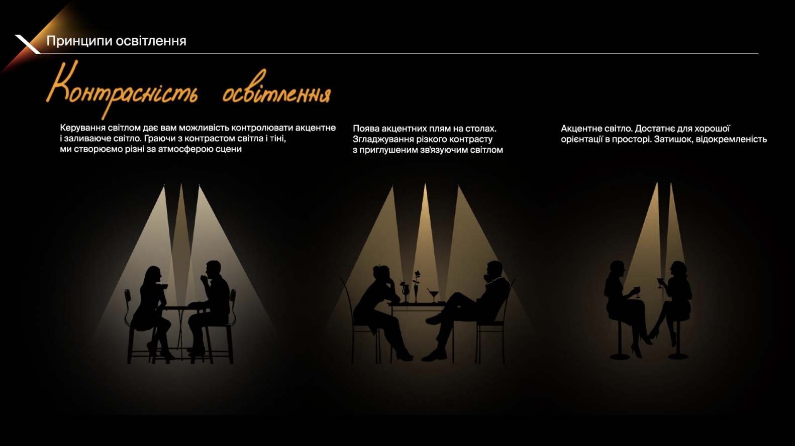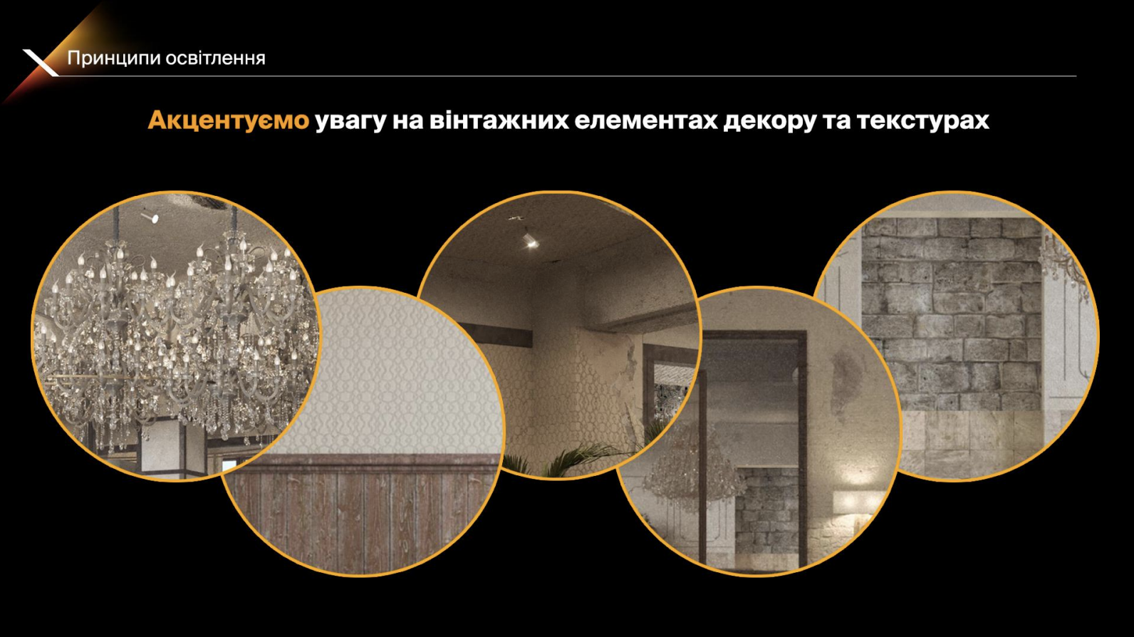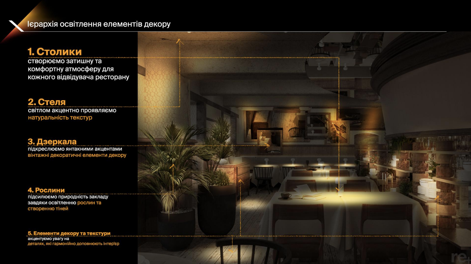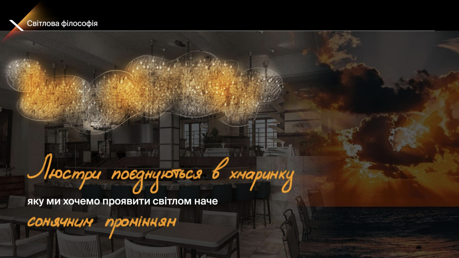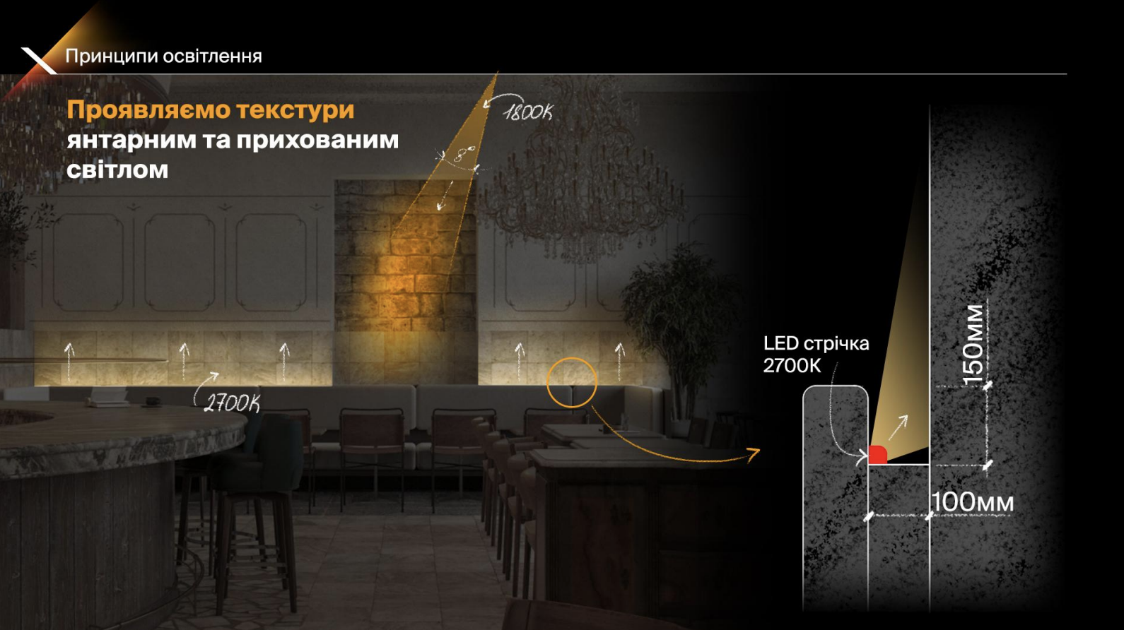 Цей ресторан в історичній частині старого міста. Нашою задачею було створити комфортні умови для перебування відвідувачів в ресторані як вдень, так і ввечері. Світлом ми підкреслили унікальний дизайн інтер'єру закладу, який поєднує у собі елегантну класичність та легку сучасність.