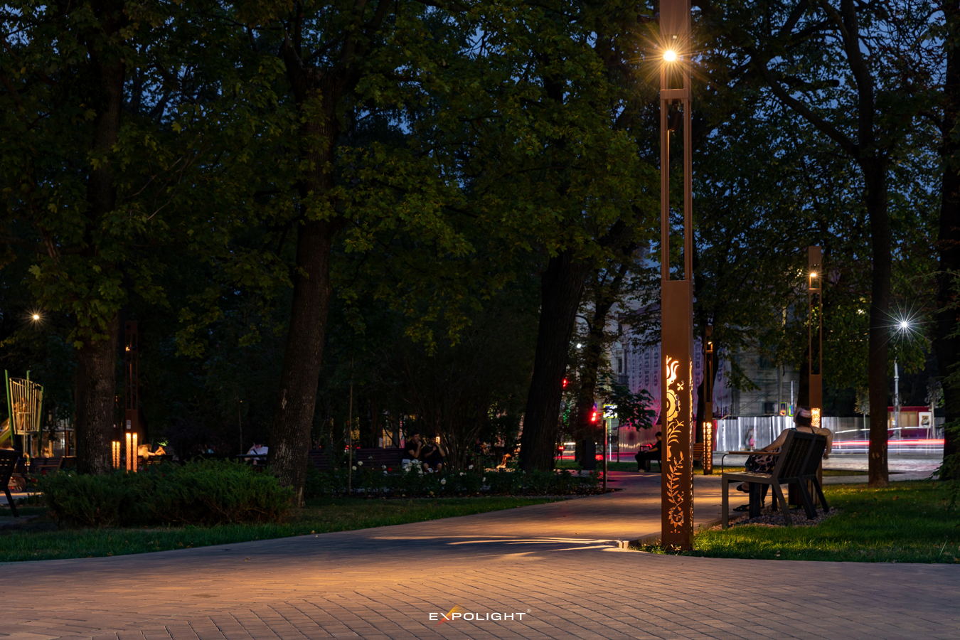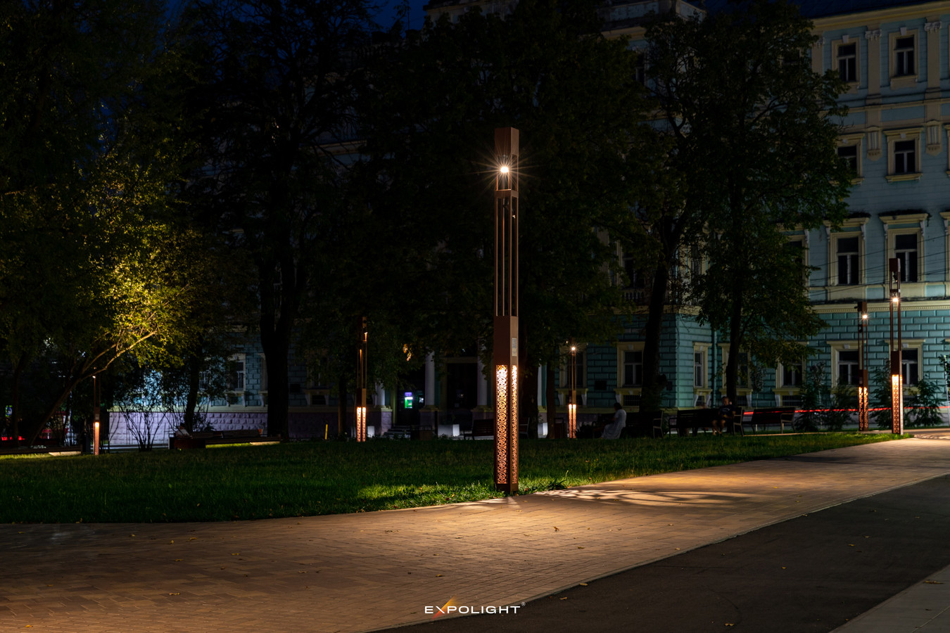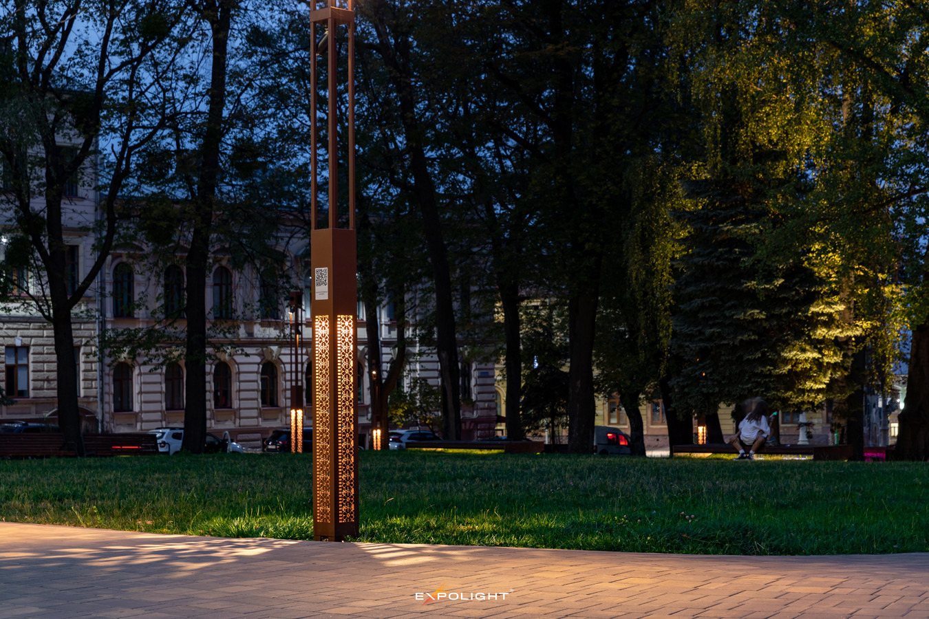 В результаті нашої спільної роботи у сквері встановлено 25 світлових скульптур, оздоблених орнаментами, що символізують кожен з 25 регіонів України. Наша мета полягала в тому, щоб світло проходило крізь ці орнаменти та створювало мереживо тіней, яке відображалося б на доріжках. Для досягнення цього результату, разом з архітекторами, було підібрано спеціальні джерела світла, згруповані в три категорії світильників.