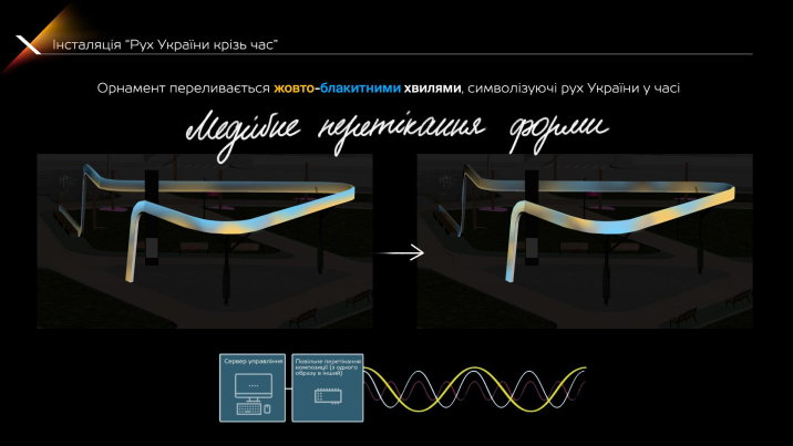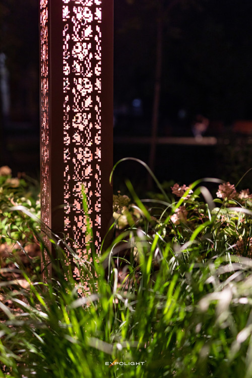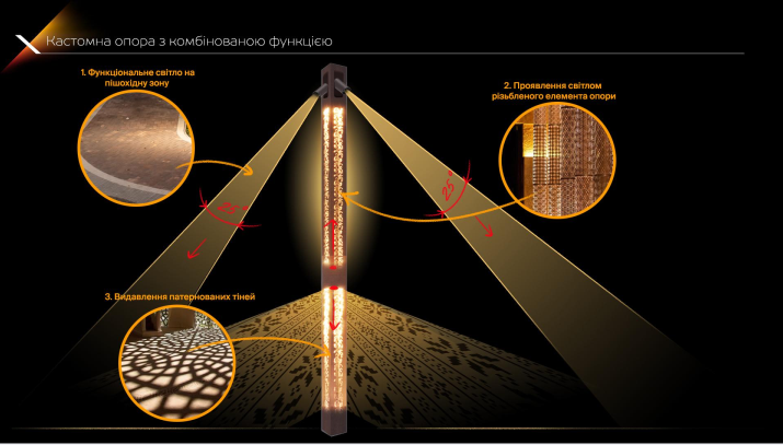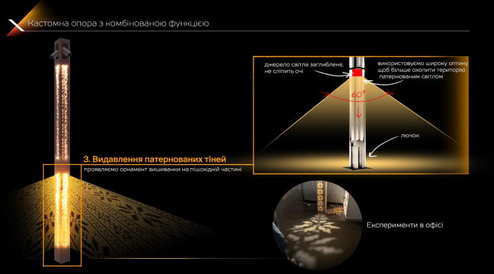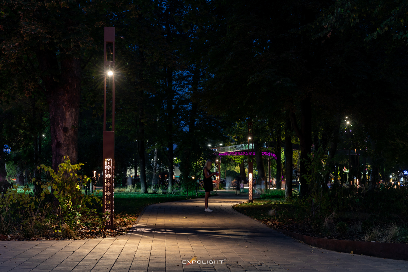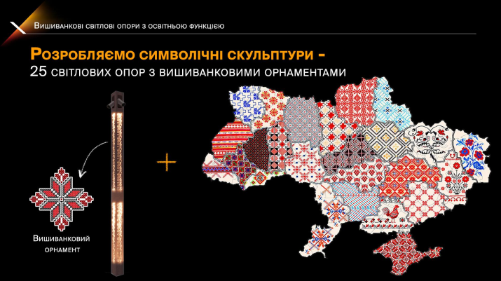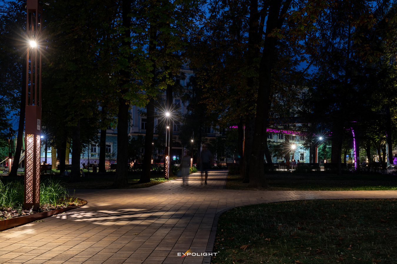 В результаті нашої спільної роботи у сквері встановлено 25 світлових скульптур, оздоблених орнаментами, що символізують кожен з 25 регіонів України. Наша мета полягала в тому, щоб світло проходило крізь ці орнаменти та створювало мереживо тіней, яке відображалося б на доріжках. Для досягнення цього результату, разом з архітекторами, було підібрано спеціальні джерела світла, згруповані в три категорії світильників.