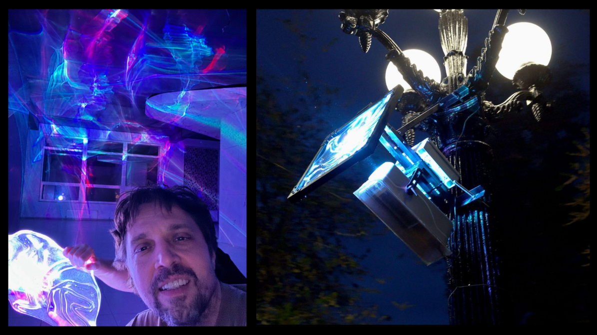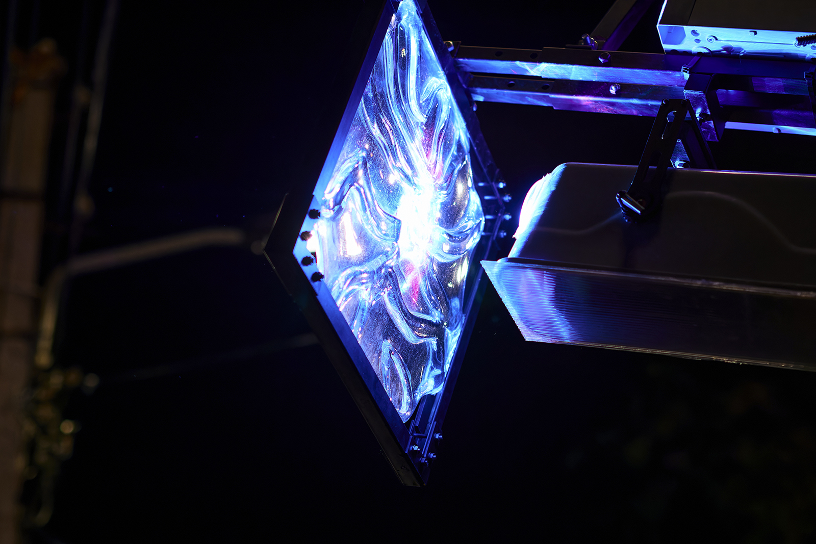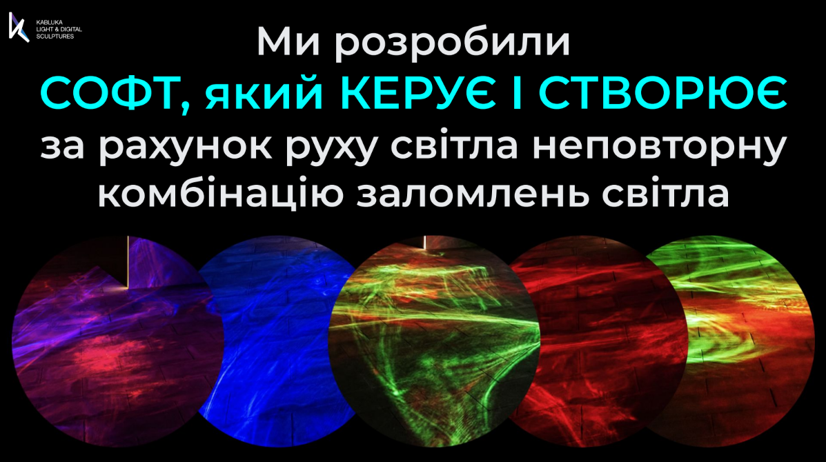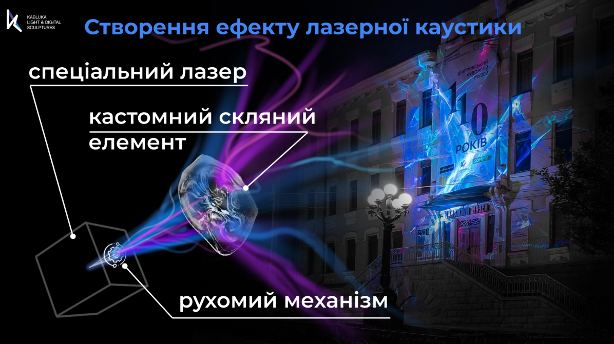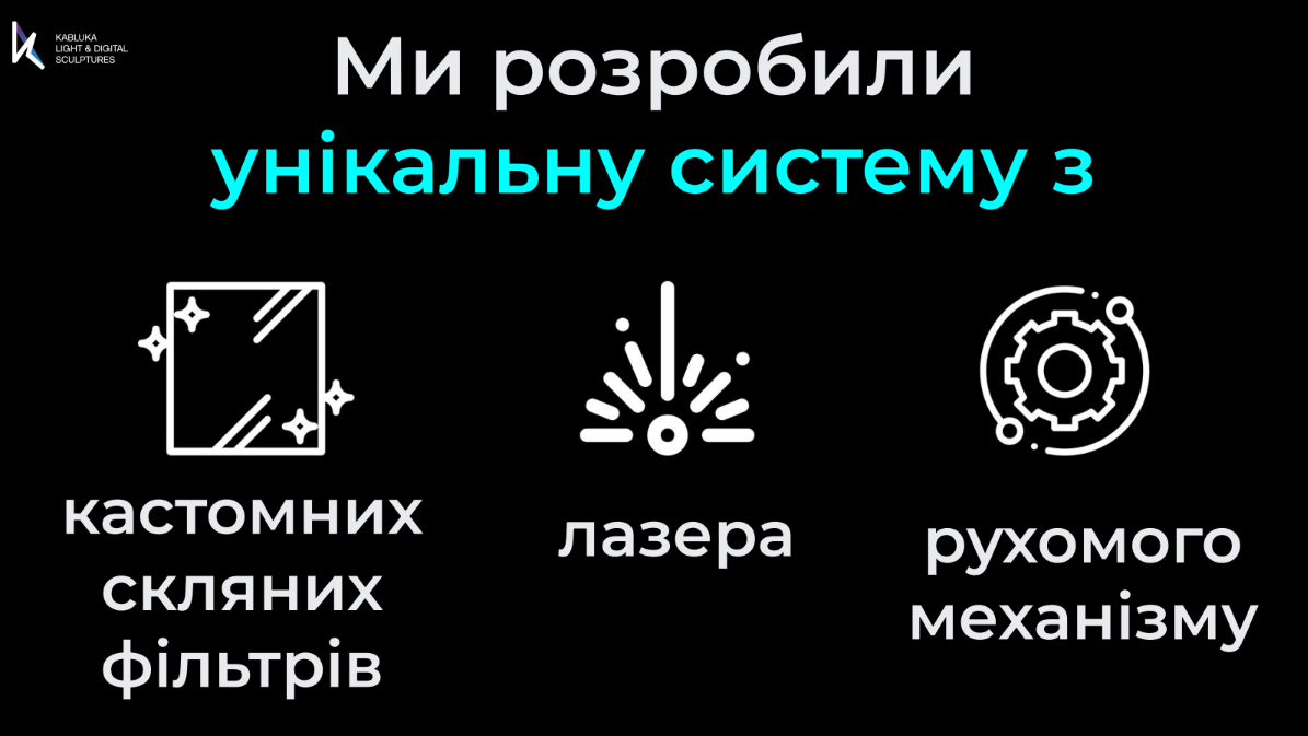 Ми розробили спеціальні кастомні скляні фільтри, які розташували на чітко вивіреній дистанції від каустичного лазера, та отримали нескінченну комбінаторику заломлень світла, надихаючись світловими ефектами в природі. А також спеціальний софт, який керує всією системою.