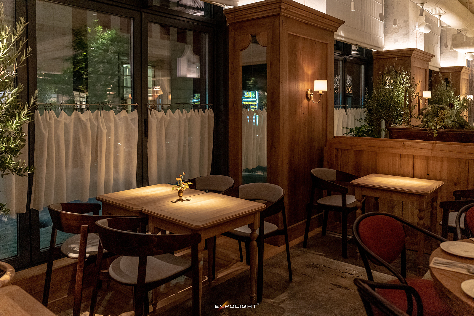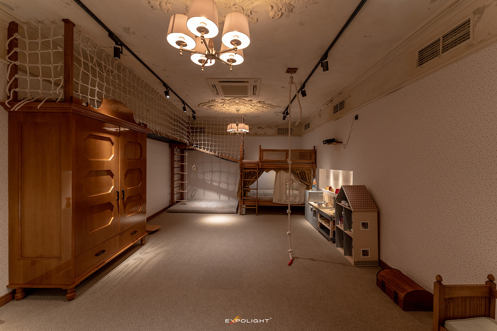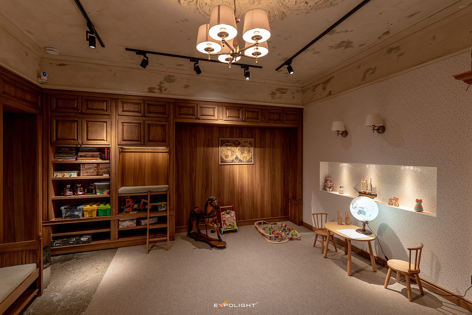 Окрему увагу приділено дитячій кімнаті: тут використано м’яке тепле світло, що створює спокійну та безпечну атмосферу й водночас узгоджується із загальною концепцією ресторану.