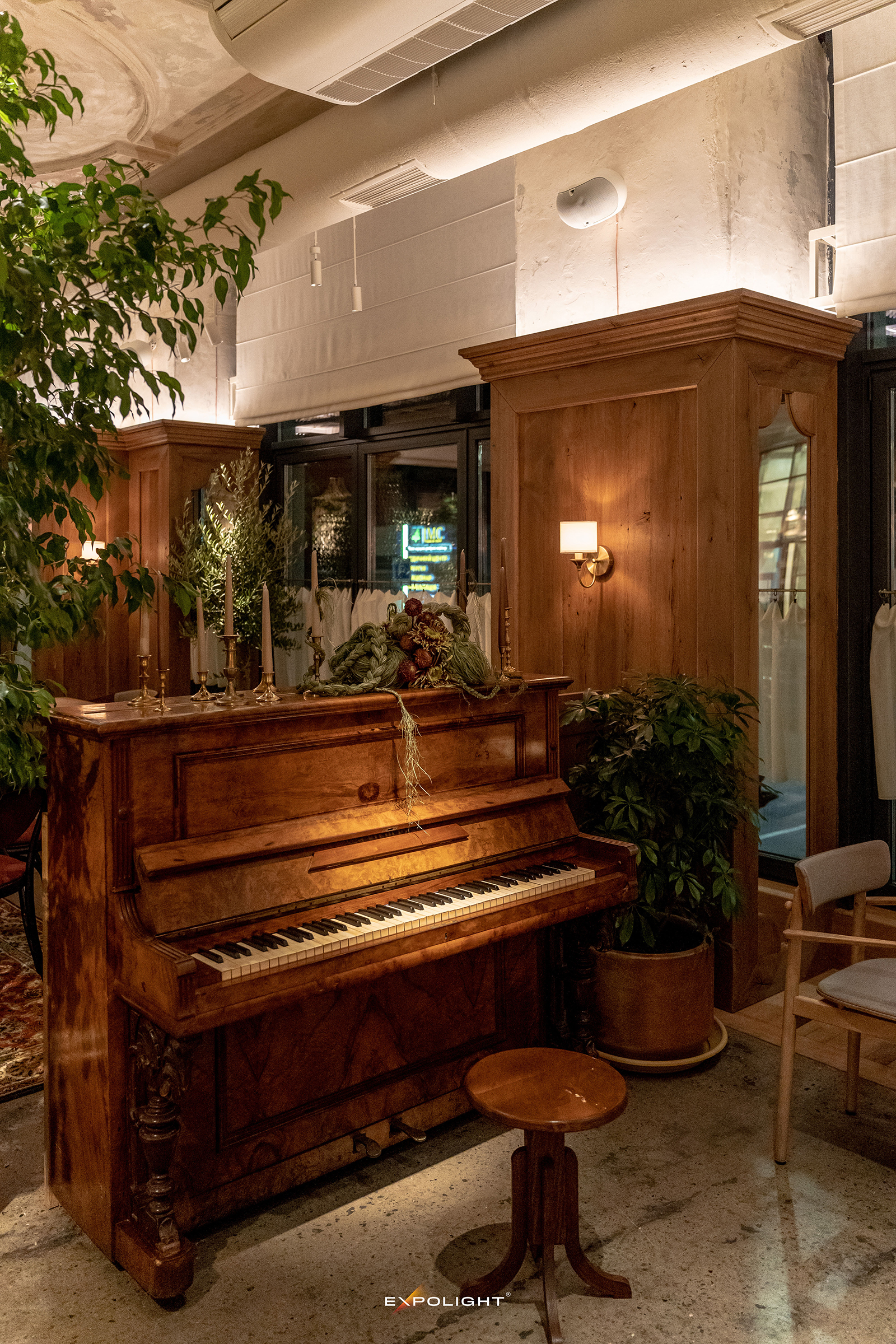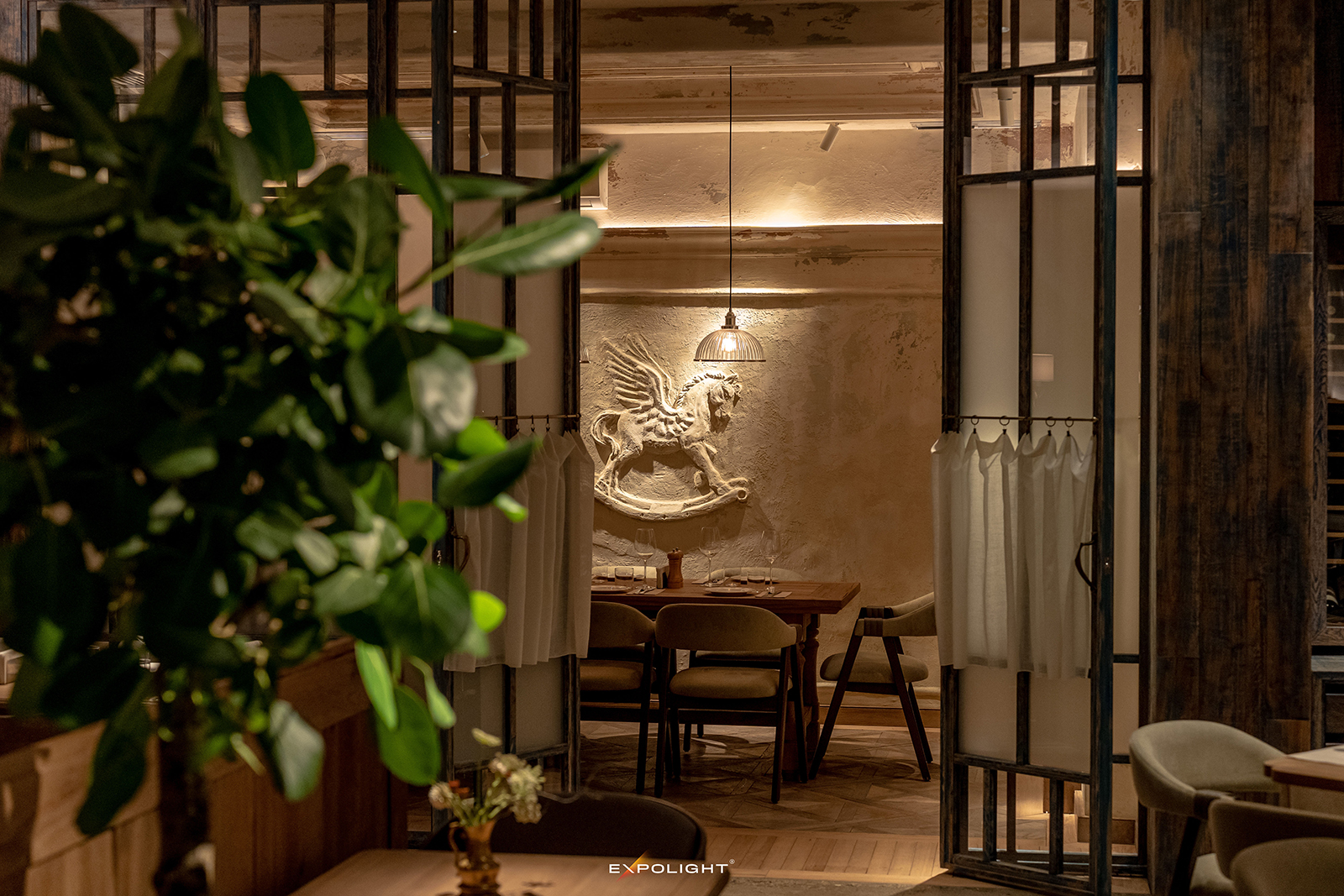 Акцентним елементом інтер’єру став Пегас на стіні — художній образ, який завдяки освітленню отримав виразну присутність у просторі. Для різних періодів доби застосовано біодинамічні сценарії освітлення. Декоративні елементи інтер’єру мають власні світлові акценти, що підкреслюють їхню фактуру та роль у загальній композиції. Так етнічні мотиви поєднуються з сучасними дизайнерськими рішеннями, формуючи багатошаровий простір.