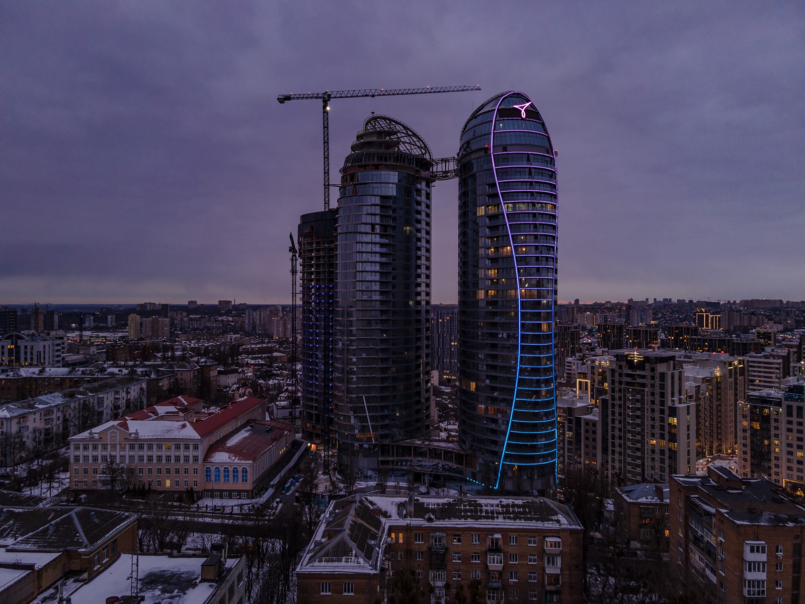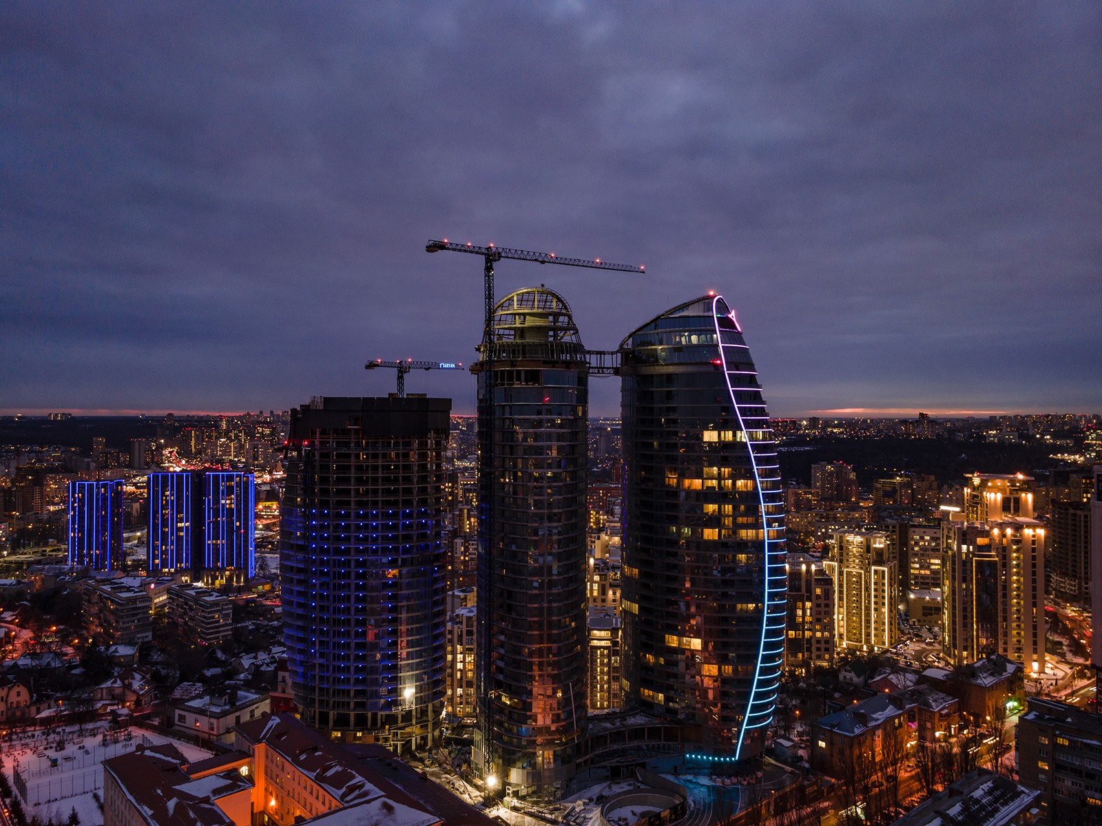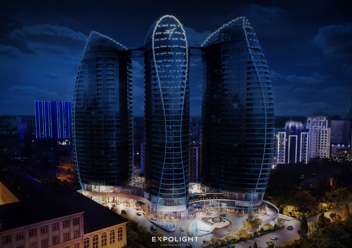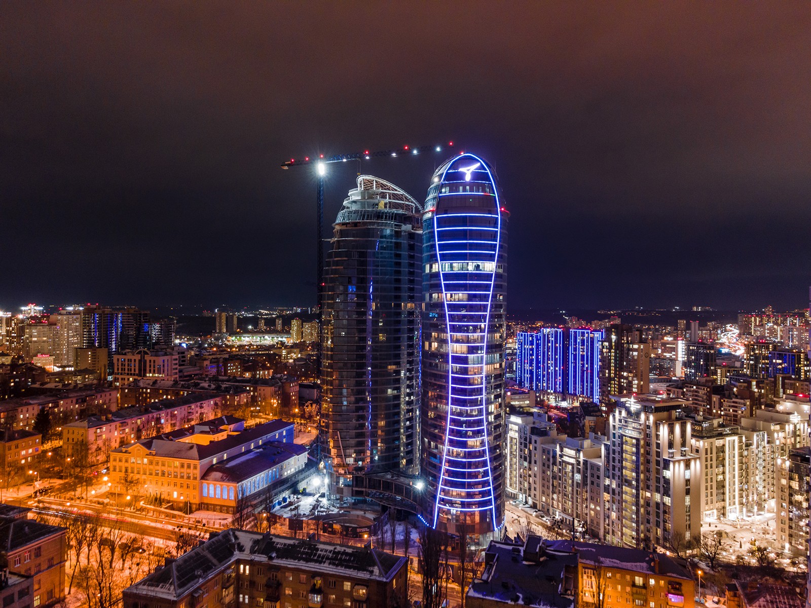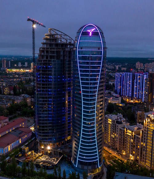 Taryan Towers – суперсучасні вежі майбутнього, дубайська архітектура у самому центрі Києва. Найвідповідальніша локація та біонічні криволінійні форми змусили попрацювати. Для цього проекту не було готових рішень. Ми розробили тут не лише саме освітлення, а й весь конструктив, інтегрований у фасадні конструкції. Це спеціальна криволінійна труба діаметром 500 мм, яка повторює всі вигини фасадів та приховує у собі необхідне обладнання. Конструкція цієї освітлювальної системи зроблена так, щоб світло було не прямим, а відбитим, тобто. джерела світла спрямовані всередину поверхню труби, приховані перфорованим металом, і ми бачимо у результаті м'яке відбите світло. Для досягнення необхідного ефекту глибини, обсягу світіння підбирали спеціальну оптику, проводили безліч пробних включень.
