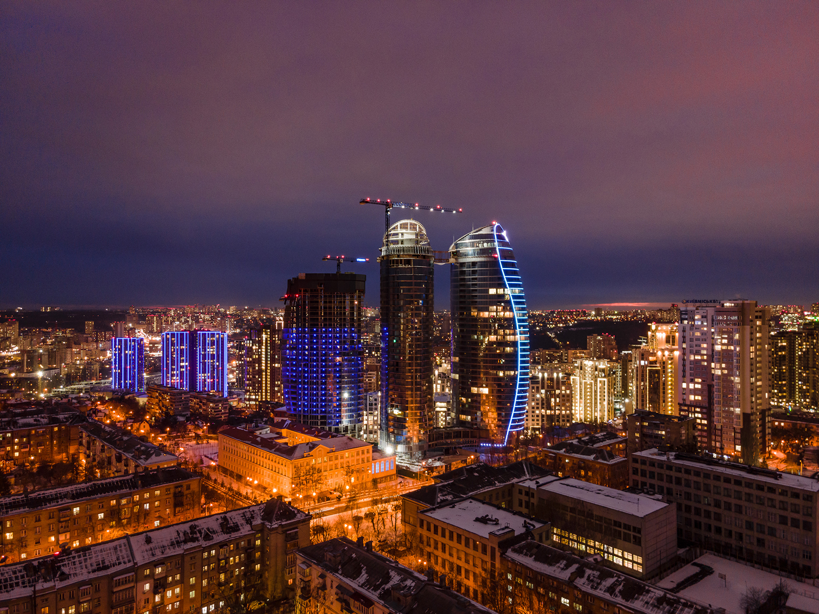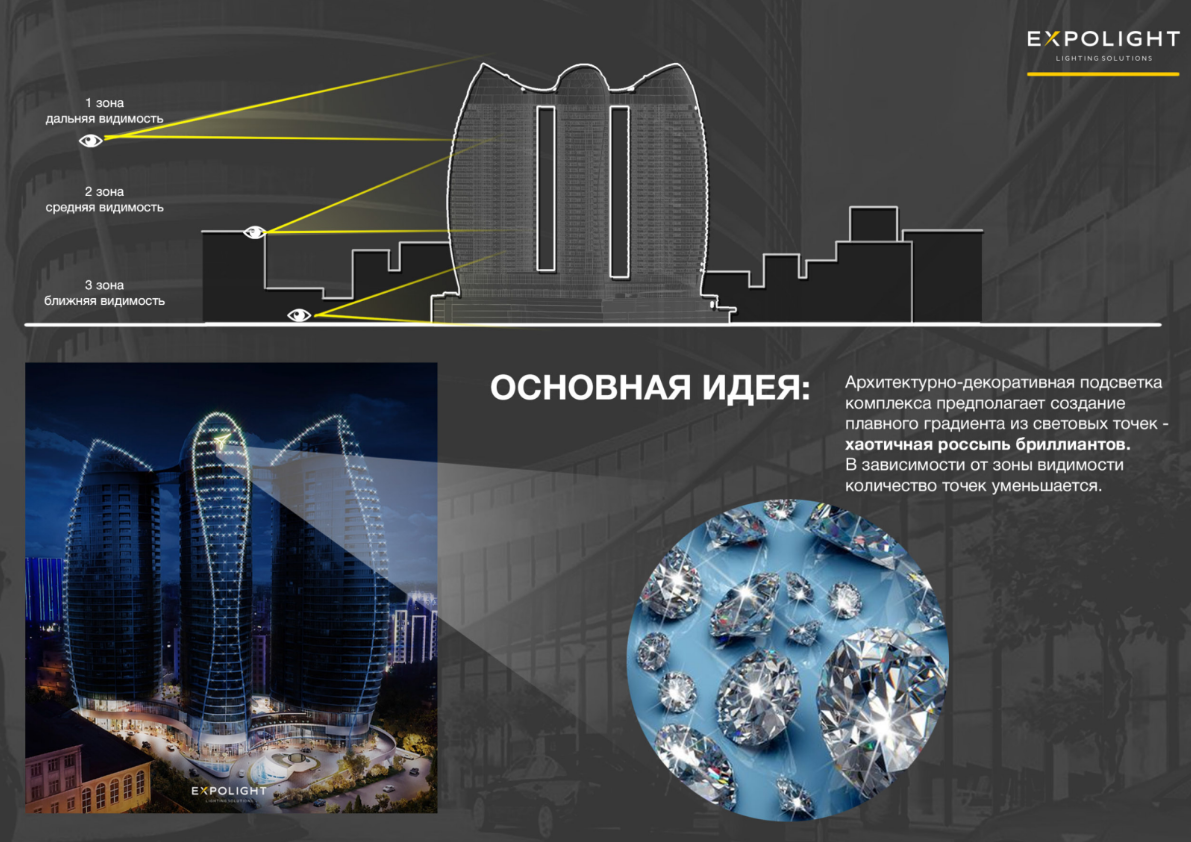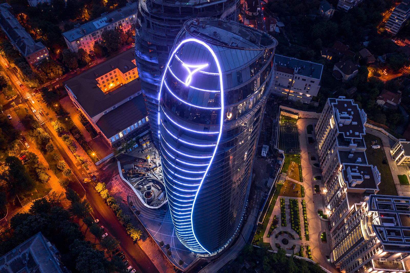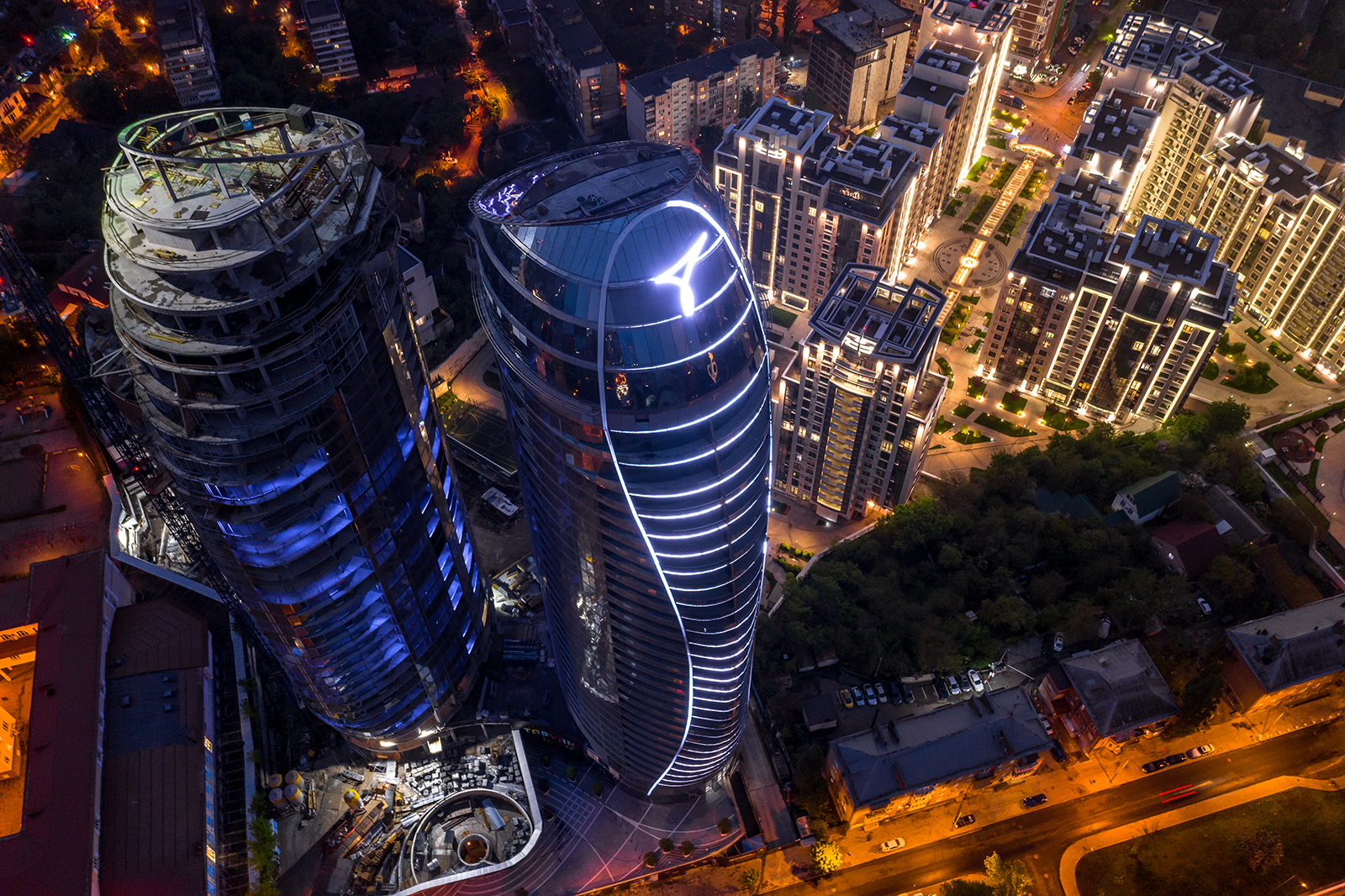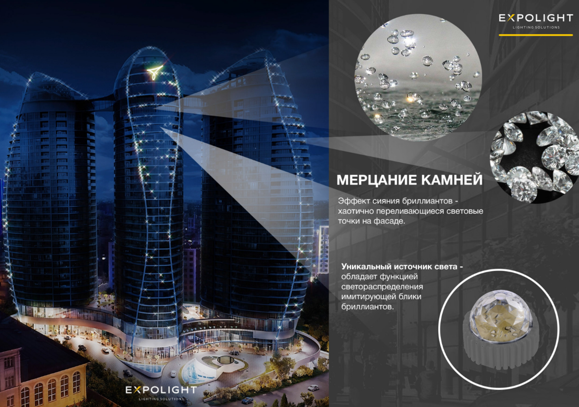 Taryan Towers – суперсучасні вежі майбутнього, дубайська архітектура у самому центрі Києва. Найвідповідальніша локація та біонічні криволінійні форми змусили попрацювати. Для цього проекту не було готових рішень. Ми розробили тут не лише саме освітлення, а й весь конструктив, інтегрований у фасадні конструкції. Це спеціальна криволінійна труба діаметром 500 мм, яка повторює всі вигини фасадів та приховує у собі необхідне обладнання. Конструкція цієї освітлювальної системи зроблена так, щоб світло було не прямим, а відбитим, тобто. джерела світла спрямовані всередину поверхню труби, приховані перфорованим металом, і ми бачимо у результаті м'яке відбите світло. Для досягнення необхідного ефекту глибини, обсягу світіння підбирали спеціальну оптику, проводили безліч пробних включень.