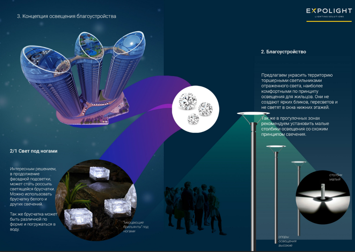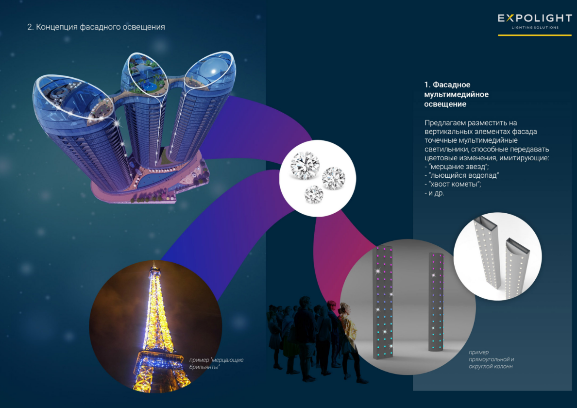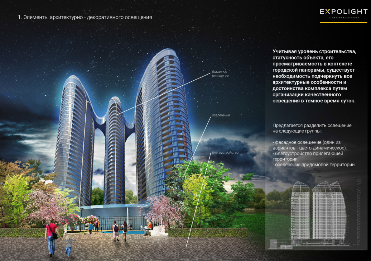 Зараз подсвічена лише перша вежа, надалі всі три вежі та навколишня територія працюватимуть як комплексна система. І всі вони об'єднаються в єдину систему управління, для якої ми розробляємо свій спеціальний софт.