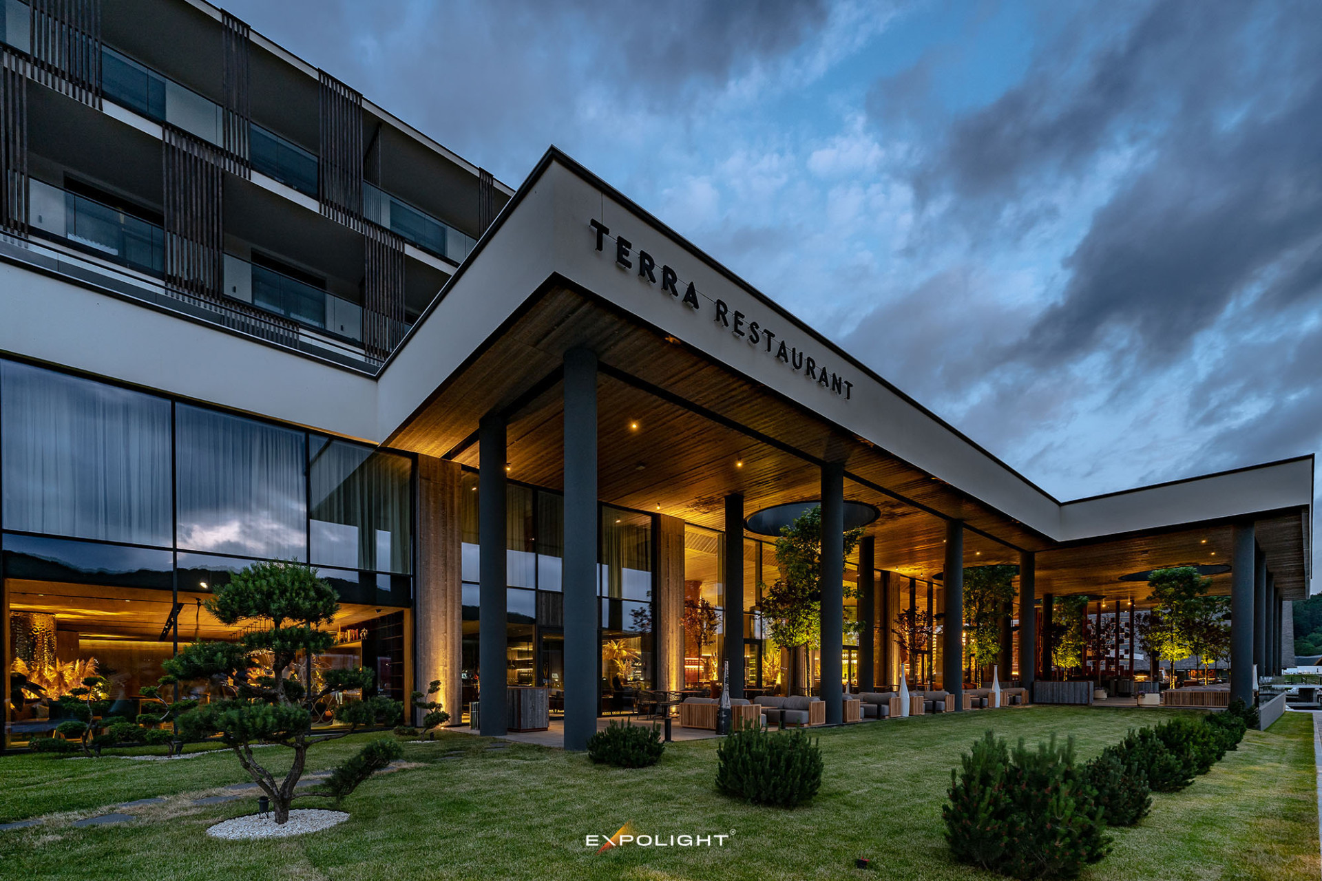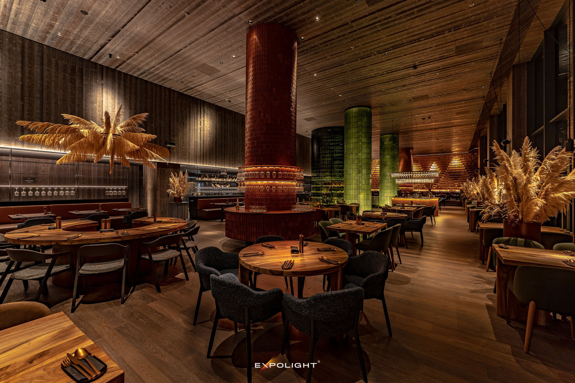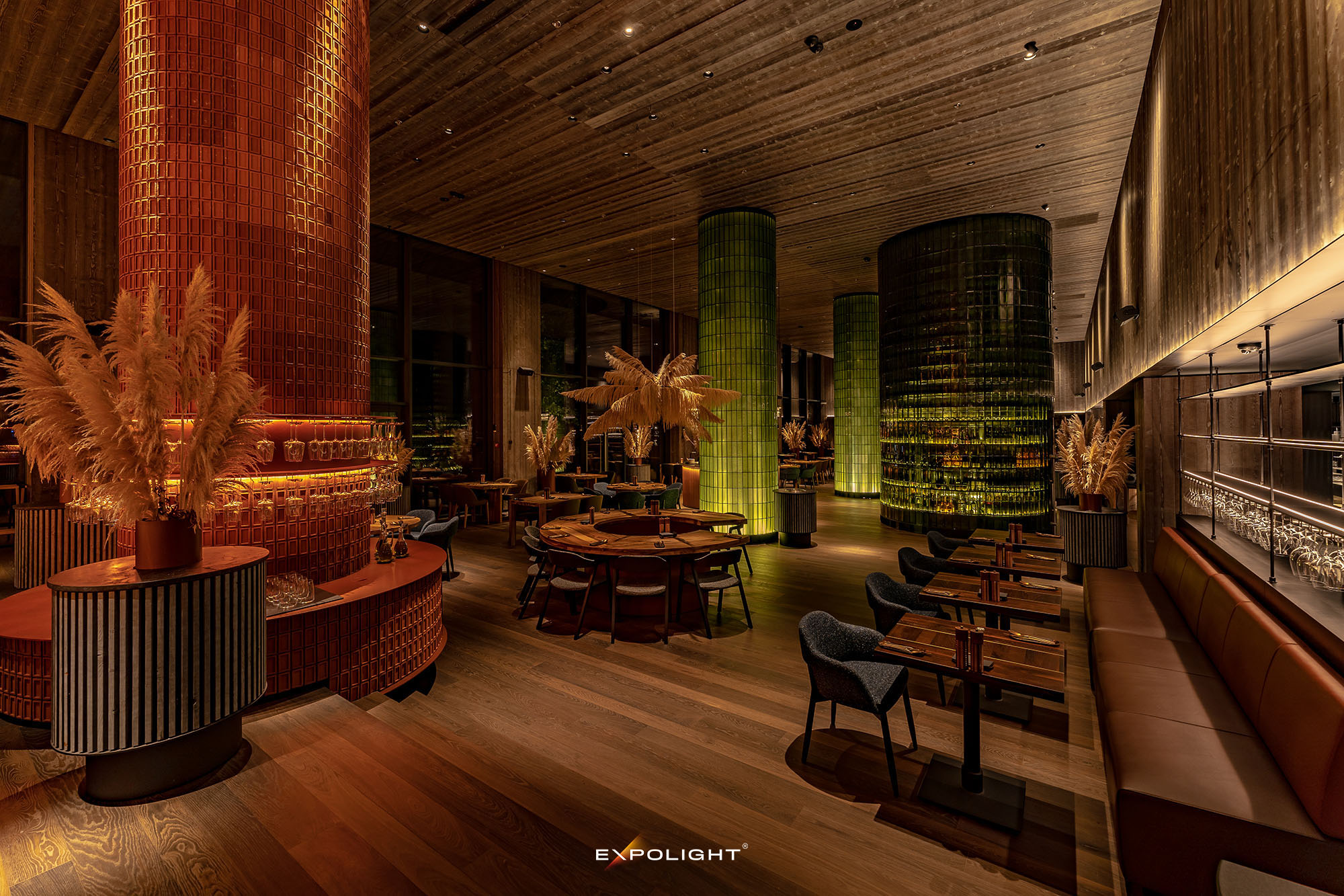 Цей ресторан один із багатьох складових величезного комплексу, де світлом нам пощастило проявити неперевершений дизайн. Працювати з простором TERRA було цікаво та надихаюче. Дизайн інтер'єру багатий на текстурні матеріали - скло, глину, дерево. Ми любимо працювати з ними, бо вони завжди унікальні і світлом можна дуже круто підкреслити та підсилити рельєфність та тактильність матеріалів. Спеціально для цього об’єкту та підсилення унікальності рельєфності ми розробили світильники зі спрямованими супер вузькими променями. Ми розташували їх таким чином, щоб створити ковзне світло та проявити тіні. Окремою цікавою задачею була робота – з бліками, бо в цьому ресторані дуже багато скляних елементів, в тому числі і кастомних.