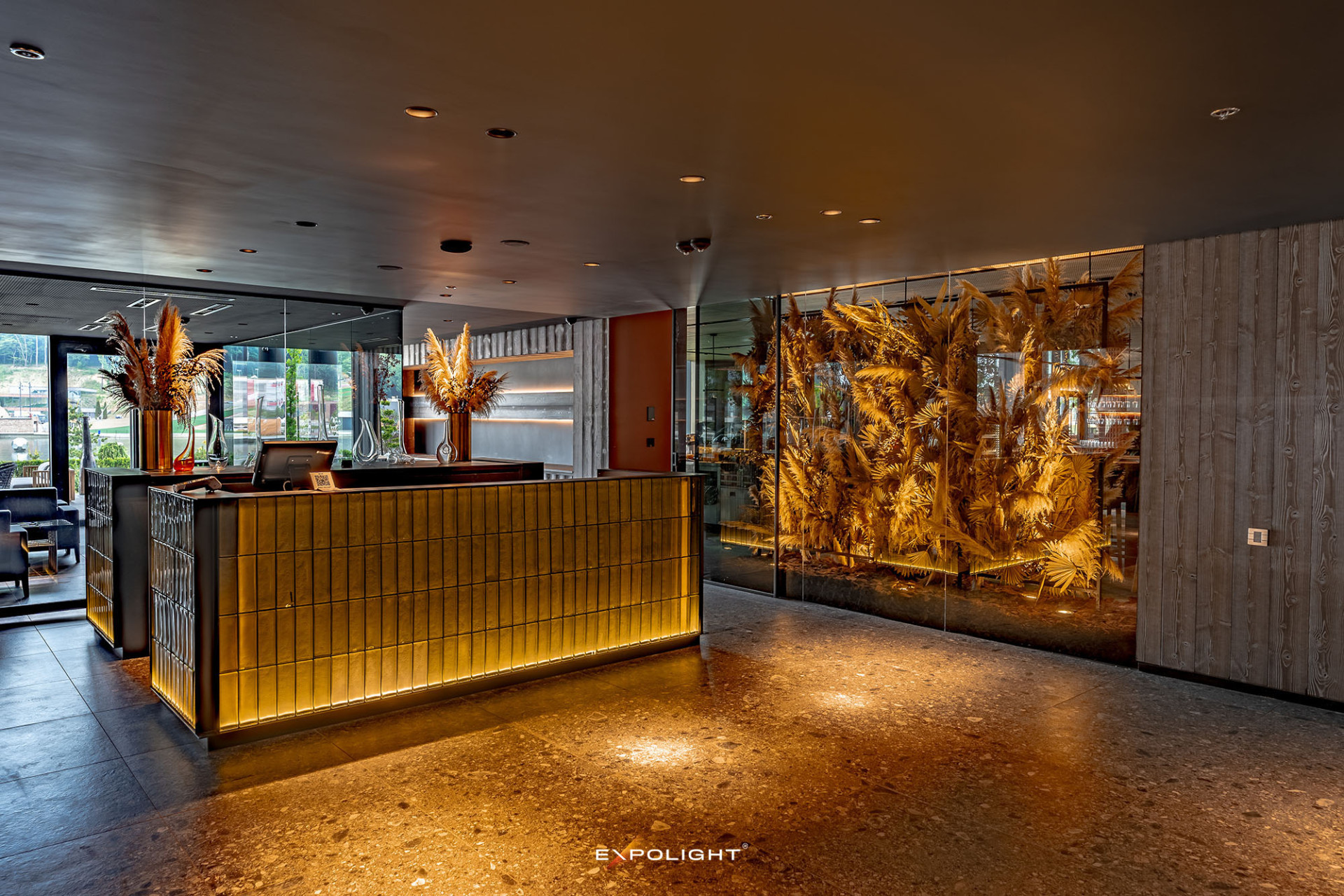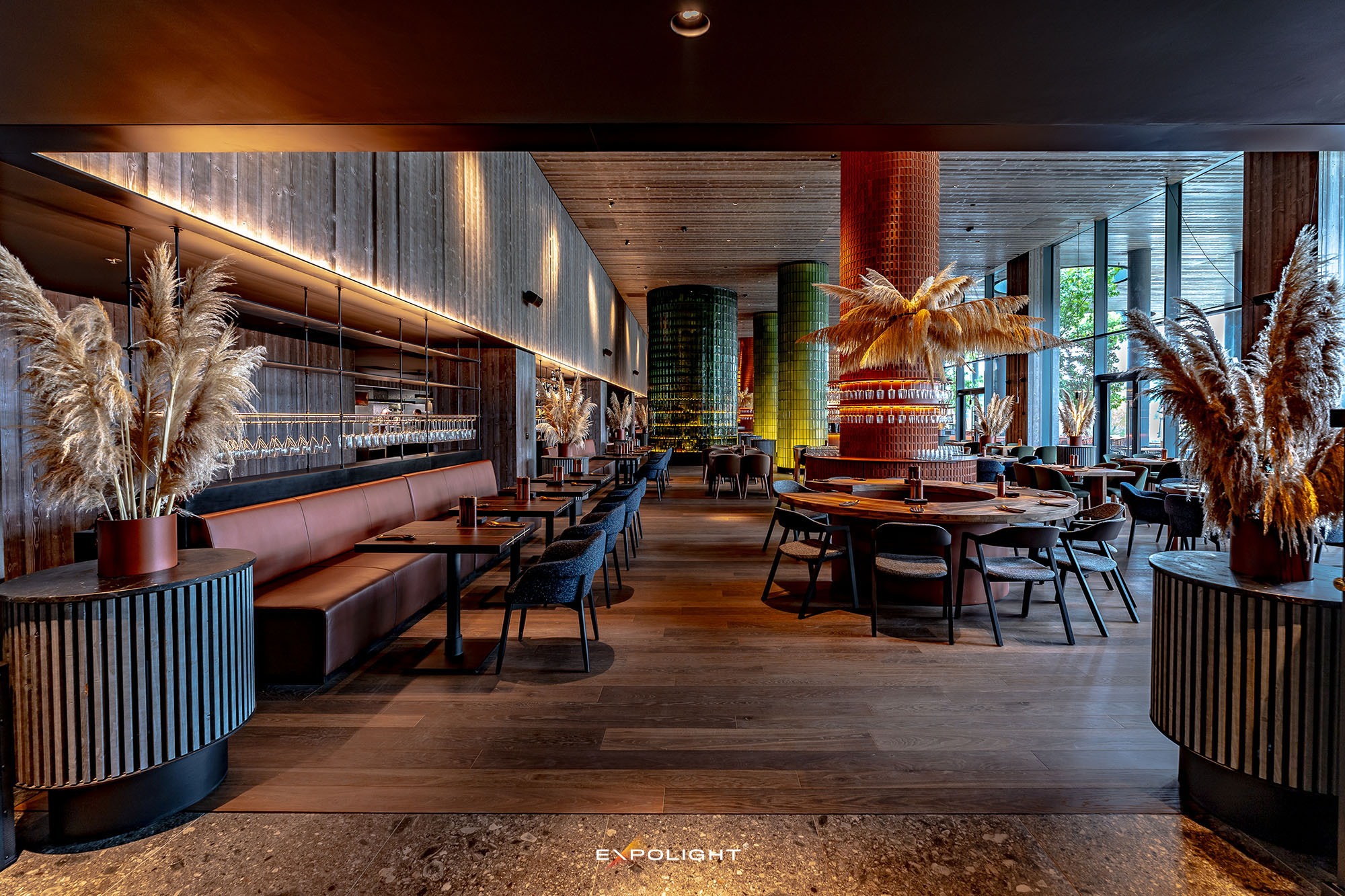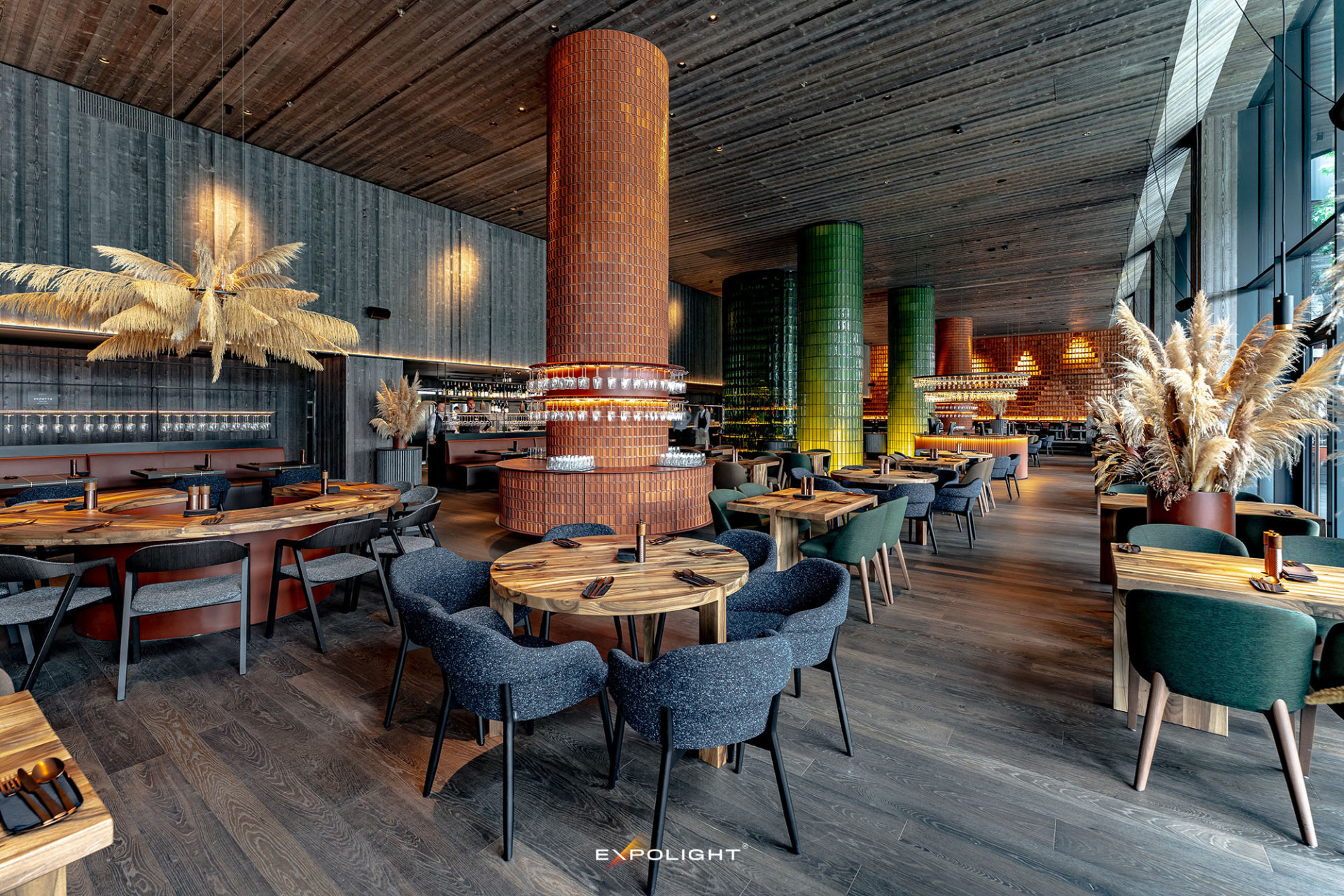 Всі елементи освітлення ми ув'язали в єдину систему управління, яка дозволяє змінювати сценарії, забезпечуючи комфортну світлову атмосферу, що відповідає біоритмам людини і різним режимам. Однією з задач було допомогти закладу трансформуватися зі шведської лінії вранці до топового ресторану ввечері. Чарівним світлом ми радикально змінюємо атмосферу завдяки світловим сценаріям. Зміни сценарію відбуваються автоматично за розкладом, з плавним перетіканням з ранкового режиму до денного, вечірнього та пізньовечірнього.