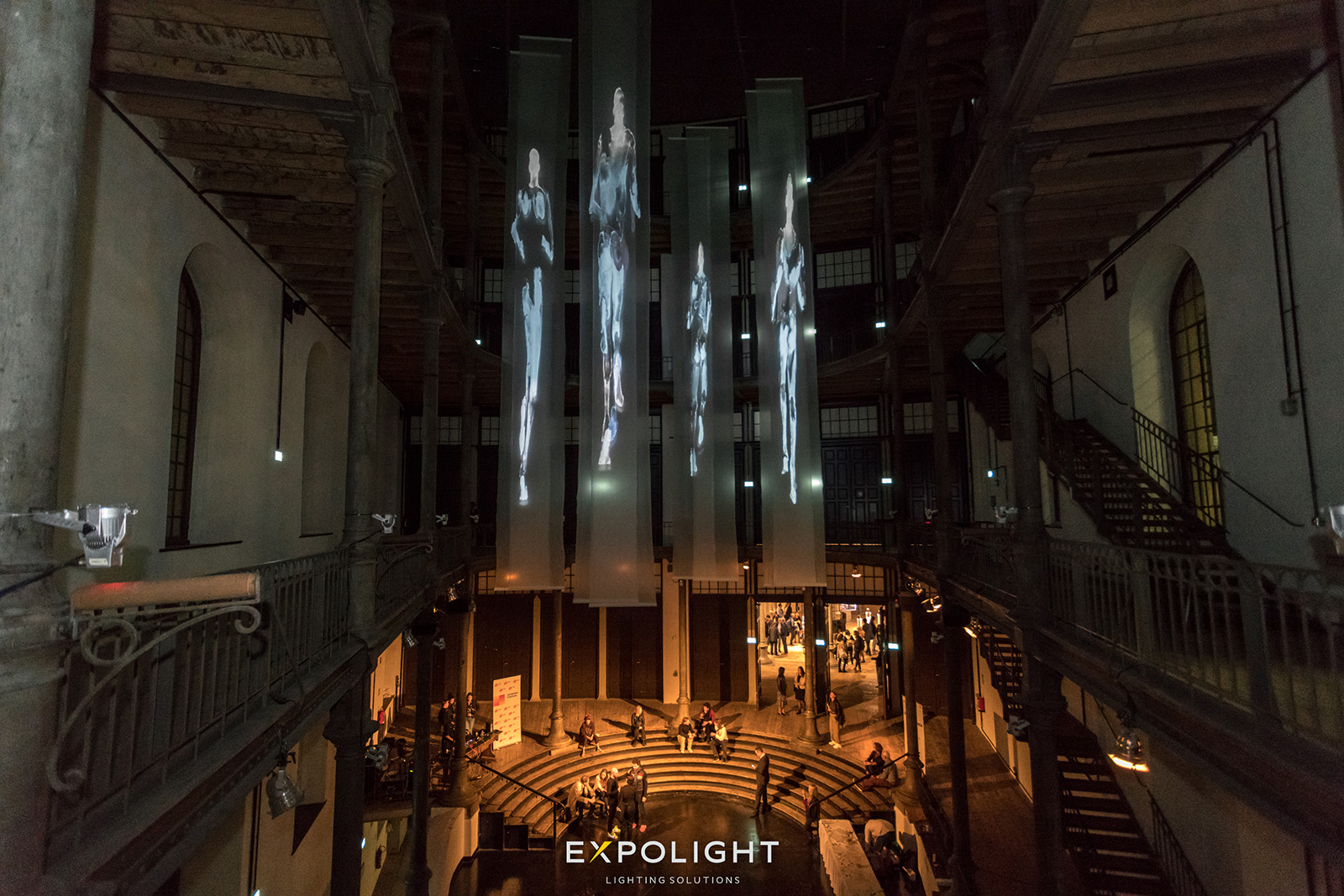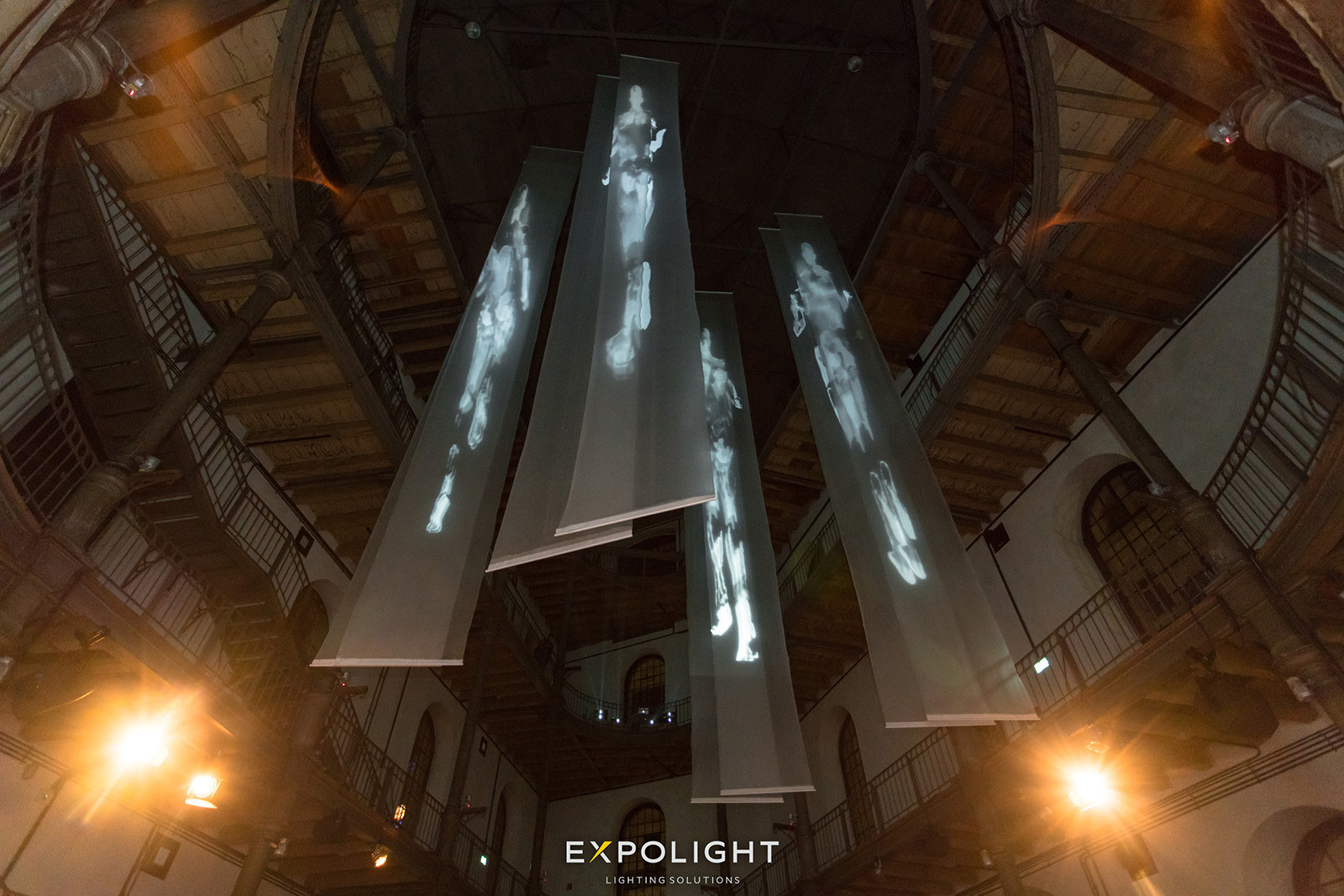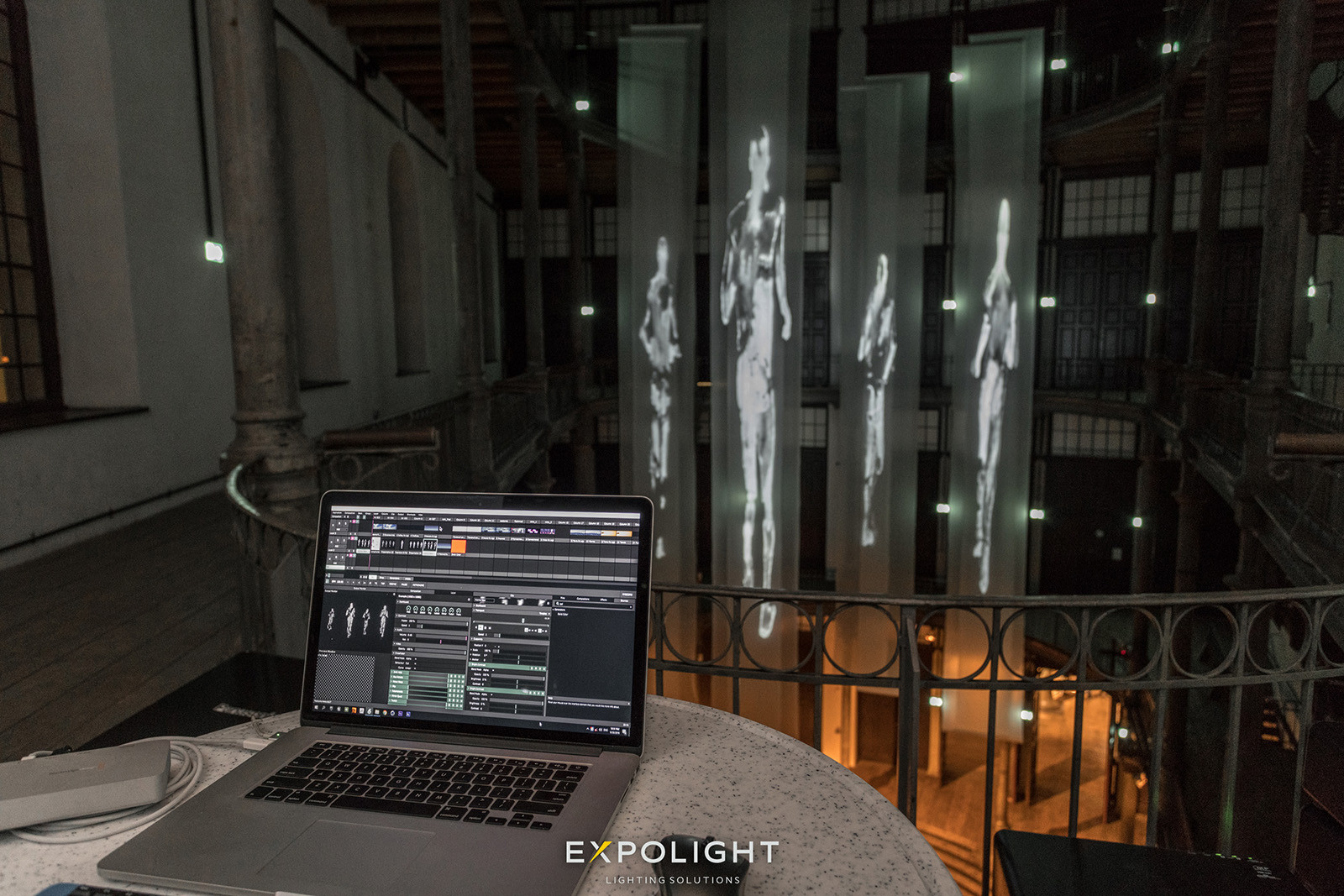 В атріумі в різних площинах та на різній висоті розташували вісім екранів із спеціальної багатошарової плівки висотою 15-16 метрів кожен. На екранах проектували образи фантомів, що біжать, кожен з яких формувався групами по кілька віяло розташованих проекторів, зображення від яких зшивалися в цілісну багатопланову картину.