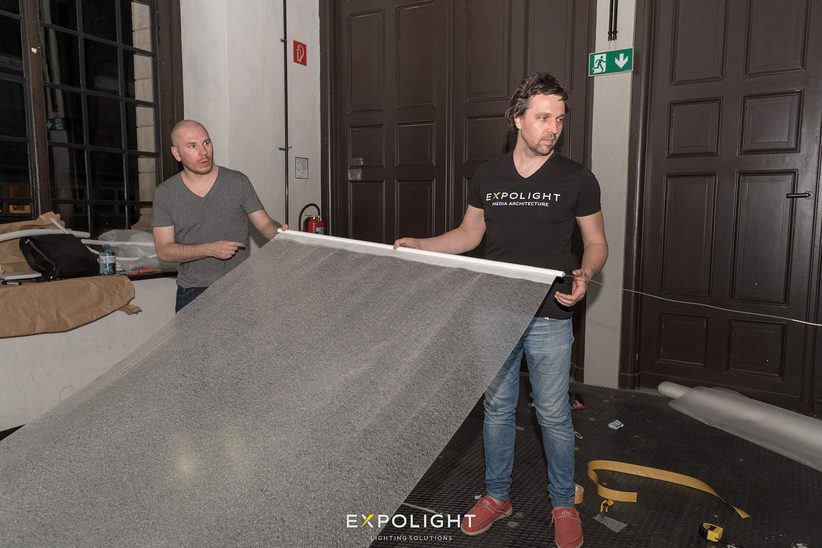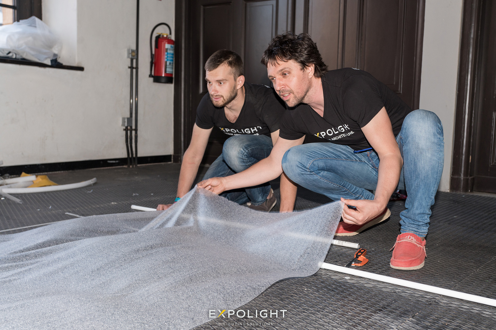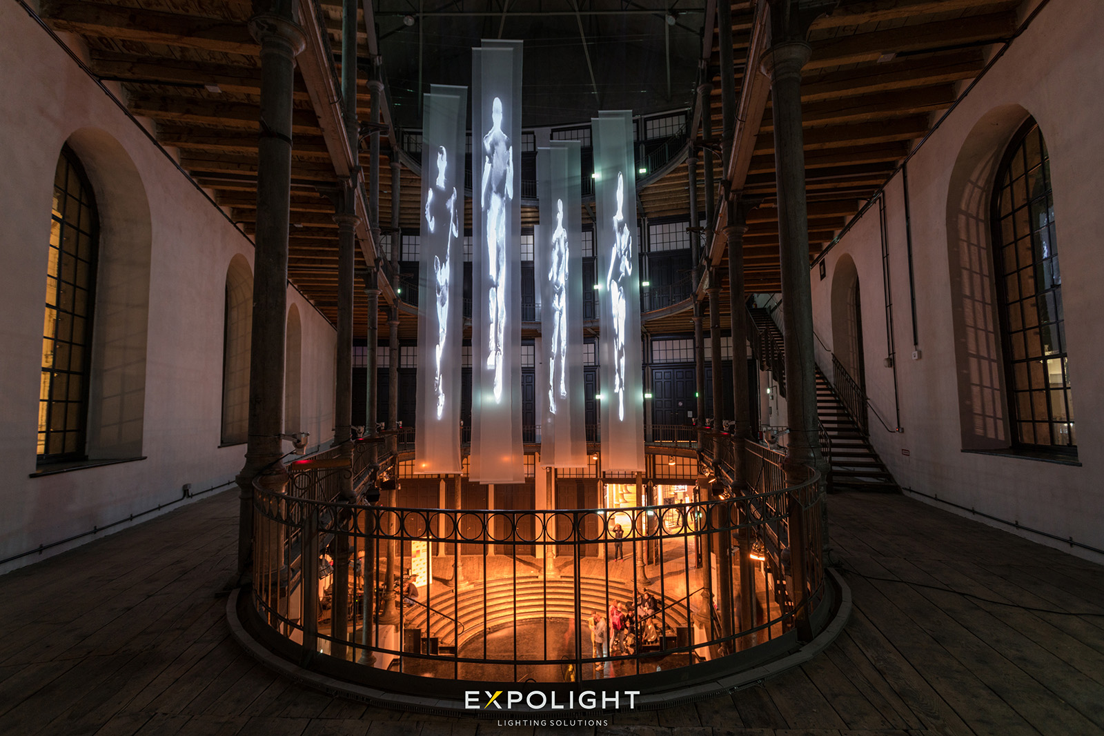 В атріумі в різних площинах та на різній висоті розташували вісім екранів із спеціальної багатошарової плівки висотою 15-16 метрів кожен. На екранах проектували образи фантомів, що біжать, кожен з яких формувався групами по кілька віяло розташованих проекторів, зображення від яких зшивалися в цілісну багатопланову картину.