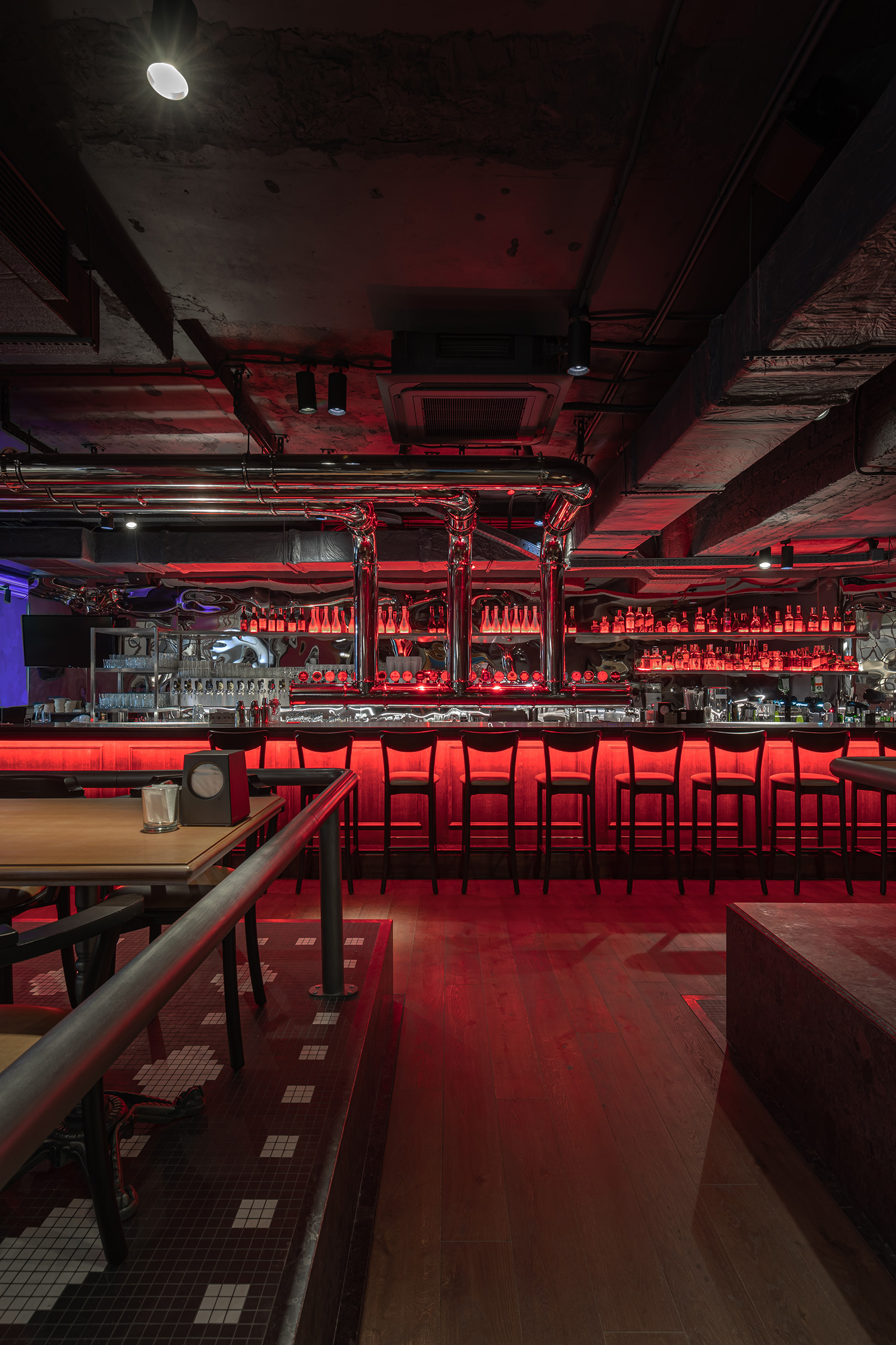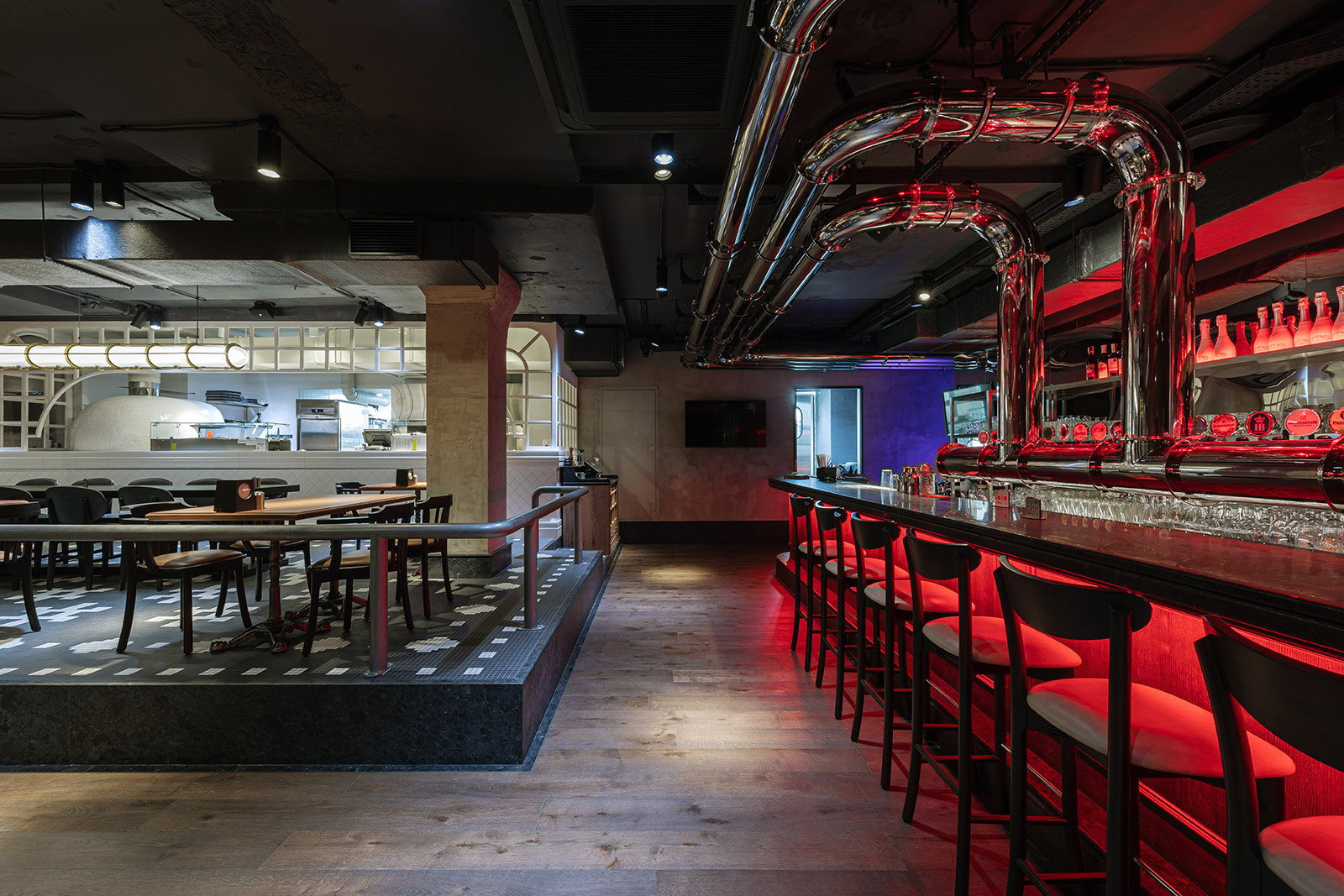 Незвичайним заклад роблять його різнорівневі зали, тільки в один з яких проникає природне сонячне світло. У залах, куди не проникає повноцінне сонячне світло, ми відтворили його за допомогою біодинамічної системи освітлення. Воно змінюється відповідно до часу доби та активності в ресторані: для ланчу та світлого часу доби це м'які та спокійні тони, а для вечірок та перегляду спортивних передач – контрастні та насичені.