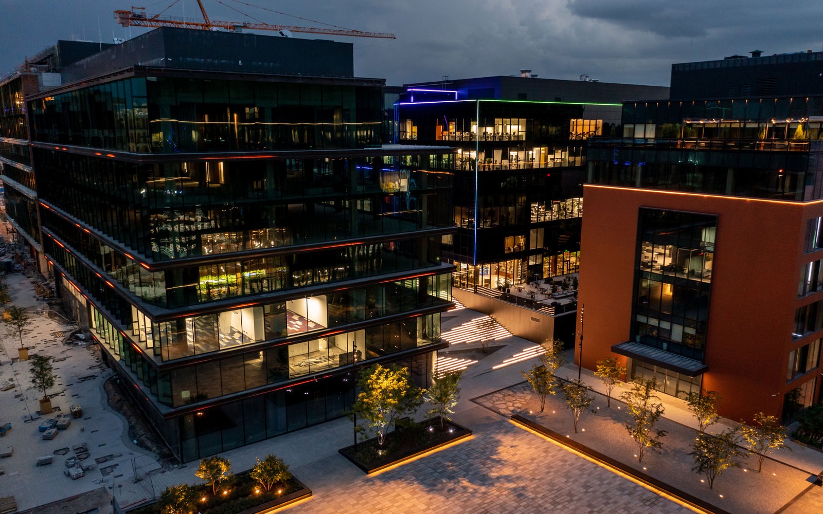 Ми хотіли, щоб ця територія стала частинкою природи в епіцентрі технологій. І ми це зробили! Витончене біодинамічне освітлення без різкого світла, що заливає і м’яко висвітлює зелень, створило ідеальну атмосферу для місяця та зірок, щоб повільно завершити свій робочий вечір.