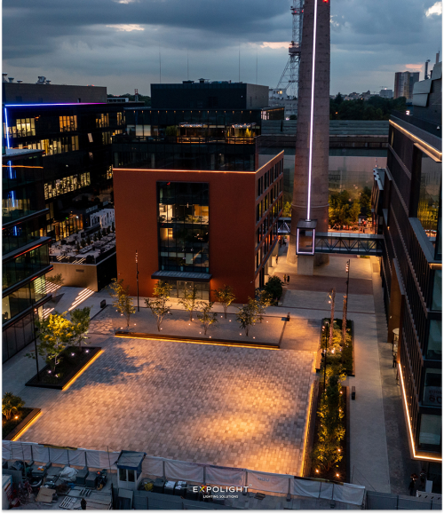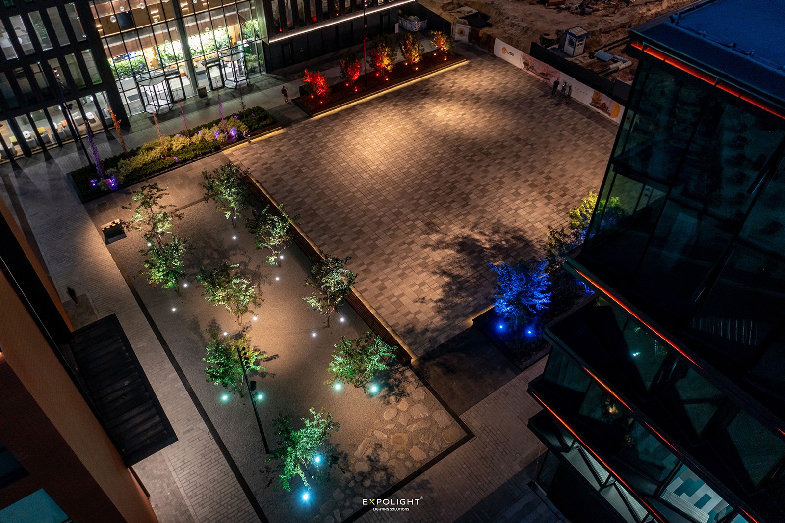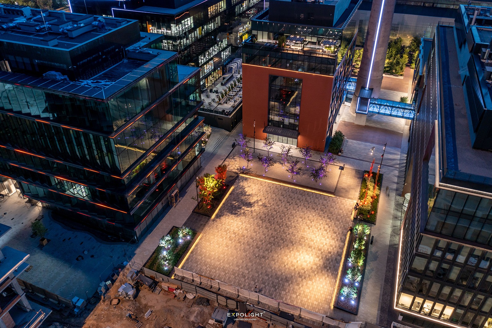 Цей район оточений робочими та житловими містечками. Вдень він використовується для ділових зустрічей і кава-брейків, а ввечері стає місцем для побачень і відпочинку. Ми проаналізували логіку та логістику простору та створили світлове рішення, яке не лише поєднує архітектурні об’єкти, а й створило максимально комфортні умови для роботи та повсякденного відпочинку.