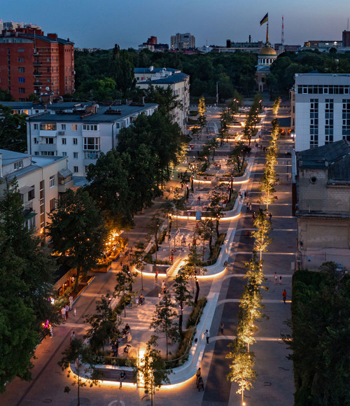 Бульвар в історичній частині міста, розбитий на тераси по рельєфу і завершується колонадою. Архітектурні елементи підсвічені нейтральним білим і теплим прихованим світлом, а також теплим світлом підкреслені дерева.