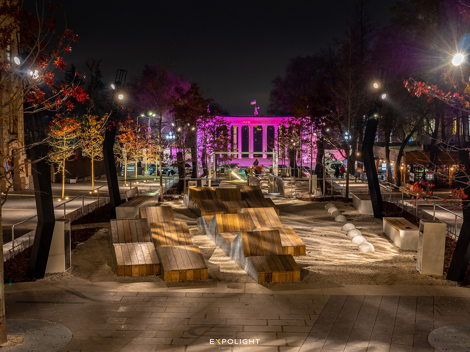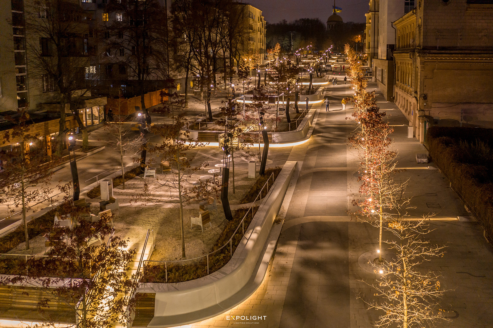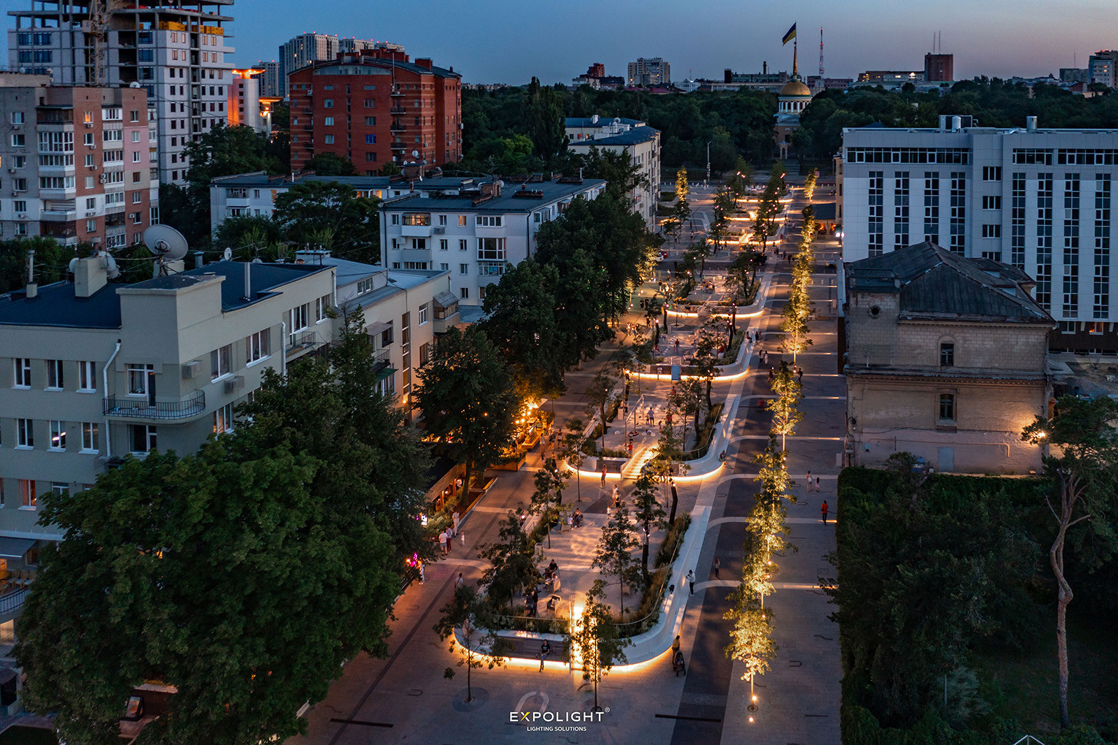 Особлива фішка – трафарети на світильниках, що дають гарні ажурні тіні на пішохідну площу. Колонада за допомогою світла стала ще більш домінантним завершенням бульвару. Світильники, розташовані на опорах навпроти колонади, дають акварельне динамічне підсвічування, що плавно змінює відтінки.