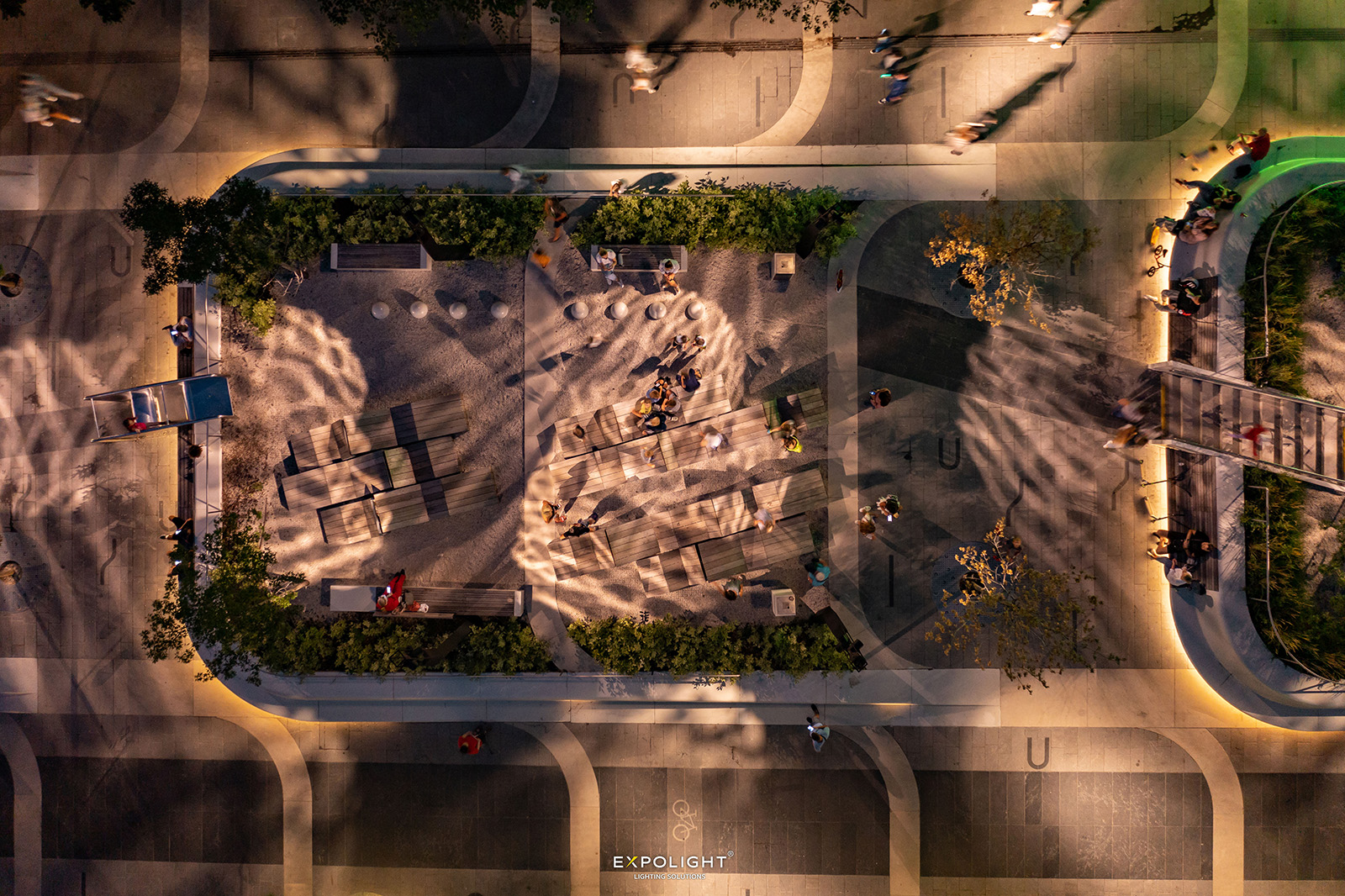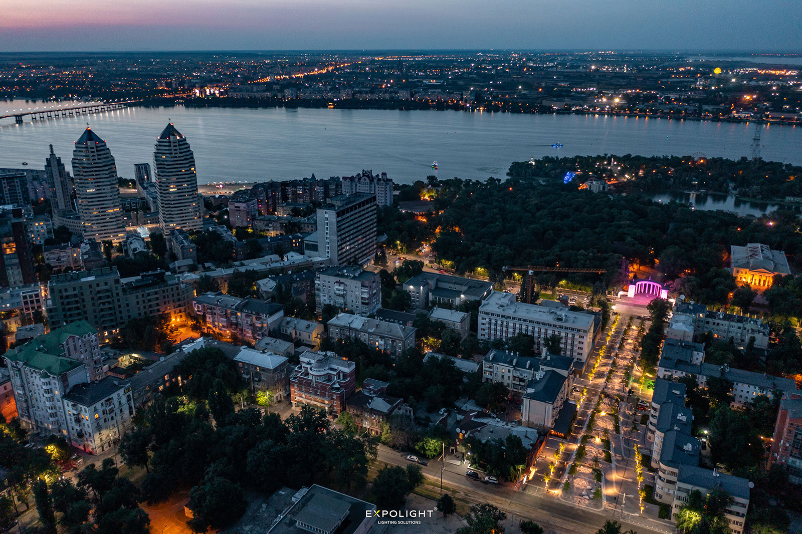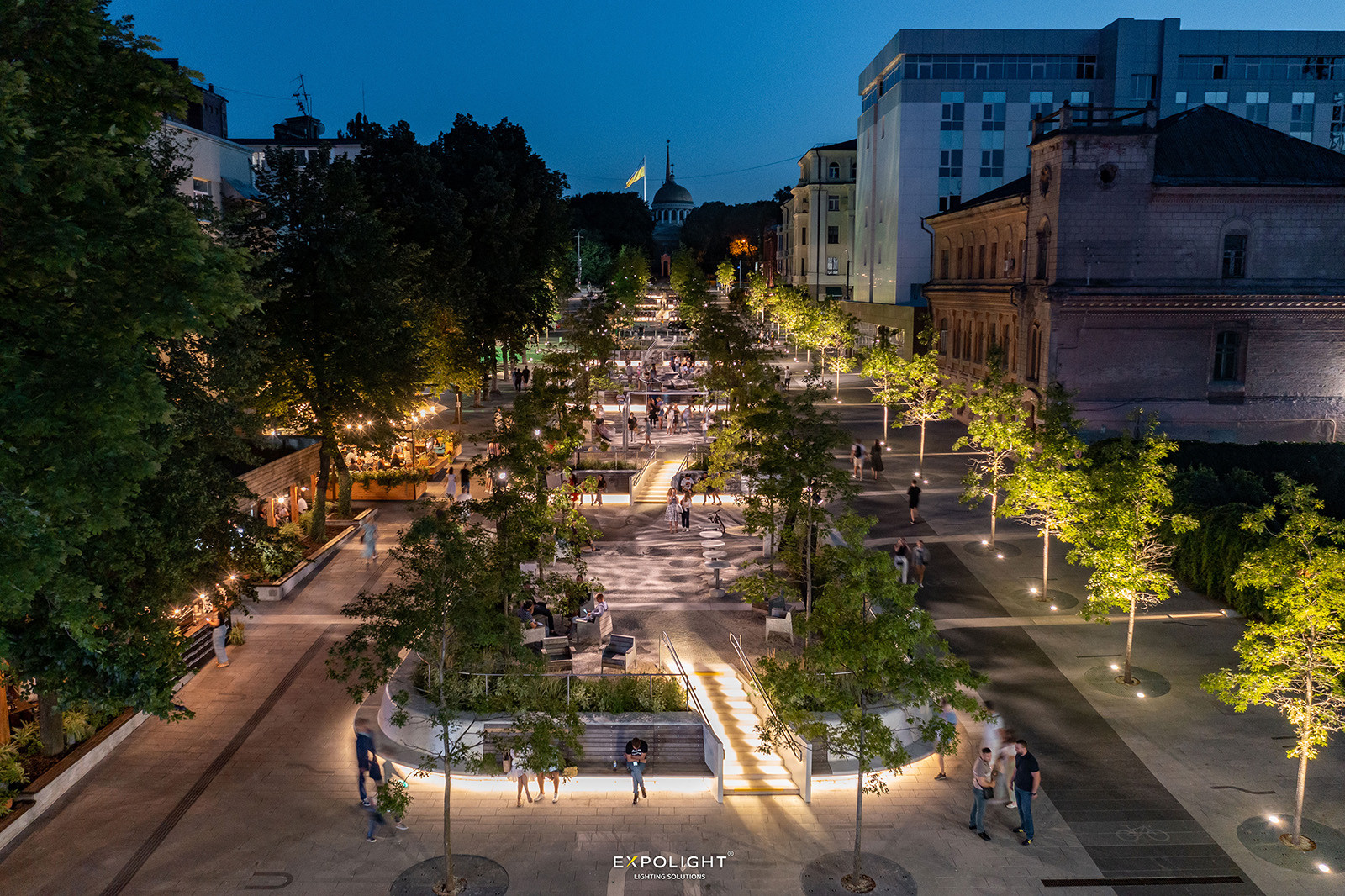 Особлива фішка – трафарети на світильниках, що дають гарні ажурні тіні на пішохідну площу. Колонада за допомогою світла стала ще більш домінантним завершенням бульвару. Світильники, розташовані на опорах навпроти колонади, дають акварельне динамічне підсвічування, що плавно змінює відтінки.