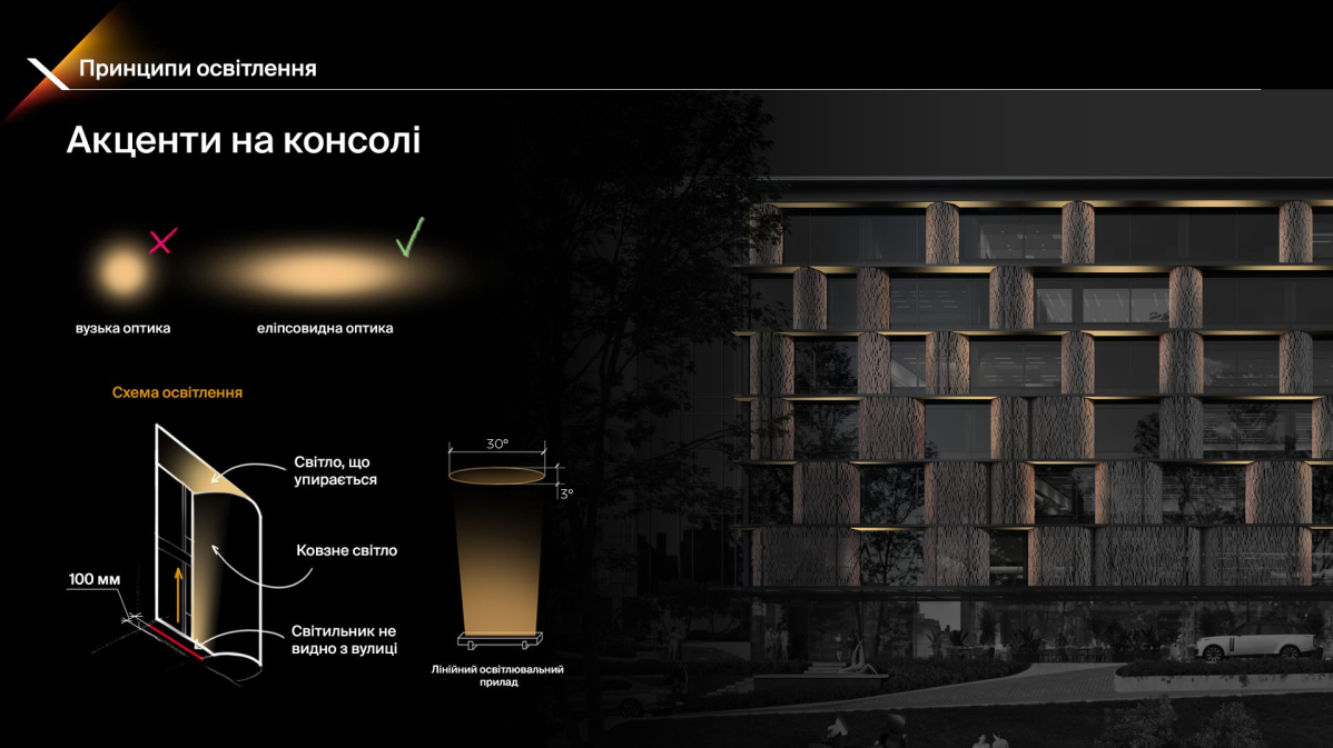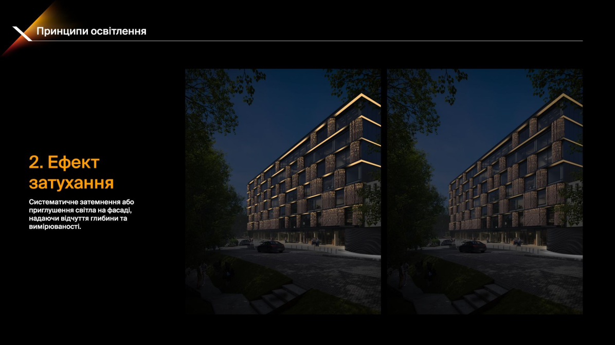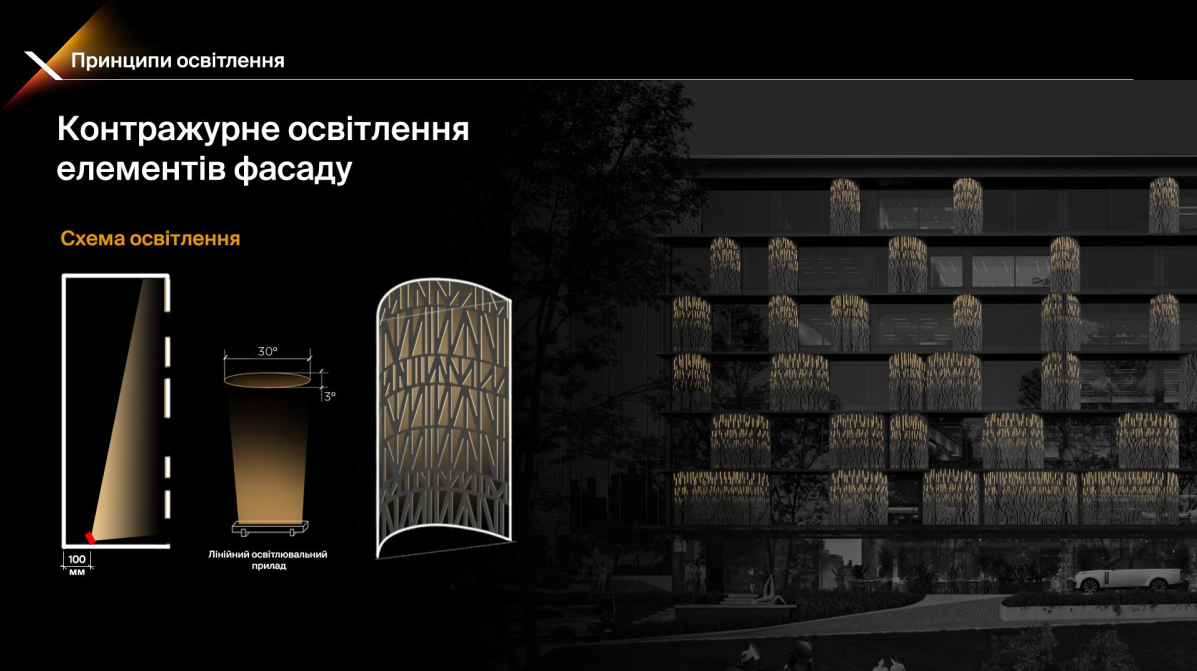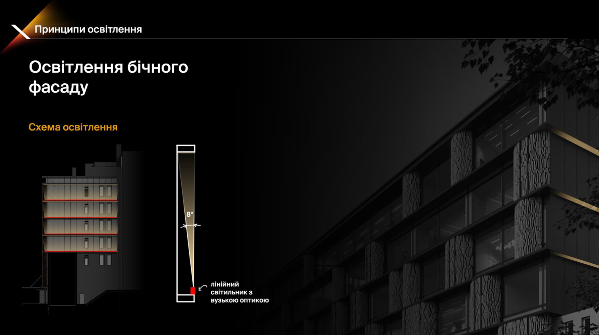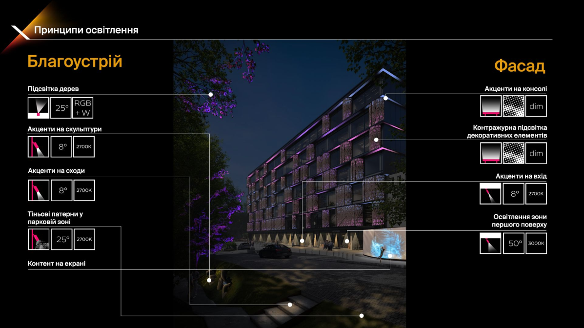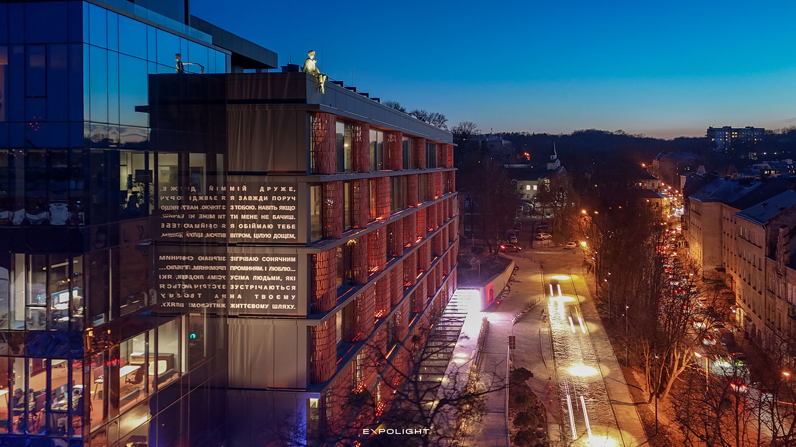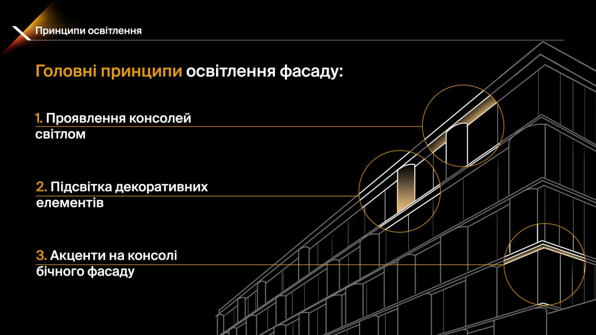 Цей підхід забезпечує не лише виразну контражурну підсвітку та медійні ефекти, а й акцентує окремі архітектурні елементи, додаючи інтерактивності й нових сенсів у сприйняття будівлі.