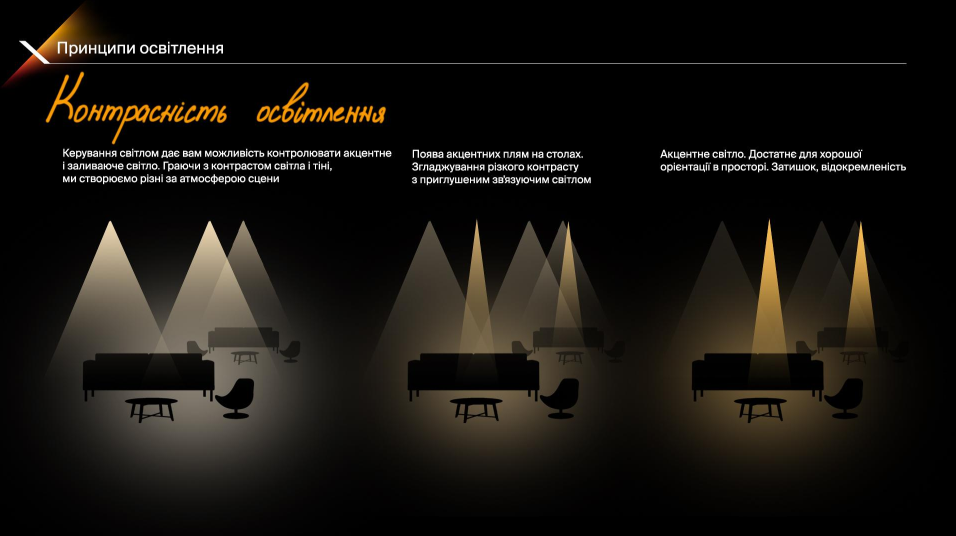 - Інтегровані медійно-світлові інсталяції, які поєднують різні функціональні зони у візуально-комунікаційний простір;