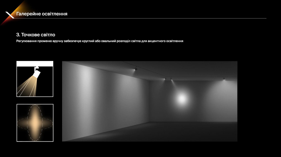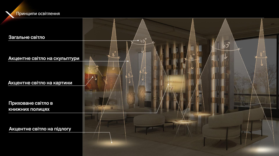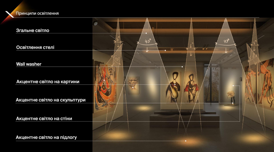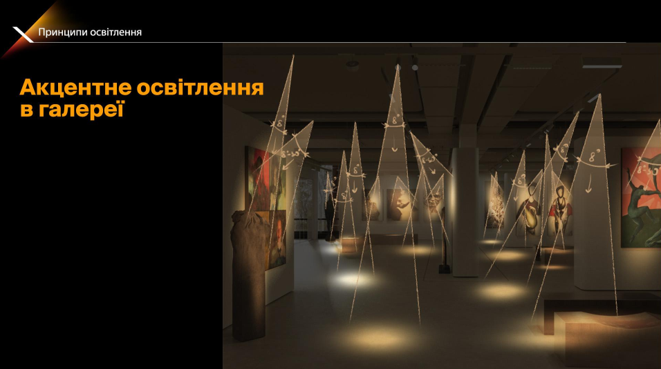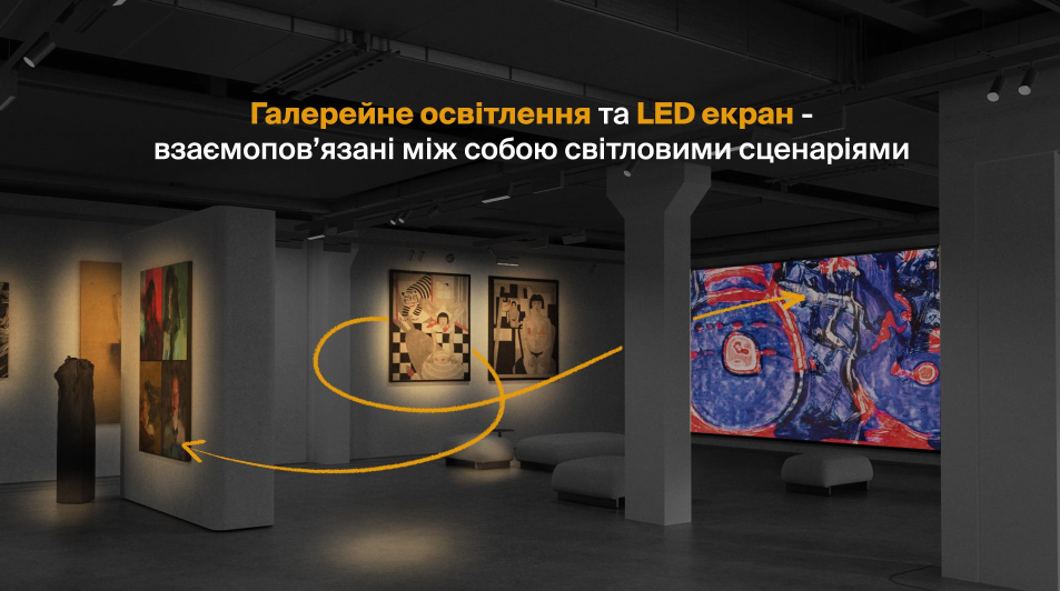 Центральною ідеєю стало створення інтелектуальної системи освітлення, яка не тільки підтримує естетику простору, а й сприяє комфорту відвідувачів. У просторі галереї впроваджено біодинамічне освітлення, що автоматично змінює колірну температуру та інтенсивність протягом доби, імітуючи природний ритм сонячного світла.
